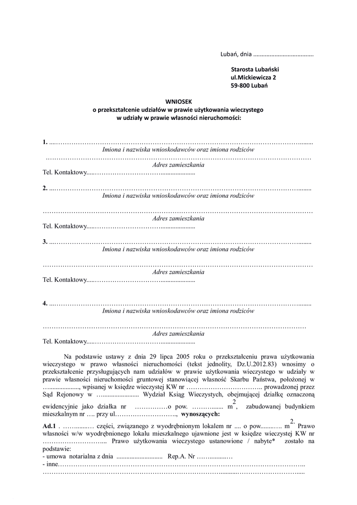 Lubań, dnia ..................................... Starosta Lubański ul.Mickiewicza 2 59-800 Lubań WNIOSEK o przekształcenie udziałów w prawie użytkowania wieczystego w udziały w prawie własności nieruchomości: 1. ....…………………………………………………………………………………………………........ Imiona i nazwiska wnioskodawców oraz imiona rodziców .………………………………………………………………………………………………………… Adres zamieszkania Tel. Kontaktowy.....…………………………..................... 2. ...…………………………………………………………………………………………………........ Imiona i nazwiska wnioskodawców oraz imiona rodziców …………………………………………………………………………………………………………… Adres zamieszkania Tel. Kontaktowy.....…………………………..................... 3. ...…………………………………………………………………………………………………........ Imiona i nazwiska wnioskodawców oraz imiona rodziców …………………………………………………………………………………………………………… Adres zamieszkania Tel. Kontaktowy.....…………………………..................... 4. ...…………………………………………………………………………………………………........ Imiona i nazwiska wnioskodawców oraz imiona rodziców ………………………………………………………………………………………………………… Adres zamieszkania Tel. Kontaktowy.....…………………………..................... Na podstawie ustawy z dnia 29 lipca 2005 roku o przekształceniu prawa użytkowania wieczystego w prawo własności nieruchomości (tekst jednolity, Dz.U.2012.83) wnosimy o przekształcenie przysługujących nam udziałów w prawie użytkowania wieczystego w udziały w prawie własności nieruchomości gruntowej stanowiącej własność Skarbu Państwa, położonej w ….................., wpisanej w księdze wieczystej KW nr …………………………….. prowadzonej przez Sąd Rejonowy w …...................... Wydział Ksiąg Wieczystych, obejmującej działkę oznaczoną 2 ewidencyjnie jako działka nr ……………o pow. ………....... m , zabudowanej budynkiem mieszkalnym nr …. przy ul………………………., wynoszących: 2. Ad.1 . …….......… części, związanego z wyodrębnionym lokalem nr .... o pow........…. m Prawo własności w/w wyodrębnionego lokalu mieszkalnego ujawnione jest w księdze wieczystej KW nr ………………………... Prawo użytkowania wieczystego ustanowione / nabyte* zostało na podstawie: - umowa notarialna z dnia ............................ Rep.A. Nr ……..........… - inne………………………………………………………………………………………………….. ………………………………………………………………………..........………………………..... 2 Ad.2 . …......….… części, związanego z wyodrębnionym lokalem nr .... o pow.…....... m . Prawo własności w/w wyodrębnionego lokalu mieszkalnego ujawnione jest w księdze wieczystej KW nr ………………………... Prawo użytkowania wieczystego ustanowione / nabyte* zostało na podstawie: - umowa notarialna z dnia ............................ Rep.A. Nr …….....… - inne………………………………………………………………………………………………….. ……………………………………………………………………………………………..........…..... 2 Ad.3 . …….......… części, związanego z wyodrębnionym lokalem nr .... o pow.…....... m . Prawo własności w/w wyodrębnionego lokalu mieszkalnego ujawnione jest w księdze wieczystej KW nr ………………………... Prawo użytkowania wieczystego ustanowione / nabyte* zostało na podstawie: - umowa notarialna z dnia ............................ Rep.A. Nr …….....… - inne………………………………………………………………………………………………….. ……………………………………………………………………………………………......... 2 Ad.4 . …….......… części, związanego z wyodrębnionym lokalem nr .... o pow.......…. m . Prawo własności w/w wyodrębnionego lokalu mieszkalnego ujawnione jest w księdze wieczystej KW nr ………………………... Prawo użytkowania wieczystego ustanowione / nabyte* zostało na podstawie: - umowa notarialna z dnia ............................ Rep.A. Nr …....…… - inne………………………………………………………………………………………………….. …………………………………………………………………………………………..........……..... Jednocześnie oświadczamy, że podane dane są zgodne z prawdą oraz że jesteśmy świadomi odpowiedzialności karnej za składanie fałszywych zeznań – zgodnie z art. 233 §1 ustawy z dnia 6 czerwca 1997r.Kodeks karny (Dz.U. Nr 88, poz. 553 z późn. zm.), Ad.1.……..................................................……………………………………………………………. własnoręczny podpis wnioskodawcy/ów Ad.2 ……..................................................……………………………………………………………. własnoręczny podpis wnioskodawcy/ów Ad.3……..................................................……………………………………………………………. własnoręczny podpis wnioskodawcy/ów Ad.4……..................................................……………………………………………………………. włas