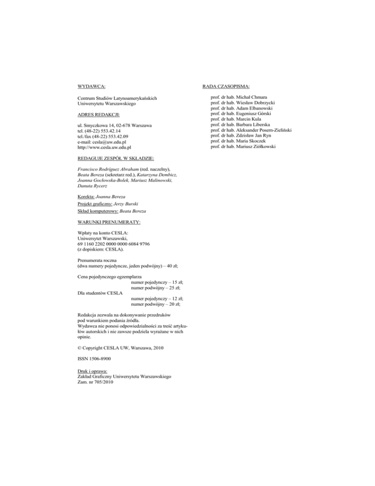 WYDAWCA: Centrum Studiów Latynoamerykańskich Uniwersytetu Warszawskiego ADRES REDAKCJI: ul. Smyczkowa 14, 02-678 Warszawa tel. (48-22) 553.42.14 tel./fax (48-22) 553.42.09 e-mail: [email protected] http://www.cesla.uw.edu.pl REDAGUJE ZESPÓŁ W SKŁADZIE: Francisco Rodríguez Abraham (red. naczelny), Beata Bereza (sekretarz red.), Katarzyna Dembicz, Joanna Gocłowska-Bolek, Mariusz Malinowski, Danuta Rycerz Korekta: Joanna Bereza Projekt graficzny: Jerzy Burski Skład komputerowy: Beata Bereza WARUNKI PRENUMERATY: Wpłaty na konto CESLA: Uniwersytet Warszawski, 69 1160 2202 0000 0000 6084 9796 (z dopiskiem: CESLA). Prenumerata roczna (dwa numery pojedyncze, jeden podwójny) – 40 zł; Cena pojedynczego egzemplarza numer pojedynczy – 15 zł; numer podwójny – 25 zł; Dla studentów CESLA numer pojedynczy – 12 zł; numer podwójny – 20 zł; Redakcja zezwala na dokonywanie przedruków pod warunkiem podania źródła. Wydawca nie ponosi odpowiedzialności za treść artykułów autorskich i nie zawsze podziela wyrażane w nich opinie. © Copyright CESLA UW, Warszawa, 2010 ISSN 1506-8900 Druk i oprawa: Zakład Graficzny Uniwersytetu Warszawskiego Zam. nr 705/2010 RADA CZASOPISMA: prof. dr hab. Michał Chmara prof. dr hab. Wiesław Dobrzycki prof. dr hab. Adam Elbanowski prof. dr hab. Eugeniusz Górski prof. dr hab. Marcin Kula prof. dr hab. Barbara Liberska prof. dr hab. Aleksander Posern-Zieliński prof. dr hab. Zdzisław Jan Ryn prof. dr hab. Maria Skoczek prof. dr hab. Mariusz Ziółkowski AMERYKA ŁACIŃSKA. Kwartalnik analityczno-informacyjny NR 2 (68) 2010 Centrum Studiów Latynoamerykańskich Uniwersytetu Warszawskiego ISSN 1506-8900 ■ Spis treści ..............................................................1 ■ Polska – Ameryka ■ Od Redakcji..........................................................2 * Wzajemne kontakty kulturalne Polska – świat iberoamerykański ....................... 64 ■ Studia – Eseje Barbara Liberska Model rozwoju Brazylii w okresie rządów prezydenta Luiza Inácio Lula da Silvy....................... 3 Anna Rynkowska-Sachse Współczesne budynki biurowe w Ameryce Łacińskiej na przykładzie wybranych metropolii Argentyny, Brazylii, Chile, Meksyku i Peru ....................... 11 ■ Kultura * Elsa Drucaroff: „Nie lubię tematów tabu”. Wywiad z autorką powieści „Piekło obiecane” (Magdalena Szkwarek) ...................................... 69 * Kultura iberoamerykańska w świecie................. 72 ■ Gospodarka * Sytuacja gospodarcza w regionie ....................... 74 Anna Kaganiec-Kamieńska Parę uwag o „kulturze latynoskiej” («latino») w Stanach Zjednoczonych Ameryki ................. 27 ■ Kronika ■ Kraje – Regiony ■ Miscellanea ........................................................ 80 * Kronika wydarzeń ............................................... 77 Radosław Smyk Chile u progu dwusetlecia niepodległości Republiki. Zarys aktualnej sytuacji politycznej, gospodarczej i społecznej............. 38 ■ Książki * Marcin Florian Gawrycki, W pogoni za wyobrażeniami. Próba interpretacji polskiej literatury podróżniczej poświęconej Ameryce Łacińskiej (recenzja: Marcin Kula).......................................52 * Elsa Drucaroff, „Piekło obiecane”, (recenzja Magdalena Szkwarek)..........................56 ■ Nauka * Obchody 200-lecia niepodległości Ameryki Łacińskiej – krótki kontekst historyczny .......... 57 * Obchody 200-lecia niepodległości Ameryki Łacińskiej na Uniwersytecie Warszawskim (Warszawa, 17-30 maja 2010 r.) ..................... 59 * Życie naukowe CESLA ....................................... 61 * Nabytki Biblioteki CESLA .................................. 63 1 Szanowni Czytelnicy Drugi kwartał bieżącego roku był okresem intensywnej działalności w naszej jednostce. Odczułem to w sposób nadzwyczajny, gdy po powierzeniu mojej osobie przez JM Rektor UW funkcji dyrektora Centrum Studiów Latynoamerykańskich, stanąłem na czele jednej z najbardziej renomowanych europejskich instytucji latynoamerykanistycznych. Nowa dla mnie sytuacja, będąca wyrazem zaufania ze strony członków naszego Zespołu, wyrażonego w marcowych wyborach uzupełniających, zbiegła się w czasie z realizacją jednego z ambitniejszych przedsięwzięć podjętych przez CESLA w ostatnich latach. Mowa oczywiście o obchodach dwustulecia niepodległości Ameryki Łacińskiej. Idea upamiętnienia przez Uniwersytet Warszawski, poprzez serię przedsięwzięć akademickich i kulturalnych, zainicjowania latynoamerykańskiego procesu niepodległościowego została opracowana jeszcze przez nieodżałowanego Profesora Andrzeja Dembicza i uzyskała pełne poparcie władz rektorskich. Profesor pozostawił nam w zasadzie gotową koncepcję tego zamysłu. Reszta leżała w gestii Zespołu. A ten rzeczywiście wykonał ogromną pracę, co zostało zauważone i docenione przez gości, zarówno z kraju jak i z zagranicy, którzy odwiedzili nas w drugiej połowie maja. W tym miejscu chciałbym podziękować Koleżankom i Kolegom odpowiedzialnym za realizację programu obchodów. W sekcji Nauka zamieszczone zostało krótkie sprawozdanie z obchodów – pełniejsza relacja znajdzie się natomiast w przygotowywanej obecnie odrębnej publikacji. Wśród materiałów niniejszego numeru warte szczególnej uwagi są artykuły zamieszczone w dziale Studia-Eseje. W pierwszym z nich, Barbara Liberska dokonuje analizy brazylijskiego procesu społecznogospodarczego ostatniej dekady, minionej pod znakiem rządów prezydenta Luiza Inácio Lula da Silvy. Okazał się on, wbrew swojej pierwotnej retoryce politycznej, bardzo pragmatycznym mężem stanu, potrafiącym lepiej od swojego poprzednika połączyć prorynkową politykę gospodarczą z realizacją bardzo ambitnych polityk prospołecznych, których znaczenia i konieczności nie sposób negować. Brazylia pod rządami Luli jeszcze wyraźniej udowodniła s