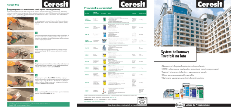 Ceresit PCC Przy pomocy Ceresit PCC można skutecznie i trwale naprawić konstrukcję balkonową Wiele konstrukcji balkonowych uległo korozji wskutek działania czynników chemicznych i mechanicznych. Uszkodzenia takie można jednak skutecznie naprawiać. Ceresit posiada w swojej ofercie system PCC dostosowany do betonów o klasie powyżej C 12/15, a więc takich, z których budowane były balkony do lat 90-tych. Oto czynności, jakie należy wykonać w celu naprawy uszkodzonego balkonu: 1. W celu oczyszczenia powierzchni betonu skuć luźne skorodowane fragmenty betonu, usunąć zniszczone warstwy wykładzin, tynków, izolacji. Przewodnik po produktach symbol nazwa produktu opis zużycie opakowanie CR 90 Crystaliser Krystalizująca powłoka uszczelniająca • Współpracuje z taśmą uszczelniającą • Samouszczelnia rysy do 0,4 mm poprzez efekt krystalizacji • Tworzy powłokę odporną na przenikanie wody • Umożliwia układanie płytek po 3 dniach • Zapewnia odporność na negatywne i pozytywne parcie wody ok. 4,0 kg/m2 w zależności od grubości warstwy worki 25 kg CN 87 Szybko twardniejąca masa posadzkowa • Szybko twardnieje – ruch pieszy już po 3 godz., wykonywanie posadzek po 24 godz. • Wysoka wytrzymałość • Grubość od 10 do 80 mm • Łatwe stosowanie • Mrozo- i wodoodporna ok. 2,0 kg/m2 na każdy mm grubości worki 25 kg CM 16 Elastyczna zaprawa klejąca „Flex” • Na izolacje przeciwwilgociowe i przeciwwodne • Na ogrzewane podłogi • Na balkony i tarasy • Do płytek wielkoformatowych 1,4 - 3,1 kg w zależności od wymiarów zębów pacy worki 25 kg CE 43 GRAND’ELIT Spoina elastyczna, wodoodporna • Odporna na zwiększone obciążenia chemiczne i mechaniczne • Na balkony, tarasy, ciągi komunikacyjne, korytarze, klatki schodowe, baseny • Odporna na zabrudzenia, grzyby i pleśnie • Odpowiednia do spoin o szerokości do 20 mm 0,8 - 1,2 kg/m2 w zależności od wymiaru płytek i szerokości spoin worki 25 kg i wiaderka plastikowe 5 kg Taśma uszczelniająca • Uszczelnia dylatacje i odkształcalne spoiny w okładzinach z płytek ceramicznych • Do łazienek, kuchni, na balkony i tarasy • Elastyczna • Wytrzymała na rozciąganie • Odporna na starzenie i alkalia CC 81 2. Jeżeli korozja dotarła do zbrojenia należy z niego usunąć beton aż do miejsc nieskorodowanych. Pręty oczyścić z rdzy ręcznie lub mechanicznie do uzyskania jasnego, metalicznego wyglądu, a potem oczyścić sprężonym powietrzem. 3. CL 152 produkt Na tak przygotowaną powierzchnię nałożyć mineralną powłokę antykorozyjną Ceresit CD 30 (podczas aplikacji stal może być wilgotna). 4. Emulsja kontaktowa • • • • • Zwiększa przyczepność Poprawia urabialność Zapobiega zbyt szybkiemu przesychaniu Łatwa w stosowaniu Odporna na alkalia obrzutka – 0,125 l/m2 kanistry 2 l, 5 l, 10 l CD 24 Szpachlówka do napraw betonu, do 5 mm • Niewielki skurcz • Mrozo- i wodoodporna • Odporna na środki chemiczne stosowane do posypywania dróg (w tym soli) • Wysoki opór karbonatyzacyjny ok. 1,5 kg/ m2/1 mm grubości worki 25 kg CD 25 Drobnoziarnista zaprawa do napraw betonu, od 5 do 30 mm • • • • • Zbrojona włóknami Możliwość stosowania wewnątrz i na zewnątrz Wysoki opór karbonatyzacyjny Do nakładania ręcznego i mechanicznego Do betonów o kl. powyżej C12/15 ok. 2,0 kg/ m2/1 mm grubości worki 25 kg CD 26 Gruboziarnista zaprawa do napraw betonu, od 30 do 100 mm • • • • • Zbrojona włóknami Możliwość stosowania wewnątrz i na zewnątrz Wysoki opór karbonatyzacyjny Do nakładania ręcznego i mechanicznego Do betonów o kl. powyżej C12/15 ok. 2,0 kg/ m2/1 mm grubości Możliwość stosowania wewnątrz i na zewnątrz Zawiera inhibitory korozji Do nakładania ręcznego (pędzlem lub szczotką) Do betonów o kl. powyżej C12/15 warstwa antykorozyjna: ok. 2 kg/m2 na 2 warstwy o łącznej grubości ok. 1 mm warstwa kontaktowa: ok. 1,5 kg/m2 Przygotowaną powierzchnię betonu należy zwilżyć wodą i doprowadzić do stanu matowo-wilgotnego. Na tak przygotowane podłoże nakłada się kontaktową warstwę Ceresit CD 30. 5. Kolejne zaprawy systemu Ceresit PCC nakładać po wstępnym przeschnięciu warstwy kontaktowej, gdy zaprawa stanie się matowowilgotna, czyli w ciągu 30-60 minut. W zależności od głębokości ubytku w balkonie do jego uzupełnienia należy zastosować jedną z zapraw Ceresit CD 25 lub CD 26. CD 30 6. W celu uzyskania gładkiej powierzchni można ją wyrównać drobnoziarnistą szpachlówką Ceresit CD 24. rolki 10 m i 50 m CS 29 Jednoskładnikowa mineralna ochrona przed korozją i zaprawa kontaktowa „2 w 1” • • • • Uszczelniacz poliuretanowy • Doskonała przyczepność do wielu materiałów (również wilgotnych) • Wodoodporny • Odporny na UV • Trwale elastyczny nawet w niskich temperaturach • Może być malowany System balkonowy Trwałość na lata • Niezawodne i długotrwałe zabezpieczenie przed wodą • CR 90 – alternatywne rozwiązanie w stosunku do papy termozgrzewalnej • Szybkie i łatwe prace izolacyjne – szybkosprawne jastrychy • Dobra paroprzepuszczalność materiałów worki 25 kg • Optymalna współpraca wszystkich elementów systemu worki 25 kg kartusz 300 ml, rękaw z folii aluminiowej 600 ml Chcesz uzyskać poradę: zadzwoń na infolinię! Numer: 800 120 241 Henkel Polska Sp. z o.o., ul. Domaniewska 41, 02-672 Warszawa www.ceresit.pl, www.cr90crystaliser.com/pl Szczegółowe informacje na temat naprawy balkonów znajdą Państwo w broszurze „Ceresit PCC – system naprawy betonu”. Budujkorzystając korzystajączzzprofesjonalnych profesjonalnych rozwiązań. Buduj korzystając profesjonalnych Buduj, rozwiązań Ceresit/WP/BB/G3/04.2012 Wszystkie szczegółowe dane dotyczące właściwości produktów, sposobu użycia, a także zużycia znajdziecie Państwo w kartach technicznych produktów Ceresit. Rysunki techniczne System balkonowy Ceresit 3