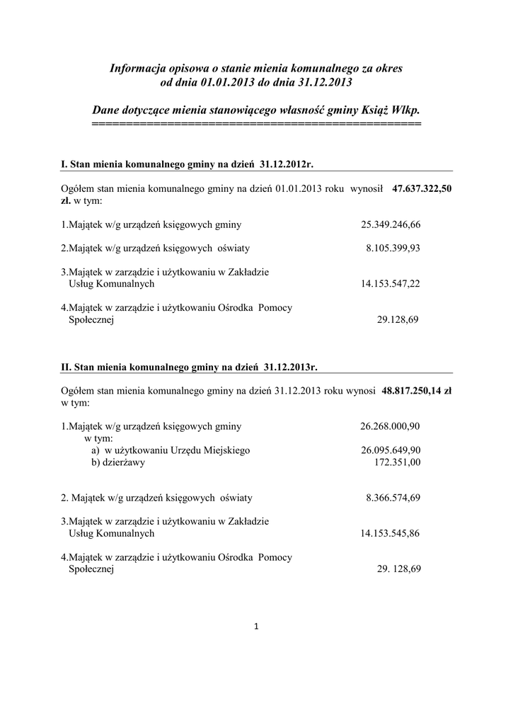 Informacja opisowa o stanie mienia komunalnego za okres od dnia 01.01.2013 do dnia 31.12.2013 Dane dotyczące mienia stanowiącego własność gminy Książ Wlkp. ================================================ I. Stan mienia komunalnego gminy na dzień 31.12.2012r. Ogółem stan mienia komunalnego gminy na dzień 01.01.2013 roku wynosił 47.637.322,50 zł. w tym: 1.Majątek w/g urządzeń księgowych gminy 25.349.246,66 2.Majątek w/g urządzeń księgowych oświaty 8.105.399,93 3.Majątek w zarządzie i użytkowaniu w Zakładzie Usług Komunalnych 4.Majątek w zarządzie i użytkowaniu Ośrodka Pomocy Społecznej 14.153.547,22 29.128,69 II. Stan mienia komunalnego gminy na dzień 31.12.2013r. Ogółem stan mienia komunalnego gminy na dzień 31.12.2013 roku wynosi 48.817.250,14 zł w tym: 1.Majątek w/g urządzeń księgowych gminy w tym: a) w użytkowaniu Urzędu Miejskiego b) dzierżawy 26.268.000,90 2. Majątek w/g urządzeń księgowych oświaty 8.366.574,69 26.095.649,90 172.351,00 3.Majątek w zarządzie i użytkowaniu w Zakładzie Usług Komunalnych 4.Majątek w zarządzie i użytkowaniu Ośrodka Pomocy Społecznej 1 14.153.545,86 29. 128,69 Wartość środków trwałych w okresie od 01.01.2013 do 31.12.2013 w poszczególnych grupach i podgrupach przedstawia się następująco: GRUPA 0 – GRUNTY Podgrupa Nazwa podgrupy 0/01 0/02 Użytki rolne Grunty leśne Grunty zabudowane i zurbanizowane 0/03 0/05 0/06 0/07 Tereny różne Nieużytki Grunty pod wodami Razem: Stan na 01.01.2013 Zwiększenie Zmniejszenie Stan na 31.12.2013 544.149,00 62.016,00 - 361.510,00 - 182.639,00 62.016,00 2.610.947,00 74.653,00 91.564,00 2.594.036,00 17.524,00 - - 25.046,06 4.750,06 3.264.432,12 74.653,00 453.074,00 17.524,00 25.046,06 4.750,06 2.886.011,12 Grunty w użytkowaniu: Urząd Miejski w Książu Wlkp. w tym: w dzierżawie - 247.3422 ha - 16.7058 ha na wartość - 2.702.624,12 Stan gruntów na Stan gruntów na 01.01.2013r. (ha) 31.12.2013 r. (ha) Brzóstownia 6.5380 6.5380 Chrząstowo 47.2646 14.1668 Chwałkowo Kośc. 38.5659 38.5659 Gogolewo 10.9164 10.9164 Jarosławki 10.7760 10.7760 Kiełczynek 5.3675 5.4463 Kołacin 13.8934 13.8474 Konarskie 1.2200 1.2200 Konarzyce 16.3246 16.3246 Obręb geodezyjny 2 Łężek 4.0970 4.1023 Mchy 29.0131 28.8079 Radoszkowo 16.0057 16.1032 Sroczewo 2.2870 3.4133 Świączyń 7.3479 8.8471 Włościejewice 6.9109 6.9109 Włościejewki 16.8345 16.8345 Zaborowo 13.6646 13.6646 Zakrzewice 5.3378 8.8408 M. Książ Wlkp. 28.3089 22.0162 Razem 280.6738 247.3422 Zakład Usług Komunalnych Palcówki oświatowe Razem grunty = - 3.7859 ha 5.5093 ha - 256.6374 ha na wartość - 73.201,00 na wartość - 110.186,00 na wartość - 2.886.011,12 Zmiany w stanie gruntów w okresie od 01.01.2013 do 31.12.2013: 010 Grunty orne -wyksięgowano użytkowanie wieczyste do ewidencji pozabilansowej 030 Tereny mieszkaniowe -wyksięgowano użytkowanie wieczyste do ewidencji pozabilansowej -Zakład Usług Komunalnych w Książu Wlkp. przekazał gminie 031 Tereny przemysłowe - wyksięgowano użytkowanie wieczyste do ewidencji pozabilansowej - przekształcono użytkowanie wieczyste w prawo własności -Zakład Usług Komunalnych w Książu Wlkp. przekazał gminie 032 Inne tereny zabudowane - wyksięgowano użytkowanie wieczyste do ewidencji pozabilansowej - przyjęto z Zakładu Usług Komunalnych w Książu -zakupiono grunt w Chrząstowie / garaż OSP/ 3 - 361.510,00 - 15.542,00 - 1.200,00 - 46.878,00 - 20.422,00 - 4.172,00 - 2.840,00 + 5.372,00 + 844,00 036 Tereny komunikacyjne - wyksięgowano użytkowanie wieczyste do ewidencji pozabilansowej - 500,00 -zakupiono działki pod drogi w Książu, Kiełczynku, Łężku, Zakrzewicach, Świączyniu + 1.469,00 -zwiększenie gruntów w wyniku komunalizacji gruntów-decyzje Wojewody Wielkopolskiego w Zakrzewicach, Sroczewie, Radoszkowie, Świączyniu, Mchach + 66.968,00 -sprzedano grunt pod drogę 10,00 Ogółem zasób gruntów gminy zmniejszył się o 33,6002 ha na ogólną wartość księgową 378.421,00 zł. i wynosi na dzień 31.12.2013 256,6374 ha na wartość 2.886.011,12 zł. GRUPA I – BUDYNKI Podgrupa 1/10 1/11 Stan na 01.01.2013 Zwiększenie Zmniejszenie Stan na 31.12.2013 11.454.231,40 659.967,56 261.174,76 11.853.024,20 962.923,75 - 4.944,00 957.979,75 12.417.155,15 659.967,56 266.118,76 12.811.003,95 Nazwa podgrupy Budynki niemieszkalne (budynek biurowy, budynki świetlic wiejskich, budynki szkolne, OSP, wiaty) Budynki mieszkalne (lokale mieszkalne) Razem: Budynki w użytkowaniu: Urząd Miejski w Książu Wlkp. Zakład Usług Komunalnych szt. 14 Palcówki oświatowe szt. 10 - na wartość - na wartość - na wartość 3.892.766,41 1.353.793,47 7.564.444,07 Zmiany w stanie budynków w okresie od 01.01.2013 do 31.12.2013: -przyjęto z inwestycji adaptacja pomieszczeń dla OPS w budynku Urzędu Miejskiego + -przekazano SP w Chwałkowie termomodernizacja budynku -przyjęto z inwestycji modernizację świetlicy wiejskiej w Kiełczynku + -przyjęto z inwestycji modernizację świetlicy wiejskiej w Konarzycach + -przyjęto z inwestycji adaptację pomieszczeń na przedszkole w budynku świetlicy wiejskiej w Chwałkowie + -zakupiono garaż dla OSP w Chrząstowie + -zlikwidowano budynek mieszkalny w Kiełczynku / / -przyjęto z inwestycji adaptację pomieszczeń w świetlicy wiejskiej w Kołacinie na magazyn i wc. + -przyjęto w SP Chwałkowie termomodernizację budynku + 4 50.000,00 261.174,76 96.599,26 139.121,35 85.215,62 6.000,00 4.944,00 21.856,57 261.174,76 GRUPA II – BUDOWLE Podgrupa Nazwa podgrupy 2/21 2/22 2/29 Kanalizacja deszczowa, sanitarna, studnie, sieć wodociągowa, oświetlenie drogowe Drogi, ulice Boiska sportowe, obiekty rekreacyjne, place zabaw Razem: Stan na 01.01.2013 Zwiększenie Zmniejszenie - Stan na 31.12.2013 12.273.331,17 179.467,85 8.830.576,10 980.727,80 - 9.811.303,90 9.406.982,11 25.600,00 - 9.432.582,11 30.510.889,38 1.185.795,65 - 12.452.799,02 31.696.685,03 Budowle w użytkowaniu: Urząd Miejski w Książu Wlkp.