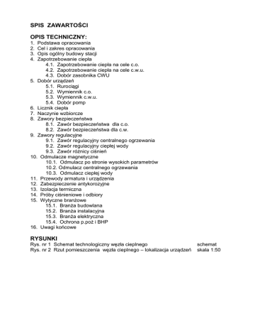 SPIS ZAWARTOŚCI OPIS TECHNICZNY: 1. 2. 3. 4. Podstawa opracowania Cel i zakres opracowania Opis ogólny budowy stacji Zapotrzebowanie ciepła 4.1. Zapotrzebowanie ciepła na cele c.o. 4.2. Zapotrzebowanie ciepła na cele c.w.u. 4.3. Dobór zasobnika CWU 5. Dobór urządzeń 5.1. Rurociągi 5.2. Wymiennik c.o. 5.3. Wymiennik c.w.u. 5.4. Dobór pomp 6. Licznik ciepła 7. Naczynie wzbiorcze 8. Zawory bezpieczeństwa 8.1. Zawór bezpieczeństwa dla c.o. 8.2. Zawór bezpieczeństwa dla c.w. 9. Zawory regulacyjne 9.1. Zawór regulacyjny centralnego ogrzewania 9.2. Zawór regulacyjny ciepłej wody 9.3. Zawór różnicy ciśnień 10. Odmulacze magnetyczne 10.1. Odmulacz po stronie wysokich parametrów 10.2. Odmulacz centralnego ogrzewania 10.3. Odmulacz ciepłej wody 11. Przewody armatura i urządzenia 12. Zabezpieczenie antykorozyjne 13. Izolacja termiczna 14. Próby ciśnieniowe i odbiory 15. Wytyczne branżowe 15.1. Branża budowlana 15.2. Branża instalacyjna 15.3. Branża elektryczna 15.4. Ochrona p.poż i BHP 16. Uwagi końcowe RYSUNKI Rys. nr 1 Schemat technologiczny węzła cieplnego Rys. nr 2 Rzut pomieszczenia węzła cieplnego – lokalizacja urządzeń schemat skala 1:50 OPIS TECHNICZNY Do projektu budowlano-wykonawczego, dwufunkcyjnego węzła cieplnego pracującego na potrzeby instalacji centralnego ogrzewania oraz ciepłej wody użytkowej w proj. budynku mieszkalnym 12 rodzinnych „Dom nad bulwarem 15”budynek nr 1, 2, 3, przy ul. W. Witosa, 83-140 Gniew dz. nr 1/38. 1. Podstawa opracowania Podstawą opracowania projektu budowlano-wykonawczego węzła cieplnego CO i CWU dla wielorodzinnego budynku mieszkalnego wielorodzinnego są: - zlecenie inwestora - Gmina Gniew, 83-140 Gniew, ul. Plac Grunwaldzki 1 - ustalenia i uzgodnienia z Inwestorem - warunki techniczne nr 8/SW/2011 wydane przez Dalkia Północ Sp. z o.o., ul. Ciepła 9, 86-105 Świecie - obowiązujące normy i przepisy 2. Cel i zakres opracowania Celem opracowania jest budowa stacji wymienników c.o. i c.w.u. zasilana z nowoprojektowanej miejskiej sieci ciepłowniczej wysokoparametrowej, wg odrębnego opracowania (rozpatrywane miejsce podłączenia to istniejąca komora K-2). Zastosowanie wymienników pozwoli na otrzymanie czynnika grzewczego o odpowiednich parametrach na cele instalacji centralnego ogrzewania i przygotowania ciepłej wody użytkowej. Projektowana stacja przystosowana będzie do pracy zautomatyzowanej w zależności od zewnętrznych warunków pogodowych umożliwiająca racjonalną gospodarkę energia cieplną. Regulacja będzie odbywała się za pomocą regulatora umożliwiającego najbardziej optymalne parametry pracy firmy Samson Travis 5746. Projektowany węzeł jest węzłem powtarzalnym dla każdego z trzech projektowanych budynków objętych zakresem opracowania. 3. Opis ogólny budowy stacji Stację wymienników projektuje się w pomieszczeniu do tego przeznaczonym, usytuowanym na poziomie piwnicy nowoprojektowanego budynku o powierzchni użytkowej każdego z budynków równej 762,60 m2. Projektowana powierzchnia węzła cieplnego wynosi F=10,3m2. Na cele instalacji centralnego ogrzewania projektuje się zastosowanie wymiennika płytowego lutowanego. Natomiast na cele instalacji ciepłej wody użytkowej projektuje się zastosowanie wymiennika typu JAD 3.18. Ciepło z miejskiej sieci w okresie sezonu grzewczego dostarczane jest w wodzie o temp.130/700C. Woda wychodząca z wymiennika na ogrzewanie pomieszczeń będzie miała parametry pracy wewnętrznej instalacji tj. 80/600C (zgodnie z warunkami nr 8/SW/2011), zmienne liniowo w zależności od wysokości temp. zewnętrznej powietrza atmosferycznego. Woda instalacyjna będzie miała obieg wymuszony pompą obiegową o zmiennej wydajności. W okresie letnim parametry pracy sieci miejskiej są stałe i na dojściu do wymiennika wynoszą odpowiednio 60/400C ,natomiast na wyjściu z wymiennika do instalacji, temperatura ciepłej wody wyniesie 550C. Dla uzyskania wymuszonego obiegu wody cyrkulacyjnej przewiduje się zastosowanie pompy cyrkulacyjnej. Układ ciepłej wody projektuje się z zastosowaniem zasobnika ciepłej wody firmy Reflex, typu LS500 o łącznej pojemności V=500 l. Przewidywany czas podgrzewu wody dopływającej do zasobnika wynosi 66minut. Zabezpieczenie instalacji centralnego ogrzewania stanowić będzie przeponowe naczynie wzbiorcze. Uzupełnienie zładu instalacji centralnego ogrzewania przewiduje się wodą z wysokoparametrowej sieci ciepłowniczej za pośrednictwem reduktora ciśnienia. 4. Zapotrzebowanie ciepła 4.1 Zapotrzebowanie ciepła na cele instalacji centralnego ogrzewania Zapotrzebowanie energii cieplnej na cele wewnętrznej instalacji centralnego ogrzewania przyjęto zgodnie z warunkami technicznymi nr 8/SW/2011 z dnia 26.10.2011r wystawionymi przez Dalkia Północ Sp. z o.o., które wynosi: Qco=40 kW 4.2 Zapotrzebowanie ciepła na cele instalacji ciepłej wody użytkowej Zapotrzebowanie energii cieplnej na cele wewnętrznej instalacji ciepłej wody użytkowej przyjęto zgodnie z warunkami technicznymi nr 8/SW/2011 z dnia 26.10.2011r wystawionymi przez Dalkia Północ Sp. z o.o., które wynosi: Qco=30 kW 4.3 Dobór zasobnika CWU Parametry okresu grzewczego: 130/70°C, a dla okresu letniego 60/40°C Zapotrzebowanie ciepła dla przygotowania CWU = U * qc qdśr qhśr = qdśr /t qhmax = qhśr * N gdzie: qdśr - średnie dobowe zapotrzebowanie na ciepłą wodę użytkową qhśr - średnie godzinowe zapotrzebowanie na ciepłą wodę użytkową qhmax - maksymalne godzinowe zapotrzebowanie na ciepłą wodę użytkową U - liczba użytkowników zaopatrywanych z węzła ciepłej wody qc - jednostkowe dobowe zapotrzebowanie na ciepłą wodę dla użytkownika t - liczba godzin użytkowania instalacji ciepłej wody w ciągu doby N - współczynnik godzinowej nierównomierności rozbioru wody. Dane: n= Ilość mieszk.= qc = t= U= 3,5 12 120 18 42 N = 9,32*U -0,244 N= 3,744 qdśr= 5040 l/d qhśr= qhmax 280 1048 l/h l/h os/mieszk miesz