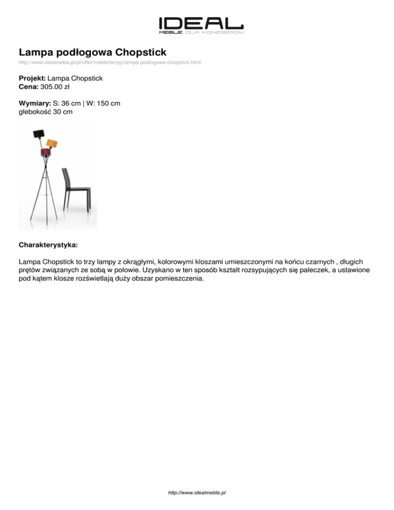 Lampa podłogowa Chopstick http://www.idealmeble.pl/pl/offer/meble/lampy/lampa-podlogowa-chopstick.html/ Projekt: Lampa Chopstick Cena: 305.00 zł Wymiary: S: 36 cm | W: 150 cm głebokość 30 cm Charakterystyka: Lampa Chopstick to trzy lampy z okrągłymi, kolorowymi kloszami umieszczonymi na końcu czarnych , długich prętów związanych ze sobą w połowie. Uzyskano w ten sposób kształt rozsypujących się pałeczek, a ustawione pod kątem klosze rozświetlają duży obszar pomieszczenia. http://www.idealmeble.pl http://www.idealmeble.pl Zdjęcia produktu: http://www.idealmeble.pl Powered by TCPDF (www.tcpdf.org)