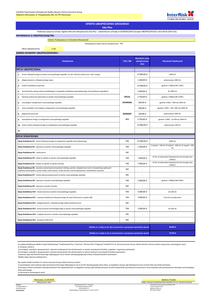 InterRisk Towarzystwo Ubezpieczeń Spółka Akcyjna Vienna Insurance Group Oddział w Warszawie, ul. Powązkowska 44C, 01-797 Warszawa OFERTA UBEZPIECZENIA SZKOLNEGO Edu Plus Podstawa zawarcia umowy: Ogólne Warunki Ubezpieczenia Edu Plus - zatwierdzone uchwałą nr 05/04/03/2014 Zarządu UBEZPIECZYCIELA z dnia 04.03.2014 roku. INFORMACJE O UBEZPIECZAJĄCYM: Szkoła Podstawowa nr 6 Grodzisk Mazowiecki Przewidywana liczba osób do ubezpieczenia: 650 Okres ubezpieczenia: 1 rok ZAKRES OCHRONY UBEZPIECZENIOWEJ: Świadczenie TAK / NIE Wysokość sumy ubezpieczenia (SU) Wysokość świadczenia OPCJA UBEZPIECZENIA: 1. śmierć Ubezpieczonego w wyniku nieszczęśliwego wypadku (w tym również zawał serca i udar mózgu) 12 000,00 zł 100% SU 2. zdiagnozowanie u Ubezpieczonego sepsy 1 200,00 zł jednorazowo 100% SU 3. trwałe inwalidztwo częściowe 12 000,00 zł zgodnie z TABELĄ NR 1 OWU 4. zwrot kosztów zakupu wózka inwalidzkiego na wypadek inwalidztwa spowodowanego nieszczęśliwym wypadkiem 5 000,00 zł do 100% SU 5. złamanie jednej lub więcej kości w wyniku nieszczęśliwego wypadku OPCJA 2 750,00 zł zgodnie z TABELĄ NR 2 OWU 6. rany będące następstwem nieszczęśliwego wypadku OCHRONA 500,00 zł zgodnie z OWU - 40% lub 100% SU 7. urazy narządów ruchu będące następstwem nieszczęśliwego wypadku 500,00 zł zgodnie z OWU - 25%, 50% lub 100% SU 8. pogryzienie przez psa WARIANT 130,00 zł jednorazowo 100% SU 9. wstrząśnienie mózgu w następstwie nieszczęśliwego wypadku 0-9 2 250,00 zł zgodnie z OWU - od 20% do 100% SU 12 000,00 zł jednorazowo 10% SU 10. śmierć rodzica Ubezpieczonego w następstwie nieszczęśliwego wypadku 11. - - OPCJE DODATKOWE: TAK Opcja Dodatkowa D1 - śmierć Ubezpieczonego w następstwie wypadku komunikacyjnego 12 000,00 zł 100% SU II stopień - 10% SU; III stopień - 30% SU; IV stopień - 50% SU Opcja Dodatkowa D2 - oparzenia w wyniku nieszczęśliwego wypadku TAK 2 200,00 zł Opcja Dodatkowa D3 – odmrożenia NIE - - Opcja Dodatkowa D4 - pobyt w szpitalu w wyniku nieszczęśliwego wypadku TAK 7 000,00 zł 1% SU za każdy dzień (świadczenie od trzeciego dnia pobytu) Opcja Dodatkowa D5 - pobytu w szpitalu w wyniku choroby TAK 7 000,00 zł 1% SU za każdy dzień (świadczenie od trzeciego dnia pobytu) Opcja Dodatkowa D6 - poważne zachorowania (nowotwór złośliwy, paraliż, niewydolność nerek, transplantacja głównych organów, poliomyelitis, utrata mowy, utrata słuchu, utrata wzroku, anemia aplastyczna, stwardnienie rozsiane) NIE - - Opcja Dodatkowa D7 – koszty operacji plastycznych w wyniku nieszczęśliwego wypadku NIE - - Opcja Dodatkowa D8 - operacje w wyniku nieszczęśliwego wypadku TAK 2 000,00 zł zgodnie z TABELĄ NR 8 OWU Opcja Dodatkowa D9 - operacje w wyniku choroby NIE - - Opcja Dodatkowa D10 – koszty leczenia w wyniku nieszczęśliwego wypadku TAK 6 000,00 zł do 10% SU Opcja Dodatkowa D11 - czasowa niezdolność Ubezpieczonego do nauki i/lub pracy w wyniku NW TAK 3 000,00 zł 0,1% SU za każdy dzień Opcja Dodatkowa D12 - zdiagnozowanie u Ubezpieczonego wady wrodzonej serca NIE - - Opcja Dodatkowa D13 - koszty leczenia stomatologicznego w wyniku nieszczęśliwego wypadku TAK 5 000,00 zł do 10% SU Opcja Dodatkowa D14 - uciążliwe leczenie w wyniku nieszczęśliwego wypadku NIE - - Opcja Dodatkowa D15 - Assistance EDU PLUS NIE - - Składka za 1 osobę za rok (bez rozszerzenie o wyczynowe uprawianie sportu) 58,00 zł Składka za 1 osobę za rok (z rozszerzeniem o wyczynowe uprawianie sportu) 72,50 zł Za zapłatą dodatkowej składki w Opcji Podstawowej* ,Podstawowej Plus*, Ochrona*, Ochrona Plus* Progresja* InterRisk TU S.A. Vienna Insurance Group udziela również ochrony osobom wyczynowo uprawiającym sport, tj. biorącym udział w: a) treningach, zawodach, zgrupowaniach i obozach kondycyjnych lub szkoleniowych w ramach pozaszkolnych klubów, związków i organizacji sportowych, b) treningach, zawodach, zgrupowaniach i obozach kondycyjnych lub szkoleniowych w ramach szkolnych (uczniowskich) klubów sportowych, c) podczas zajęć wychowania fizycznego odbywających się w ramach obowiązującego planu lekcji w klasach/szkołach sportowych. Składka ulega wówczas podwyższeniu. Bez zwyżki składki InterRisk S.A. Vienna Insurance Group udziela ochrony osobom: a) uprawiającym sport podczas zajęć wychowania fizycznego odbywających się w ramach obowiązującego planu lekcji, za wyjątkiem sytuacji, gdy Ubezpieczony jest uczniem klasy lub szkoły sportowej, b) biorącym udział w zawodach wewnątrzszkolnych lub międzyszkolnych, za wyjątkiem sytuacji, gdy Ubezpieczony jest uczniem klasy/szkoły sportowej lub uczestniczy w w/w zawodach jako przedstawiciel szkolnego (uczniowskiego) klubu sportowego, c) rekreacyjnie uprawiającym sport. Warszawa, 12.09.2014 Barbara Trzaska Miejscowość, data Centrala: ul. Noakowskiego 22 00-668 Warszawa www.interrisk.pl Podpis i pieczęć przedstawiciela InterRisk TU S.A. Vienna Insurance Sąd Rejonowy dla M. St. Warszawy XII Wydział Gospodarczy KRS KRS 0000054136 Kapitał zakładowy i kapitał wpłacony 137.640.100 PLN Zezwolenie Ministra Finansów Du/905/A/KP/93 z dnia 5 listopada 1993r. REGON 010644132 NIP 526-00-38-806