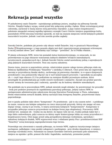 Rekreacja ponad wszystko W południowej części Śniardw - największego polskiego jeziora, znajduje się półwysep Szeroki Ostrów. Niegdyś będący wyspą, został przed laty połączony groblą z lądem. Mimo wzrastającej presji człowieka, zachował w dużej mierze swój pierwotny charakter, a jego walory krajobrazowe i położenie nieopodal owianej mgiełką tajemnicy wysepki Czarci Ostrów (miejsce pogańskiego kultu, pozostałości XVIII-wiecznej twierdzy) sprawiły, że stał się znanym miejscem wśród kolejnych pokoleń mazurskich turystów. Jednak i nad nim zawisła groźba zagłady. Szeroki Ostrów, podobnie jak prawie cały obszar wokół Śniardw, leży w granicach Mazurskiego Parku Krajobrazowego i z tego powodu objęty jest dość rygorystycznymi przepisami ochronnymi. A raczej zamiast słowa "jest" należałoby użyć innego - "powinien", bo to Polska właśnie... W planie ochronnym MPK, teren ten posiadał status bezinwestycyjnego, co oznaczało, że nie przewidywano na jego obszarze wznoszenia żadnych obiektów trwałych (mieszkalnych, turystycznych, gospodarczych itp.). Jednak Szeroki Ostrów został nawiedzony jedną z największych plag pięknych mazurskich terenów. Nosi ona nazwę zabudowy. Dawno temu, jeszcze w poprzednim ustroju, właścicielem prawie całego terenu półwyspu stała się Rolnicza Spółdzielnia Produkcyjna "Śniardwy" z siedzibą w Zdorach. Choć przez lata nie ingerowała mocniej w przyrodniczą tkankę okolicy, zachowując jej pierwotny charakter, to w epoce dziejowych przeobrażeń i ona postanowiła włączyć się w nurt komercyjnych procesów. I sprzedała na początku ub. r. część tego obszaru (3,5 ha podzielone na mniejsze działki) prywatnym osobom, które przystąpiły do przekształcania go wedle swoich wyobrażeń i zamiarów. Zaczęli oni grodzić parcele, zwozić ziemię do tworzenia plaż i nabrzeży, sposobić się do budowy obiektów mieszkalnych. Nie podobało się to pracownikom MPK, jednak niewiele mogli zdziałać, by powstrzymać ów proceder - brak jest podstaw prawnych do zapobieżenia parcelacji półwyspu. Jedyny sukces MPK to postępowanie administracyjne zakończone decyzją Starostwa Powiatowego w Piszu, nakazującą dwóm właścicielom nowych działek, którzy naruszyli linię brzegową Śniardw, przywrócenie stanu poprzedniego. Jest w języku polskim takie słowo "kompromis". Po przełożeniu - jak to się czasem mówi - z polskiego na nasze, oznacza ono kolejne ustępstwa na rzecz niszczycieli przyrody, którzy nie mogąc od razu dopiąć swego, czynią to po trochu, w miarę zawierania kolejnych "kompromisów". Kompromis w przypadku półwyspu oznacza przyzwolenie na kolejne formy jego eksploatacji. Pracownicy MPK wybrali tzw. mniejsze zło - trudno im się dziwić, bo lepszy rydz niż nic, trudno jednak także być z tego faktu zadowolonym, gdyż oznacza on dalszy napór komercyjnego lobby na cenny przyrodniczo i krajobrazowo teren. Otóż mając przed sobą perspektywę dalszego wydzielania, sprzedaży i zabudowy kolejnych działek, MPK wypracował wraz z władzami gminy Pisz i przedstawicielami RSP "Śniardwy" nową koncepcję zagospodarowania tego terenu. Przewiduje ona utworzenie u nasady półwyspu, na terenie MPK, zaplecza turystycznego (miejsca noclegowe, jadłodajnie i inne punkty usługowe) z parkingiem - przy drodze dojazdowej, w miejscu dawnego wyrobiska żwiru. Natomiast na samym Szerokim Ostrowie powstanie pole namiotowe, miejsca na ognisko i grille, pomost dla łodzi i kąpielisko, sanitariaty, przenośne punkty Rekreacja ponad wszystko 1 gastronomiczne, ścieżki turystyczne dla pieszych i rowerzystów, teren do jazdy konnej, punkty widokowe, zadaszenia chroniące przed deszczem. Nie będzie można na terenie samego półwyspu wznosić trwałych budowli (to samo odnosi się również do już wykupionych działek, które mają także pozostać nie ogrodzone). Można powiedzieć, że dobre i to, tym bardziej, że na razie nie ma inwestora, który podjąłby się stworzenia owych wymienionych wyżej "dobrodziejstw" i wykupił teren od RSP "Śniardwy". Można jednak spojrzeć na cały problem inaczej - znając mazurskie realia (stale rosnącą liczbę sezonowych turystów i rozprzestrzeniającą się wśród nich kulturę prymitywnej rozrywki), nie sposób myśleć o Szerokim Ostrowie inaczej niż jako kolejnym miejscu zamienianym w lunapark. Model rekreacji, jaki dominuje na tym terenie od kilkunastu lat nie ma nic wspólnego z szacunkiem dla przyrody i ludzi, którzy chcieliby ją podziwiać w nieprzekształconej postaci. "Rozwój" Mazur wygląda w ten sposób, że co roku wzrasta liczba turystów i wożących ich samochodów, masowych imprez, motorówek i skuterów wodnych, koszmarnych w formie i treści inwestycji komercyjnych, do tego dochodzi niemal wszechobecny hałas, śmieci, smród spalin i zanieczyszczenie wód produktami ropopochodnymi. Dawni turyści-wodniacy, dla których Mazury były oazą ciszy, spokoju i pięknej przyrody uciekają stąd w tempie ekspresowym, przenosząc się w spokojniejsze rejony. Znany amerykański krytyk kultury Neil Postman ukuł kiedyś na potrzeby opisania zachodzących procesów społecznych formułkę o "zabawieniu się na śmierć". Gdy obserwuję, jak kolejne cenne tereny przyrodnicze poświęcane są w imię tzw. rekreacji, przychodzi mi na myśl konstatacja o "zarekreowaniu się na śmierć". Taki będzie prawdopodobnie koniec ślepej pogoni za zyskami, "rozwojem" i prymitywnymi formami rozrywki. Szkoda tylko, że oprócz samych zainteresowanych ucierpi na tym także przyroda... Remigiusz Okraska Rekreacja ponad wszystko 2