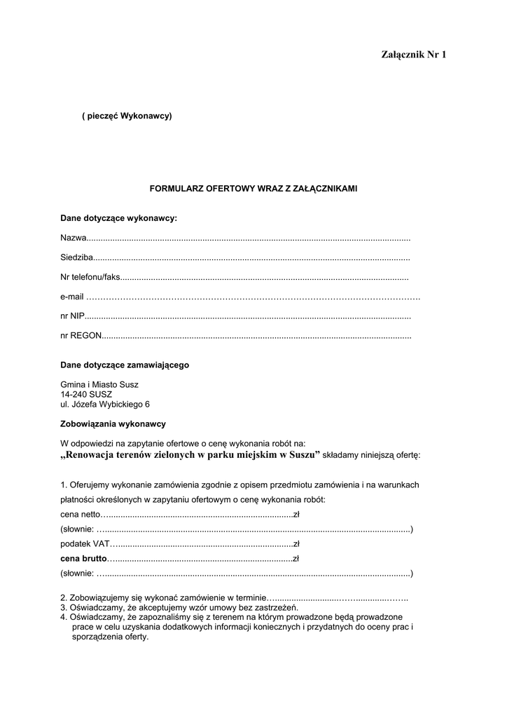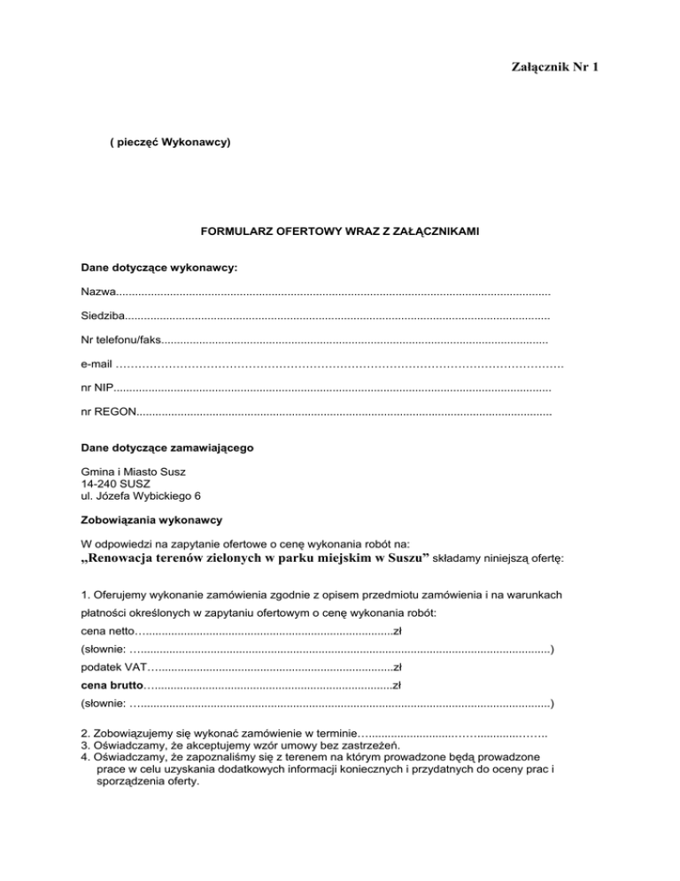 Załącznik Nr 1 ( pieczęć Wykonawcy) FORMULARZ OFERTOWY WRAZ Z ZAŁĄCZNIKAMI Dane dotyczące wykonawcy: Nazwa......................................................................................................................................... Siedziba...................................................................................................................................... Nr telefonu/faks.......................................................................................................................... e-mail ………………………………………………………………………………………………………. nr NIP.......................................................................................................................................... nr REGON................................................................................................................................... Dane dotyczące zamawiającego Gmina i Miasto Susz 14-240 SUSZ ul. Józefa Wybickiego 6 Zobowiązania wykonawcy W odpowiedzi na zapytanie ofertowe o cenę wykonania robót na: ,,Renowacja terenów zielonych w parku miejskim w Suszu” składamy niniejszą ofertę: 1. Oferujemy wykonanie zamówienia zgodnie z opisem przedmiotu zamówienia i na warunkach płatności określonych w zapytaniu ofertowym o cenę wykonania robót: cena netto…..............................................................................zł (słownie: ….................................................................................................................................) podatek VAT…..........................................................................zł cena brutto…...........................................................................zł (słownie: ….................................................................................................................................) 2. Zobowiązujemy się wykonać zamówienie w terminie…...........................…….............…….. 3. Oświadczamy, Ŝe akceptujemy wzór umowy bez zastrzeŜeń. 4. Oświadczamy, Ŝe zapoznaliśmy się z terenem na którym prowadzone będą prowadzone prace w celu uzyskania dodatkowych informacji koniecznych i przydatnych do oceny prac i sporządzenia oferty. Na potwierdzenie spełnienia wymagań do oferty załączamy: 1/ ……………………………………………………………………………………………………………….. 2/…......................................................................................................................................... 3/ ……………………………………………………………………………………………………………….. (Imię i nazwisko) podpis uprawnionego przedstawiciela wykonawcy Data ………………………… Załącznik Nr 2 ( pieczęć Oferenta) KOSZTORYS UPROSZCZONY Realizacja operacji pod nazwą ,,Renowacja terenów zielonych w parku miejskim w Suszu” współfinansowanej w ramach działania 413 ,,WdroŜenie lokalnych strategii rozwoju” objętego PROW na lata 2007-2013 lp Opis Jed. miary szt. Ilość 1. Zakup i nasadzenie Hortensji 2. Zakup i nasadzenie Jaśminowca wonnego szt. 130 3. Zakup i nasadzenie Tawuły van Houttea szt. 230 4. ZałoŜenie trawnika na skarpie m2 3600 5. ZałoŜenie trawnika centrum parku m2 4000 Cena Wartość 350 RAZEM NETTO …………………………. PODATEK VAT 22 % …………………… OGÓŁEM BRUTTO ……………………... Słownie: ……………………………………………………………………………. …………………………………. /pieczęć i podpis oferenta/ Data: ……………………. Załącznik Nr 3 - Wzór umowy - UMOWA NR ……………… Operacja współfinansowana w ramach działania 413 ,,WdroŜenie lokalnych strategii rozwoju ” Programu Rozwoju Obszarów Wiejskich na lata 2007-2013 zawarta w dniu ……………. r. w Suszu, pomiędzy: Gminą i Miastem Susz ulica Józefa Wybickiego 6, NIP: 744-166-08-29, REGON 170748086 - zwaną w dalszej części umowy ZAMAWIAJĄCYM, w imieniu którego działają następujące osoby: 1. Jan Sadowski - Burmistrz Gminy i Miasta Susz przy kontrasygnacie Skarbnika Gminy i Miasta Susz – BoŜeny Chmielewskiej a ……………………………………………………………………………………………….. NIP: ………………………….. REGON: …………………….. - zwanym w dalszej części umowy WYKONAWCĄ, reprezentowanym przez: 1. ………………………….. - …………………………… 2. ………………………….. - …………………………… W odpowiedzi na zapytanie ofertowe o cenę wykonania robót i wyłonieniu wykonawcy na ,,Renowacja terenów zielonych w parku miejskim w Suszu” została zawarta umowa o następującej treści: § 1 Przedmiot umowy 1. Zamawiający zleca, a Wykonawca przyjmuje do wykonania renowację terenów zielonych w parku miejskim w Suszu § 2 Zakres rzeczowy zamówienia I. Na przedmiot Umowy określony w § 1 składa się następujący zakres rzeczowy zgodny z kosztorysem uproszczonym: a/ zakup i nasadzenie Hortensji – szt. 350. b/ zakup i nasadzenie Jaśminowca wonnego – szt. 130. c/ zakup i nasadzenie Tawuły van Houttea – szt. 230. d/ załoŜenie trawnika na skarpie – m2 3600. e/ załoŜenie trawnika centrum parku – m2 4000. § 3 Termin realizacji Termin rozpoczęcia robót: po podpisaniu umowy. Termin zakończenia robót: do 11.06.2010 r. § 4 Wynagrodzenie 1. Wynagrodzenie z tytułu wykonania przedmiotu umowy określonego § 1 wynosi zgodnie ze złoŜona ofertą: ………………. zł netto (słownie: …………………………………….…. zł) ………………. zł podatek VAT (słownie: …………………………...…. zł) ………………. zł brutto (słownie: ………………………………………. zł) 