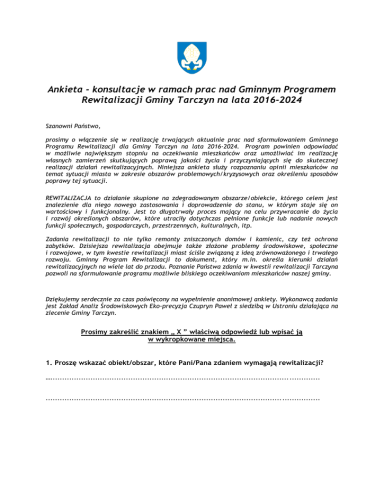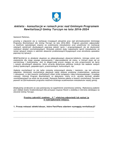 Ankieta - konsultacje w ramach prac nad Gminnym Programem Rewitalizacji Gminy Tarczyn na lata 2016-2024 Szanowni Państwo, prosimy o włączenie się w realizację trwających aktualnie prac nad sformułowaniem Gminnego Programu Rewitalizacji dla Gminy Tarczyn na lata 2016-2024. Program powinien odpowiadać w możliwie największym stopniu na oczekiwania mieszkańców oraz umożliwiać im realizację własnych zamierzeń skutkujących poprawą jakości życia i przyczyniających się do skutecznej realizacji działań rewitalizacyjnych. Niniejsza ankieta służy rozpoznaniu opinii mieszkańców na temat sytuacji miasta w zakresie obszarów problemowych/kryzysowych oraz określeniu sposobów poprawy tej sytuacji. REWITALIZACJA to działanie skupione na zdegradowanym obszarze/obiekcie, którego celem jest znalezienie dla niego nowego zastosowania i doprowadzenie do stanu, w którym staje się on wartościowy i funkcjonalny. Jest to długotrwały proces mający na celu przywracanie do życia i rozwój określonych obszarów, które utraciły dotychczas pełnione funkcje lub nadanie nowych funkcji społecznych, gospodarczych, przestrzennych, kulturalnych, itp. Zadania rewitalizacji to nie tylko remonty zniszczonych domów i kamienic, czy też ochrona zabytków. Dzisiejsza rewitalizacja obejmuje także złożone problemy środowiskowe, społeczne i rozwojowe, w tym kwestie rewitalizacji miast ściśle związaną z ideą zrównoważonego i trwałego rozwoju. Gminny Program Rewitalizacji to dokument, który m.in. określa kierunki działań rewitalizacyjnych na wiele lat do przodu. Poznanie Państwa zdania w kwestii rewitalizacji Tarczyna pozwoli na sformułowanie programu możliwie bliskiego oczekiwaniom mieszkańców naszej gminy. Dziękujemy serdecznie za czas poświęcony na wypełnienie anonimowej ankiety. Wykonawcą zadania jest Zakład Analiz Środowiskowych Eko-precyzja Czupryn Paweł z siedzibą w Ustroniu działająca na zlecenie Gminy Tarczyn. Prosimy zakreślić znakiem „ X ” właściwą odpowiedź lub wpisać ją w wykropkowane miejsca. 1. Proszę wskazać obiekt/obszar, które Pani/Pana zdaniem wymagają rewitalizacji? …..................................................................................................... ............. .................................................................................................... ................ 2. Jakie problemy techniczne Pani/Pan zdaniem występują na wybranym przez Pani/Pana obszarze? Brak problemu RODZAJ PROBLEMU Niskie zagrożenie problemem Średnie zagrożenie problemem Wysokie zagrożenie problemem Brak infrastruktury technicznej (np. instalacja c.o., wod.-kan., gaz) Zły stan techniczny obiektów Zdewastowane i opuszczone tereny Brak boisk, placów zabaw Stan dróg i chodników Małe zasoby mieszkaniowe Brak terenów zielonych i spacerowych Brak ścieżek rowerowych Słaba komunikacja Niedostateczna liczba miejsc parkingowych Stan zabytków Zanieczyszczenie środowiska Inne - jakie ………………… 3. Jakie problemy społeczne Pani/Pan zdaniem występują na wybranym przez Pani/Pana obszarze? RODZAJ PROBLEMU Brak problemu Niskie zagrożenie problemem Patologie społeczne (alkoholizm, narkomania, przemoc w rodzinie) Uciążliwe sąsiedztwo Słaba integracja lokalnej społeczności Słaba współpraca między instytucjami publicznymi a mieszkańcami Chuligaństwo, wandalizm, przestępczość Bezdomność Utrudniony dostęp do dobrych szkół Brak dostępu do 2 Średnie zagrożenie problemem Wysokie zagrożenie problemem nowoczesnej technologii Emigracja z miasta młodych Bieda Inne - jakie ………………… 4. Czy jest Pani/Pan zadowolona/y z aktualnych warunków miejsca zamieszkania? TAK NIE Metryczka: płeć: Kobieta wiek: poniżej 18 lat 18-30 31-50 51-65 ponad 65 Mężczyzna Status na rynku pracy pracujący własna działalność gospodarcza bezrobotny uczeń/student emeryt/rencista Miejsce zamieszkania Prosimy o wypełnienie ankiety do dnia 30.09.2016 r. Wypełnioną ankietę prosimy o pozostawienie ankieterowi lub dostarczenie na adres Urzędu Gminy. Ankieta jest również dostępna w Urzędzie Gminy oraz na stronie internetowej Urzędu. 3