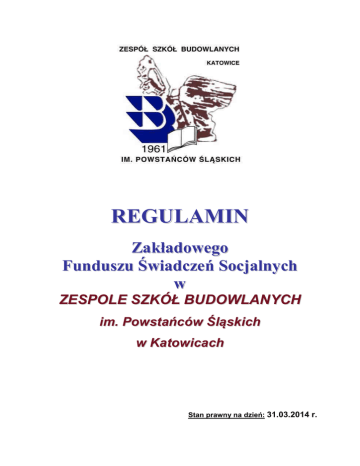 REGULAMIN Zakładowego Funduszu Świadczeń Socjalnych w ZESPOLE SZKÓŁ BUDOWLANYCH im. Powstańców Śląskich w Katowicach Stan prawny na dzień: 31.03.2014 r. REGULAMIN ZFŚS Zespół Szkół Budowlanych im. Powstańców Śląskich w Katowicach PODSTAWA PRAWNA: 1. Ustawa z dnia 4 marca 1994 r. o zakładowym funduszu świadczeń socjalnych (Dz. U. z 1994 r. Nr 43 poz. 163 z późn. zm.), 2. Ustawa z dnia 26 stycznia 1982 r. – Karta Nauczyciela (tekst jednolity Dz. U. 2014 r. Nr 0 poz 191), 3. Ustawa z dnia 26 czerwca 1974 r. – Kodeks Pracy (Dz. U. z 1998 r. nr 21, poz. 94), 4. Ustawa z dnia 6 czerwca 1997 r. – kodeks Karny (Dz. U. z 1997 nr 88 poz. 553 z późn. zm.) 5. Ustawa z dnia 26 lipca 1991 r. o podatku dochodowym od osób fizycznych (Dz. U. 2012 r. Nr 0 poz 361 z późn. zm.) 6. Ustawa z dnia 29 sierpnia 1997 r. o ochronie danych osobowych (Dz. U. z 1997 r. nr 133, poz. 833 z późn. zm.) 7. Ustawa z dnia 11 marca 2004 r. o podatku od towarów i usług (tekst jednolity Dz. U. z 2004 r. nr 54, poz. 535 z późn. zm.) 8. Rozporządzenie Ministra Pracy i Polityki Socjalnej z dnia 9 marca 2009 r. w sprawie sposobu ustalania przeciętnej liczby zatrudnionych w celu naliczania odpisu na zakładowy fundusz świadczeń socjalnych (Dz. U. z 2009 nr 43, poz. 349) 9. Ustawa z dnia 23 maja 1991 r. o związkach zawodowych (Dz. U. 1991 nr 55, poz. 234 z późn. zm.) 2 REGULAMIN ZFŚS Zespół Szkół Budowlanych im. Powstańców Śląskich w Katowicach SPIS TREŚCI: Rozdział I POSTANOWIENIA OGÓLNE. ............................................................................... 4 Rozdział II OSOBY UPRAWNIONE DO ŚWIADCZEŃ. ....................................................... 6 Rozdział III PRZEZNACZENIE FUNDUSZU. ........................................................................ 7 Rozdział IV ZASADY PRZYZNAWANIA ŚWIADCZEŃ Z FUNDUSZU. ........................... 7 Rozdział V SPOSÓB PRZYZNAWANIA ŚWIADCZEŃ Z FUNDUSZU. ............................. 9 Rozdział VI POSTANOWIENIA KOŃCOWE. ...................................................................... 12 ZAŁĄCZNIKI: Załącznik nr 1 – Wniosek o przyznanie dofinansowania wypoczynku pracownika, uprawnionych członków rodziny wraz z oświadczeniem o dochodach Załącznik nr 2 – Wniosek o przyznanie dofinansowania wypoczynku emeryta/rencisty, uprawnionych członków rodziny wraz z oświadczeniem o dochodach Załącznik nr 3 – Wniosek o przyznanie dofinansowania wypoczynku osoby przebywającej na świadczeniu kompensacyjnym, uprawnionych członków rodziny wraz z oświadczeniem o dochodach Załącznik nr 4 – Wniosek o przyznanie zapomogi wraz z oświadczeniem o dochodach Załącznik nr 5 – Wniosek o przyznanie zwrotnej pożyczki mieszkaniowej Załącznik nr 6 – Wzór umowy o przyznanie zwrotnej pożyczki na cele mieszkaniowe dla pracowników Załącznik nr 7 – Wzór umowy o przyznanie zwrotnej pożyczki na cele mieszkaniowe dla emerytów/rencistów Załącznik nr 8 – Regulamin Komisji Socjalnej 3 REGULAMIN ZFŚS Zespół Szkół Budowlanych im. Powstańców Śląskich w Katowicach Rozdział I. POSTANOWIENIA OGÓLNE § 1. Regulamin Świadczeń Socjalnych zwany dalej regulaminem ZFŚS opracowuje Dyrektor Szkoły w uzgodnieniu z organizacjami związkowymi, działającymi w Zespole Szkół Budowlanych im. Powstańców Śląskich w Katowicach. § 2. Ilekroć w regulaminie jest mowa o: 1. szkole, rozumie się przez to Zespół Szkół Budowlanych im. Powstańców Śląskich w Katowicach, 2. funduszu, rozumie się przez to Zakładowy Fundusz Świadczeń Socjalnych (ZFŚS) § 3. Regulamin określa w szczególności: 1. osoby uprawnione do korzystania ze świadczeń i pomocy ZFŚS, 2. cele, na które przeznacza się środki ZFŚS, 3. zasady, warunki przyznawania świadczeń i pomocy z ZFŚS. § 4. Fundusz tworzy się z corocznego odpisu podstawowego, naliczanego w stosunku do przeciętnej liczby zatrudnionych. § 5. Coroczny odpis podstawowy tworzy się z: 1. odpisu dla pracowników pedagogicznych w wysokości, ustalonej na podstawie art. 53 Karty Nauczyciela. Wysokość odpisu jest iloczynem planowanej, przeciętnej w danym roku kalendarzowym, liczby nauczycieli zatrudnionych w pełnym i niepełnym wymiarze zajęć (po przeliczeniu na pełny wymiar zajęć) skorygowanej w końcu roku do faktycznej przeciętnej liczby zatrudnionych nauczycieli (po przeliczeniu na pełny wymiar zajęć) i 110% kwoty bazowej, określonej corocznie w ustawie budżetowej dla nauczycieli, 2. odpisu dla emerytów i rencistów byłych nauczycieli lub nauczycieli pobierających świadczenie kompensacyjne na podstawie art. 53 Karty Nauczyciela. Wysokość odpisu stanowi 5% pobieranych emerytur, rent oraz nauczycielskich świadczeń kompensacyjnych, 3. odpisu dla pracowników niebędących nauczycielami na podstawie art.5 ust.2 ustawy o zakładowym funduszu świadczeń socjalnych. Wysokość odpisu na jednego zatrudnionego wynosi 37,5% przeciętnego wynagrodzenia miesięcznego w gospodarce narodowej w roku poprzednim lub drugim półroczu roku poprzedniego, jeżeli przeciętne wynagrodzenie z tego okresu stanowi kwotę wyższą, 4. odpisu dla emerytów i rencistów niebędących nauczycielami na podstawie art. 5 ust.5 ustawy o zakładowym funduszu świadczeń socjalnych. Wysokość odpisu na jednego uprawnionego wynosi 6,25% przeciętnego wynagrodzenia miesięcznego w gospodarce narodowej w roku poprzednim lub drugim półroczu roku poprzedniego, jeżeli przeciętne wynagrodzenie z tego okresu stanowi kwotę wyższą. 4 REGULAMIN ZFŚS § 6. Zespół Szkół Budowlanych im. Powstańców Śląskich w Katowicach Fundusz zwiększa się o: 1. darowizny oraz zapisy osób fizycznych i prawnych, 2. odsetki od środków Funduszu, 3. przychody z tytułu sprzedaży, dzierżawy i likwidacji środków trwałych służących działalności socjalnej w części nieprzeznaczonej na utrzymanie lub odtworzenie zakładowych obiektów socjalnych, 4. wpł