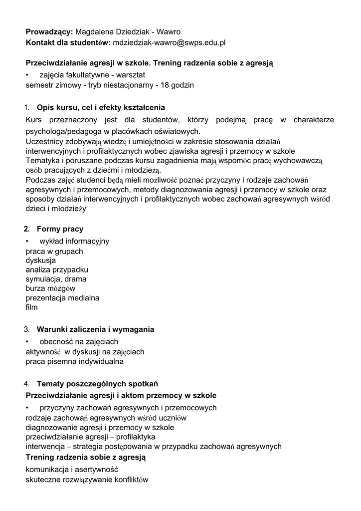 Prowadzący: Magdalena Dziedziak Wawro Kontakt dla studentów: mdziedziak[email protected] Przeciwdziałanie agresji w szkole. Trening radzenia sobie z agresją • zajęcia fakultatywne warsztat semestr zimowy tryb niestacjonarny 18 godzin 1. Opis kursu, cel i efekty kształcenia Kurs przeznaczony jest dla studentów, którzy podejmą pracę w charakterze psychologa/pedagoga w placówkach oświatowych. Uczestnicy zdobywają wiedzę i umiejętności w zakresie stosowania działań interwencyjnych i profilaktycznych wobec zjawiska agresji i przemocy w szkole Tematyka i poruszane podczas kursu zagadnienia mają wspomóc pracę wychowawczą osób pracujących z dziećmi i młodzieżą. Podczas zajęć studenci będą mieli możliwość poznać przyczyny i rodzaje zachowań agresywnych i przemocowych, metody diagnozowania agresji i przemocy w szkole oraz sposoby działań interwencyjnych i profilaktycznych wobec zachowań agresywnych wśród dzieci i młodzieży 2. Formy pracy • wykład informacyjny praca w grupach dyskusja analiza przypadku symulacja, drama burza mózgów prezentacja medialna film 3. Warunki zaliczenia i wymagania • obecność na zajęciach aktywność w dyskusji na zajęciach praca pisemna indywidualna 4. Tematy poszczególnych spotkań Przeciwdziałanie agresji i aktom przemocy w szkole • przyczyny zachowań agresywnych i przemocowych rodzaje zachowań agresywnych wśród uczniów diagnozowanie agresji i przemocy w szkole przeciwdziałanie agresji – profilaktyka interwencja – strategia postępowania w przypadku zachowań agresywnych Trening radzenia sobie z agresją komunikacja i asertywność skuteczne rozwiązywanie konfliktów praca z systemem wartości radzenie sobie z emocjami i stresem trening rozwoju twórczości pozytywny obraz siebie – samoocena, poczucie własnej wartości prawidłowe relacje interpersonalne pozytywna energia i optymizm 5. Literatura do zajęć www.szkolabezprzemocy.pl www.przemocwszkole.org.pl 6. Biogram prowadzącego zajęcia Magdalena Dziedziak – Wawro jest psychologiem. Ukończyła studia podyplomowe z zakresu zarządzania zasobami ludzkimi oraz coachingu i mentoringu. Pracuje w szkole ponadgimnazjalnej jako psycholog. Ponadto zajmuje się projektowaniem i prowadzeniem szkoleń z zakresu umiejętności społecznych. Pracowała również w Poradni Psychologiczno – Pedagogicznej i w Telefonie Zaufania. Publikacje: DziedziakWawro M.: „Sposoby na niedobre myśli i czyny”, w: Psychologia w szkole, 2012, nr 4 (36) Kielce, Wydawnictwo Charaktery DziedziakWawro M.: „Energią w wypalenie” w: Psychologia w szkole, 2012, nr 3 (35) Kielce, Wydawnictwo Charaktery DziedziakWawro M.: „Szczęśliwi nauczyciele” w: Psychologia w szkole, 2011, nr 4 (32) Kielce, Wydawnictwo Charaktery