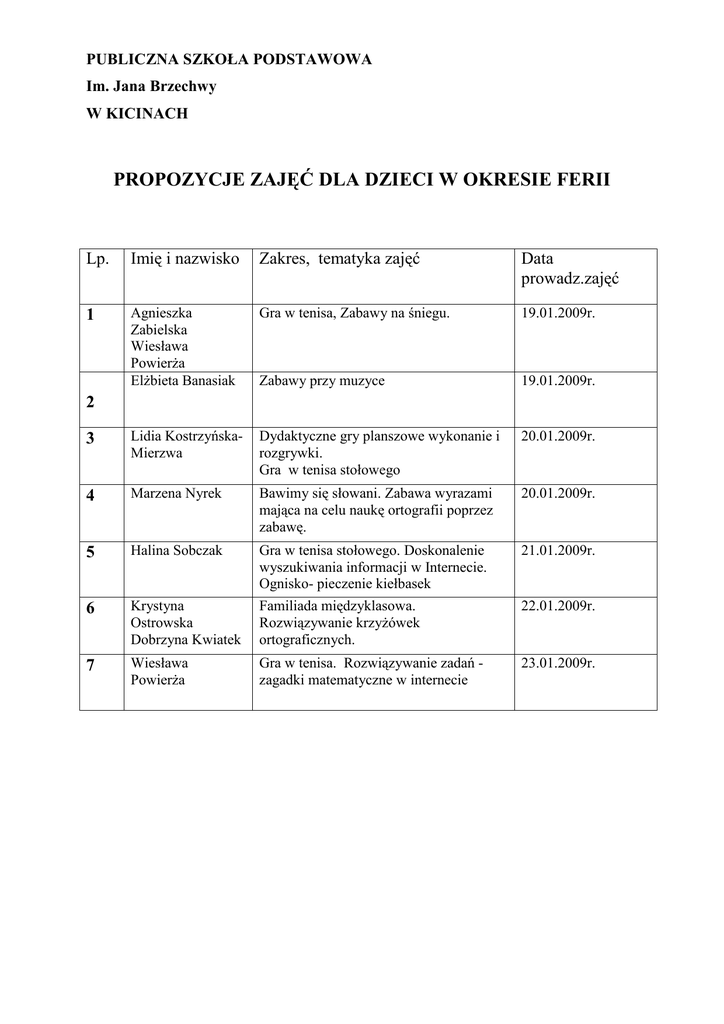 PUBLICZNA SZKOŁA PODSTAWOWA Im. Jana Brzechwy W KICINACH PROPOZYCJE ZAJĘĆ DLA DZIECI W OKRESIE FERII Lp. Imię i nazwisko Zakres, tematyka zajęć Data prowadz.zajęć 1 Agnieszka Zabielska Wiesława PowierŜa ElŜbieta Banasiak Gra w tenisa, Zabawy na śniegu. 19.01.2009r. Zabawy przy muzyce 19.01.2009r. 2 3 Lidia KostrzyńskaMierzwa Dydaktyczne gry planszowe wykonanie i rozgrywki. Gra w tenisa stołowego 20.01.2009r. 4 Marzena Nyrek Bawimy się słowani. Zabawa wyrazami mająca na celu naukę ortografii poprzez zabawę. 20.01.2009r. 5 Halina Sobczak Gra w tenisa stołowego. Doskonalenie wyszukiwania informacji w Internecie. Ognisko- pieczenie kiełbasek 21.01.2009r. 6 Krystyna Ostrowska Dobrzyna Kwiatek Familiada międzyklasowa. Rozwiązywanie krzyŜówek ortograficznych. 22.01.2009r. 7 Wiesława PowierŜa Gra w tenisa. Rozwiązywanie zadań zagadki matematyczne w internecie 23.01.2009r.