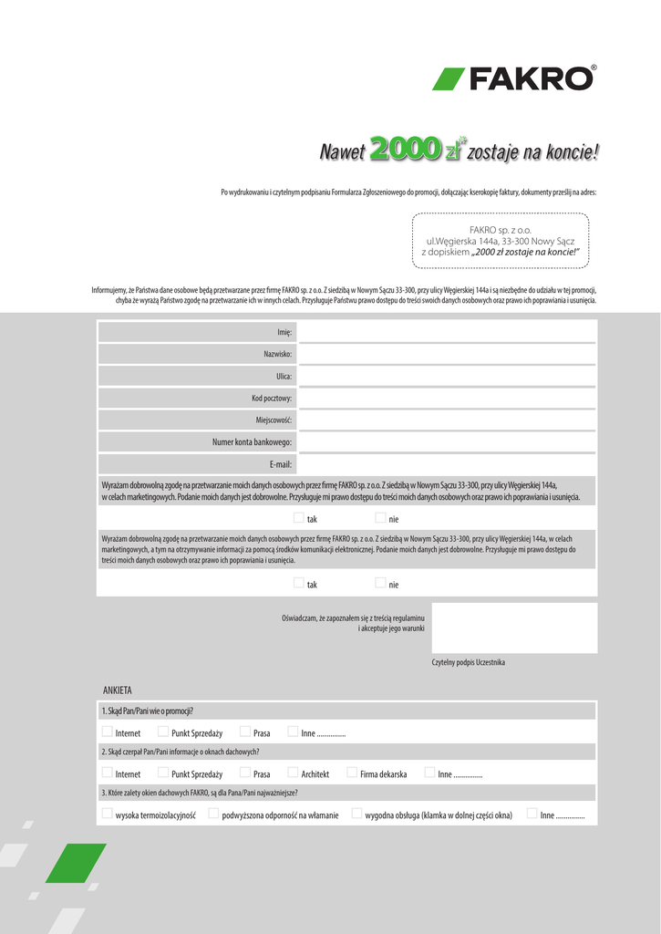 Nawet 2 zł* zostaje na koncie! Po wydrukowaniu i czytelnym podpisaniu Formularza Zgłoszeniowego do promocji, dołączając kserokopię faktury, dokumenty prześlij na adres: FAKRO sp. z o.o. ul.Węgierska 144a, 33-300 Nowy Sącz z dopiskiem „2000 zł zostaje na koncie!” Informujemy, że Państwa dane osobowe będą przetwarzane przez firmę FAKRO sp. z o.o. Z siedzibą w Nowym Sączu 33-300, przy ulicy Węgierskiej 144a i są niezbędne do udziału w tej promocji, chyba że wyrażą Państwo zgodę na przetwarzanie ich w innych celach. Przysługuje Państwu prawo dostępu do treści swoich danych osobowych oraz prawo ich poprawiania i usunięcia. Imię: Nazwisko: Ulica: Kod pocztowy: Miejscowość: Numer konta bankowego: E-mail: Wyrażam dobrowolną zgodę na przetwarzanie moich danych osobowych przez firmę FAKRO sp. z o.o. Z siedzibą w Nowym Sączu 33-300, przy ulicy Węgierskiej 144a, w celach marketingowych. Podanie moich danych jest dobrowolne. Przysługuje mi prawo dostępu do treści moich danych osobowych oraz prawo ich poprawiania i usunięcia. tak nie Wyrażam dobrowolną zgodę na przetwarzanie moich danych osobowych przez firmę FAKRO sp. z o.o. Z siedzibą w Nowym Sączu 33-300, przy ulicy Węgierskiej 144a, w celach marketingowych, a tym na otrzymywanie informacji za pomocą środków komunikacji elektronicznej. Podanie moich danych jest dobrowolne. Przysługuje mi prawo dostępu do treści moich danych osobowych oraz prawo ich poprawiania i usunięcia. tak nie Oświadczam, że zapoznałem się z treścią regulaminu i akceptuje jego warunki Czytelny podpis Uczestnika ANKIETA 1. Skąd Pan/Pani wie o promocji? Internet Punkt Sprzedaży Prasa Inne ............... 2. Skąd czerpał Pan/Pani informacje o oknach dachowych? Internet Punkt Sprzedaży Prasa Architekt Firma dekarska Inne ............... 3. Które zalety okien dachowych FAKRO, są dla Pana/Pani najważniejsze? wysoka termoizolacyjność podwyższona odporność na włamanie wygodna obsługa (klamka w dolnej części okna) Inne ...............