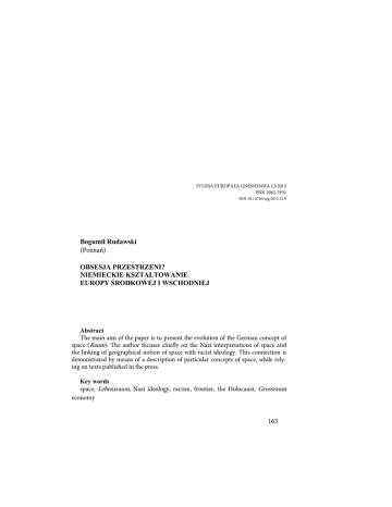 STUDIA EUROPAEA GNESNENSIA 12/2015 ISSN 2082-5951 DOI 10.14746/seg.2015.12.9 Bogumił Rudawski (Poznań) OBSESJA PRZESTRZENI? NIEMIECKIE KSZTAŁTOWANIE EUROPY ŚRODKOWEJ I WSCHODNIEJ Abstract The main aim of the paper is to present the evolution of the German concept of space (Raum). The author focuses chiefly on the Nazi interpretations of space and the linking of geographical notion of space with racist ideology. This connection is demonstrated by means of a description of particular concepts of space, while relying on texts published in the press. Key words space, Lebensraum, Nazi ideology, racism, frontier, the Holocaust, Grossraum economy 163 STUDIA EUROPAEA GNESNENSIA 12/2015 · IDEE „1 września 1939 roku byliśmy jeszcze narodem bez przestrzeni, a osiemnaście dni później – pod koniec kampanii przeciw Polsce – narodem z przestrzenią”1. Te słowa wypowiedział Arthur Greiser, nazistowski namiestnik Rzeszy w Kraju Warty, na uniwersytecie w Kilonii w czerwcu 1942 r. W wykładzie podkreślał wyraźnie, że wojna oznaczała nowy rozdział w historii Niemiec – zdobycie przestrzeni. W rozumieniu Greisera i jego współczesnych było to ukoronowanie wieloletniej walki, niekoniecznie prowadzonej wyłącznie na polach wojennych, o Wschód. Celem niniejszego artykułu jest wyjaśnienie, dlaczego właśnie walka o Wschód i przestrzeń na Wschodzie zajmowała tak ważne miejsce w historii Niemiec. Ukazana zostanie ewolucja niemieckiego myślenia o przestrzeni na przykładzie Europy Środkowej i Wschodniej poprzez analizę tekstów niemieckich intelektualistów. Artykuł podzielony został na trzy części. W pierwszej opisane zostały początki refleksji nad ideą wielkoprzestrzenną, ze szczególnym zwróceniem uwagi na koncepcje Friedricha Ratzla i podstawy sformułowanej przez niego na gruncie nauki niemieckiej geografii politycznej. Scharakteryzowane zostaną tu także inne koncepcje przestrzenne, popularne w niemieckiej myśli politycznej do 1918 r. Wśród nich znalazła się przede wszystkim teoria Europy Środkowej Friedricha Naumanna. Druga część artykułu koncentruje się chronologicznie na okresie Republiki Weimarskiej i początkach Trzeciej Rzeszy. Omówione w niej zostały, obok wpływowej i niezwykle popularnej koncepcji ziemi kulturowej i narodowej Albrechta Pencka, inne idee przestrzenne, intelektualnie istotne dla narodowego socjalizmu. Wreszcie trzecia część pracy jest prezentacją nazistowskiego obłędu ideologicznego w kontekście pomysłu całkowitej germanizacji przestrzeni wschodniej. Tutaj została podniesiona przede wszystkim kwestia rozumienia przestrzeni w sposób rasistowski wraz z tego zbrodniczymi konsekwencjami. Główną osią narracyjną tej części jest ukazanie pomysłów na germanizację przestrzeni środkowo- i wschodnioeuropejskiej na tle nazistowskiej polityki rasistowskiej. Całości rozważań towarzyszy namysł nad tym, w jaki sposób początkowo neutralne myślenie o przestrzeni mogło przeistoczyć się zaledwie w ciągu kilkudziesięciu lat w ludobójczy mechanizm. 1 A. Greiser, Odbudowa Wschodu, [w:] „Niemiecki Wschód”. Wyobrażenia – misja – dziedzictwo, oprac. Ch. Kleβmann, Poznań 2014, s. 182. 164 BOGUMIŁ RUDAWSKI, OBSESJA PRZESTRZENI? Dodatkowo, na marginesie głównych rozmyślań, podjęte zostały takie zagadnienia jak niemiecka konstrukcja Europy Środkowej czy idea niestałej niemieckiej granicy wschodniej – frontier. PIERWSZE KONCEPCJE PRZESTRZENNE. NIEMIECKA EUROPA ŚRODKOWA Jedną z pierwszych niemieckich teorii, w której przedstawiono wizję Europy Środkowej i Wschodniej, była idea „Europy Środkowej” (Mitteleuropa). Narodziła się ona w początkach XIX w. Pierwotnie była pojęciem wyłącznie geograficznym, odnoszącym się do rozważań wokół geograficznego centrum Europy i uznania Niemiec za państwo środka. Sama dyskusja o Europie Środkowej przybierała jednak na sile wraz z kolejnymi odsłonami politycznych kontrowersji i debat wokół zjednoczenia Niemiec i sposobu jego dokonania (rozwiązanie wielkoniemieckie versus rozwiązanie małoniemieckie). Podczas obrad Parlamentu we Frankfurcie nad Menem w okresie Wiosny Ludów nastąpiło upolitycznienie tej idei. Dla parlamentarzystów „Europa Środkowa” stała się przestrzenią ekspansji niemieckiej myśli politycznej, języka, rozwoju kulturalnego czy też interesów gospodarczych. Sama „Europa Środkowa” zaczęła przybierać pewien konkretny, lecz nadal słabo zarysowany kształt terytorialny. W wyobrażeniu tym tkwiło jednakże zarzewie konfliktu, bowiem granice niemieckiej ekspansji kulturalnej bądź społeczno-gospodarczej wykraczały poza etniczne obszary Niemiec2. Rozmyślania o „Europie Środkowej” jako potencjalnej przestrzeni kontynentalnej ekspansji zyskały dojrzałą postać pod koniec XIX w., wraz z emancypacją nowej nauki, jaką była geografia polityczna. W Niemczech jej podstawy sformułował Friedrich Ratzel, zoolog z wykształcenia. Jego poglądy były w swej istocie jedną z pierwszych prób stworzenia teorii wielkiej przestrzeni. Przede wszystkim Ratzel dowodził, że jakikolwiek rozwój państwa związany jest z „pozyskaniem przestrzeni”3, która jest czynnikiem nie tylko geograficznym, ale także i politycznym. W przekonaniu autora historyczna wielkość narodu oraz jego znaczenie polityczne były ściśle powiązane z wielkością przestrzenną4. Odnosząc się do współczesnych sobie realiów politycznych 2 A. Wolf-Powęska, E. Schulz, Przestrzeń i polityka w niemieckiej myśli politycznej XIX i XX wieku, [w:] Przestrzeń i polityka. Z dziejów niemieckiej myśli politycznej, Poznań 2000, s. 28-31. 3 F. Ratzel, Politische Geographie. Geografia polityczna, [w:] Przestrzeń i polityka, s. 228-229. 4 Ibidem, s. 227-231. 165 STUDIA EUROPAEA GNESNENSIA 12/2015 · IDEE epoki kolonialnej, zauważył on, że „wielka przestrzeń to wyraz wszechobecnej tendencji rozwoju narodów i państw”5. 