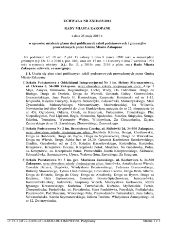 UCHWAŁA NR XXII/335/2016 RADY MIASTA ZAKOPANE z dnia 25 maja 2016 r. w sprawie: ustalenia planu sieci publicznych szkół podstawowych i gimnazjów prowadzonych przez Gminę Miasto Zakopane Na podstawie art. 18 ust. 2 pkt. 15 ustawy z dnia 8 marca 1990 roku o samorządzie gminnym (t.j: Dz. U. z 2016 r, poz. 446), oraz art. 17 ust. 1 i 4 ustawy z dnia 7 września 1991 roku o systemie oświaty (t.j.: Dz. U. z 2015r. poz. 2156 z późn. zm.) Rada Miasta Zakopane uchwala, co następuje: § 1. Ustala się plan sieci publicznych szkół podstawowych prowadzonych przez Gminę Miasto Zakopane: 1) Szkoła Podstawowa z Oddziałami Integracyjnymi Nr 1 im. Heleny Marusarzówny, ul. Orkana 6, 34-500 Zakopane, wraz obwodem szkoły obejmującym ulice: Aleje 3 Maja, Asnyka, Bilinówka, Bogdańskiego, Cichej Wody, Do Tadziaków, Droga do Białego, Droga do Daniela, Droga do Wantuli, Generała Galicy, Grunwaldzka, Goszczyńskiego, Jana Pawła II, Kamockiego, Kasprusie, Kościuszki od nr 1-12, Krupówki, Księdza Curzydły, Księdza Stolarczyka, Łukaszówki, Makuszyńskiego, Małe Żywczańskie, Małaszyńskiego, Marusarzówny, Modrzejewskiej, Na Wilcznik, Nowotarska (od ulicy Krupówki do ulicy Sienkiewicza, parzyste do nr 22, nieparzyste do nr 45), Ogrodowa, Orkana, Ornak, os. Kasprusie, Partyzantów, Piłsudskiego, Plac Niepodległości, Pod Lipkami, Regle, Słoneczna, Spadowiec, Staszica, Strążyska, Struga, Szkolna, Tetmajera, Weteranów Wojny, Witkiewicza, Za Cieszynianką, Zająca, Zamoyskiego do nr 11, Zaruskiego, Zborowskiego, Żeromskiego. 2) Szkoła Podstawowa Nr 2 im. Bronisława Czecha, ul. Skibówki 2d, 34-500 Zakopane, wraz obwodem szkoły obejmującym ulice: Bachledy Klimka, Brzegi, Choćkowskie, Droga na Buńdówki, Droga do Rojów, Droga na Szymaszkową, Droga do Walczaków, Droga na Wierch, Droga Zubka bez nr 28,30, Generała Kazimierza Sosnkowskiego, Gładkie, Gubałówka od nr 215, Księdza Kaszelewskiego, Kościeliska, Kościelna, Krzeptówki, Krzeptówki Boczne, Krzeptówki Potok, Mraźnica, Na Gubałówkę, Polna, os. Krzeptówki, os. Krzeptówki Potok, Przewodnika Józefa Krzeptowskiego, Skibówki, Sobczakówka, Szymaszkowa, Ubocz, Walowa Góra, Zaryckiego, Za Strugiem. 3) Szkoła Podstawowa Nr 3 im. gen. Mariusza Zaruskiego, ul. Karłowicza 6, 34-500 Zakopane, wraz obwodem szkoły obejmującym ulice: Antałówka, Antałówka na Wierch, Oswalda Balzera, Bogówka, Władysława Broniewskiego, Tadeusza Brzozowskiego, Bulwary Słowackiego, Tytusa Chałubińskiego, Bronisława Czecha, Droga Brata Alberta, Droga do Bristolu, Droga do Olczy, Droga na Antałówkę, Droga na Bystre, Droga na Koziniec, Hala Gąsienicowa, Generała Boruty-Spiechowicza, Jaszczurówka, Jaszczurówka-Bory, Kalatówki, Kasprowy Wierch, Mieczysława Karłowicza, Józefa Ignacego Kraszewskiego, Kurierów Tatrzańskich, Kuźnice, Myślenickie Turnie, Oberconiówka, Pardałówka, os. Pardałówka, Stara Pardałówka, Paryskich, Podhalańska, Pocztowców, Pod Skocznią, Wincentego Pola, Przewodników Tatrzańskich, Jana Sabały, Salwatoriańska, Karola Szymanowskiego, Juliana Tuwima, Władysława Zamoyskiego od nr 12, Zwierzyniecka. Id: EC114F27-EA86-4FC4-8EB2-0D136409EB88. Podpisany Strona 1 z 3 4) Szkoła Podstawowa Nr 4 im. Marszałka Józefa Piłsudskiego, ul. Janosówka 15, 34-500 Zakopane, wraz obwodem szkoły obejmującym ulice: Gawlaki, Galicówka, Huty, Janosówka, Klusie, Mrowce, Piszczory, Rybkówka, Stachonie, Stary Młyn, Walkosze, Wojdyły, Topory. 5) Szkoła Podstawowa Nr 5 im. Janusza Korczaka, ul. Chramcówki 27, 34-500 Zakopane, wraz obwodem szkoły obejmującym ulice: Bachledzki Wierch, Brzozowa, Chramcówki, Chyców Potok, Ciągłówka, Do Samków, Gimnazjalna, Gubałówka do nr 214, Jagiellońska, Kasprowicza od nr 2 do nr 36 i od nr 1 do nr 35, Kamieniec, Kościuszki od nr 13, Kotelnica, Nowotarska (od Ronda Solidarności do ul. Sienkiewicza, parzyste od nr 22, nieparzyste od nr 45), os. Szymony, Piaseckiego, Sienkiewicza, Smrekowa, Stary Kamieniec, Stroma, Szpitalna, Szymony, Tatary, Wierchowa. 6) Szkoła Podstawowa Nr 7 im. Kornela Makuszyńskiego, ul. Cyrhla 57, 34-500 Zakopane, wraz obwodem szkoły obejmującym ulice: Brzeziny, Chłabówka, Cyrhla, Hrube Niżne, Hrube Wyżne, Wyskówki, Zoniówka. 7) Szkoła Podstawowa Nr 9 im. Jana Kasprowicza, ul. Harenda 21, 34-500 Zakopane, wraz obwodem szkoły obejmującym ulice: Bachledy, Guty, Harenda, Kasprowicza od nr 37, Króle, Łosiówki, Spyrkówka, Ustup, Zwijacze. § 2. Ustala się plan sieci publicznych gimnazjów prowadzonych przez Gminę Miasto Zakopane: 1) Gimnazjum Nr 1 im. Olgi i Andrzeja Małkowskich, ul. Nowotarska 42, 34-500 Zakopane, wraz obwodem szkoły obejmującym ulice: Aleje 3 Maja (od ulicy Kościuszki w dół), Bachledy, Bachledy Klimka, Bachledzki Wierch, Bilinówka, Brzegi, Brzozowa, Ciągłówka, Cichej Wody, Choćkowskie, Chramcówki, Chyców Potok, Do Samków, Droga na Buńdówki, Droga do Rojów, Droga na Szymaszkową, Droga do Walczaków, Droga na Wierch, Droga Zubka bez nr 28,30, Generała Kazimierza Sosnkowskiego, Gimnazjalna, Gładkie, Gubałówka, Guty, Harenda, Jagiellońska, Jana Pawła II, Kamieniec, Kamockiego, Kasprowicza, Kasprusie, Księdza Kaszelewskiego, Księdza Stolarczyka, Kościeliska, Kościelna, Kościuszki, Kotelnica, Króle, Krupówki (od Poczty Głównej w dół), Krzeptówki, Krzeptówki Boczne, Krzeptówki Potok, Łosiówki, Łukaszówki, Małaszyńskiego, Mraźnica, Na Gubałówkę, Nowotarska, os. Kasprusie, os. Krzeptówki, os. Krzeptówki Potok, os. Szymony, Piaseckiego, Polna, Przewodnika Józefa Krzeptowskiego, Sienkiewicza (do ulicy Kościuszki), Skibówki, Słoneczna, Smrekowa, Sobczakówka, Spyrkówka, Stary Kamieniec, Stroma, Szkolna, Szpitalna, Szymony, Szymaszkowa, Tatary, Ubocz, Ustup, Walowa Góra, Wierchowa, Zaryckiego, Zaruskiego, Zborowskiego, Za Strugiem, Zwijacze. 2) Gimnazjum Nr 2 im. ks. prof. Józefa Tischnera, ul. Sienkiewicza 27, 34-500 Zakopane, wraz obwodem szkoły obe
