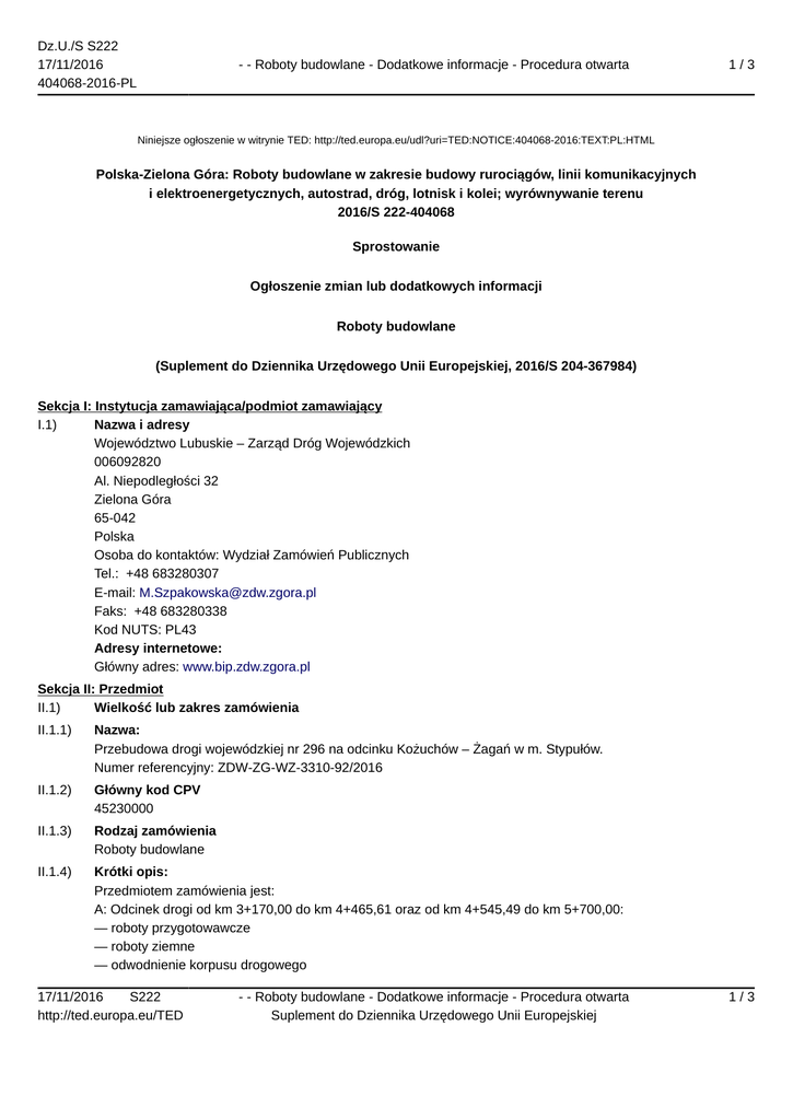 Dz.U./S S222 17/11/2016 404068-2016-PL - - Roboty budowlane - Dodatkowe informacje - Procedura otwarta 1/3 Niniejsze ogłoszenie w witrynie TED: http://ted.europa.eu/udl?uri=TED:NOTICE:404068-2016:TEXT:PL:HTML Polska-Zielona Góra: Roboty budowlane w zakresie budowy rurociągów, linii komunikacyjnych i elektroenergetycznych, autostrad, dróg, lotnisk i kolei; wyrównywanie terenu 2016/S 222-404068 Sprostowanie Ogłoszenie zmian lub dodatkowych informacji Roboty budowlane (Suplement do Dziennika Urzędowego Unii Europejskiej, 2016/S 204-367984) Sekcja I: Instytucja zamawiająca/podmiot zamawiający I.1) Nazwa i adresy Województwo Lubuskie – Zarząd Dróg Wojewódzkich 006092820 Al. Niepodległości 32 Zielona Góra 65-042 Polska Osoba do kontaktów: Wydział Zamówień Publicznych Tel.: +48 683280307 E-mail: [email protected] Faks: +48 683280338 Kod NUTS: PL43 Adresy internetowe: Główny adres: www.bip.zdw.zgora.pl Sekcja II: Przedmiot II.1) Wielkość lub zakres zamówienia II.1.1) Nazwa: Przebudowa drogi wojewódzkiej nr 296 na odcinku Kożuchów – Żagań w m. Stypułów. Numer referencyjny: ZDW-ZG-WZ-3310-92/2016 II.1.2) Główny kod CPV 45230000 II.1.3) Rodzaj zamówienia Roboty budowlane II.1.4) Krótki opis: Przedmiotem zamówienia jest: A: Odcinek drogi od km 3+170,00 do km 4+465,61 oraz od km 4+545,49 do km 5+700,00: — roboty przygotowawcze — roboty ziemne — odwodnienie korpusu drogowego 17/11/2016 S222 http://ted.europa.eu/TED - - Roboty budowlane - Dodatkowe informacje - Procedura otwarta Suplement do Dziennika Urzędowego Unii Europejskiej 1/3 Dz.U./S S222 17/11/2016 404068-2016-PL - - Roboty budowlane - Dodatkowe informacje - Procedura otwarta 2/3 — podbudowy — nawierzchnie — roboty wykończeniowe — urządzenia bezpieczeństwa ruchu — elementy ulic — zieleń drogowa — inne roboty B: Odcinek drogi od km 9+950,00 do km 10+500,00: — roboty przygotowawcze — roboty ziemne — podbudowy — nawierzchnie — roboty wykończeniowe — urządzenia bezpieczeństwa ruchu — inne roboty C: Likwidacja przejazdu kolejowego od km 4+465,61 do km 4+545,49: — roboty przygotowawcze — roboty ziemne — podbudowy — nawierzchnie — roboty wykończeniowe — urządzenia bezpieczeństwa ruchu Szczegółowy opis przedmiotu zamówienia oraz wymagania techniczne określone zostały w Rozdziale III SIWZ. Sekcja VI: Informacje uzupełniające VI.5) Data wysłania niniejszego ogłoszenia: 15/11/2016 VI.6) Numer pierwotnego ogłoszenia Numer ogłoszenia w Dz.Urz. UE – OJ/S: 2016/S 204-367984 Sekcja VII: Zmiany VII.1) Informacje do zmiany lub dodania VII.1.2) Tekst, który należy poprawić w pierwotnym ogłoszeniu Numer sekcji: III.1.3 Miejsce, w którym znajduje się tekst do modyfikacji: Zdolność techniczna i kwalifikacje zawodowe Zamiast: — kierownika budowy, posiadającego uprawnienia do kierowania robotami w zakresie dróg, w rozumieniu ustawy Prawo budowlane. Spełnianie warunku udziału w postępowaniu musi wykazać dowolny z Wykonawców wspólnie ubiegających się o udzielenie zamówienia. Powinno być: — kierownika budowy,posiadającego uprawnienia do kierowania robotami w zakresie dróg,w rozumieniu ustawy Prawo budowlane oraz doświadczenie zawodowe w zakresie pełnienia funkcji kierownika budowy lub kierownika robót drogowych lub inspektora nadzoru-specjalność inżynierska drogowa od początku realizacji,do zakończenia i rozliczenia inwestycji na co najmniej 1 zadaniu, polegającym na budowie, przebudowie, rozbudowie, wzmocnieniu lub remoncie(z wyłączeniem remontów cząstkowych) drogi/ulicy klasy Z lub wyższej o wartości nadzorowanych robót budowlanych nie mniej niż 3 000 000 PLN brutto. 17/11/2016 S222 http://ted.europa.eu/TED - - Roboty budowlane - Dodatkowe informacje - Procedura otwarta Suplement do Dziennika Urzędowego Unii Europejskiej 2/3 Dz.U./S S222 17/11/2016 404068-2016-PL - - Roboty budowlane - Dodatkowe informacje - Procedura otwarta 3/3 Spełnianie warunku udziału w postępowaniu musi wykazać dowolny z Wykonawców wspólnie ubiegających się o udzielenie zamówienia. Numer sekcji: IV.2.6 Miejsce, w którym znajduje się tekst do modyfikacji: Minimalny okres, w którym oferent będzie związany ofertą Zamiast: Oferta musi zachować ważność do: 27/01/2017. Powinno być: Oferta musi zachować ważność do: 30/01/2017. Numer sekcji: III.1.1 Zamiast: 2.3.2 W celu potwierdzenia braku podstaw do wykluczenia wykonawcy z udziału w postępowaniu wykonawca zobowiązany jest złożyć: Powinno być: 2.3.2 W celu potwierdzenia braku podstaw do wykluczenia wykonawcy z udziału w postępowaniu wykonawca zobowiązany jest złożyć dokumenty zgodne z rozporządzeniem Ministra Rozwoju z 26.7.2016 w sprawie rodzajów dokumentów jakich może żądać zamawiający od Wykonawcy w postępowaniu o udzielenie zamówienia (Dz.U. 2016 poz. 1126) określonych w par. 5 i 7 tj. Numer sekcji: IV.2.2 Zamiast: Data: 29/11/2016 Czas lokalny: 10:00 Powinno być: Data: 02/12/2016 Czas lokalny: 10:00 Numer sekcji: IV.2.7 Zamiast: Data: 29/11/2016 Czas lokalny: 10:30 Powinno być: Data: 02/12/2016 Czas lokalny: 10:30 VII.2) Inne dodatkowe informacje: 17/11/2016 S222 http://ted.europa.eu/TED - - Roboty budowlane - Dodatkowe informacje - Procedura otwarta Suplement do Dziennika Urzędowego Unii Europejskiej 3/3