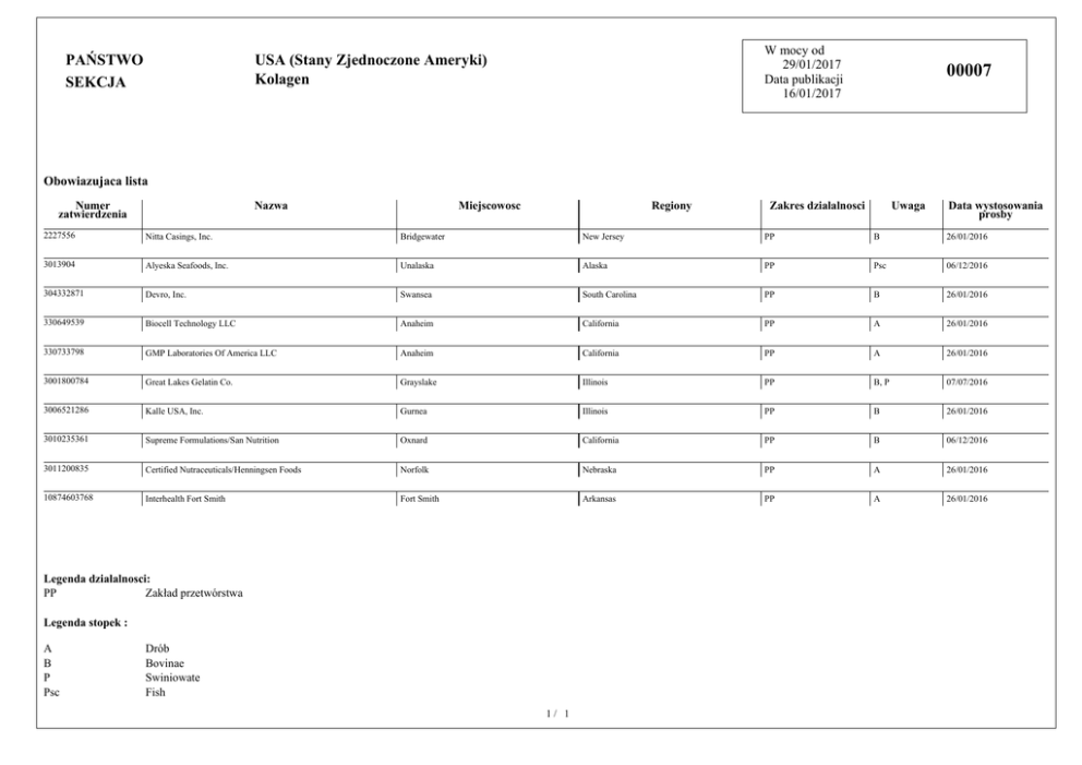 PAŃSTWO SEKCJA W mocy od 29/01/2017 Data publikacji 16/01/2017 USA (Stany Zjednoczone Ameryki) Kolagen 00007 Obowiazujaca lista Numer zatwierdzenia Nazwa Miejscowosc Regiony Zakres dzialalnosci Uwaga Data wystosowania prosby 2227556 Nitta Casings, Inc. Bridgewater New Jersey PP B 26/01/2016 3013904 Alyeska Seafoods, Inc. Unalaska Alaska PP Psc 06/12/2016 304332871 Devro, Inc. Swansea South Carolina PP B 26/01/2016 330649539 Biocell Technology LLC Anaheim California PP A 26/01/2016 330733798 GMP Laboratories Of America LLC Anaheim California PP A 26/01/2016 3001800784 Great Lakes Gelatin Co. Grayslake Illinois PP B, P 07/07/2016 3006521286 Kalle USA, Inc. Gurnea Illinois PP B 26/01/2016 3010235361 Supreme Formulations/San Nutrition Oxnard California PP B 06/12/2016 3011200835 Certified Nutraceuticals/Henningsen Foods Norfolk Nebraska PP A 26/01/2016 10874603768 Interhealth Fort Smith Fort Smith Arkansas PP A 26/01/2016 Legenda dzialalnosci: PP Zakład przetwórstwa Legenda stopek : A B P Psc Drób Bovinae Swiniowate Fish 1/ 1