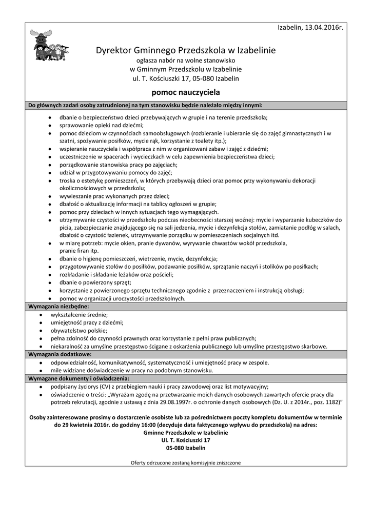 Izabelin, 13.04.2016r. Dyrektor Gminnego Przedszkola w Izabelinie ogłasza nabór na wolne stanowisko w Gminnym Przedszkolu w Izabelinie ul. T. Kościuszki 17, 05-080 Izabelin pomoc nauczyciela Do głównych zadao osoby zatrudnionej na tym stanowisku będzie należało między innymi: dbanie o bezpieczeostwo dzieci przebywających w grupie i na terenie przedszkola; sprawowanie opieki nad dziedmi; pomoc dzieciom w czynnościach samoobsługowych (rozbieranie i ubieranie się do zajęd gimnastycznych i w szatni, spożywanie posiłków, mycie rąk, korzystanie z toalety itp.); wspieranie nauczyciela i współpraca z nim w organizowani zabaw i zajęd z dziedmi; uczestniczenie w spacerach i wycieczkach w celu zapewnienia bezpieczeostwa dzieci; porządkowanie stanowiska pracy po zajęciach; udział w przygotowywaniu pomocy do zajęd; troska o estetykę pomieszczeo, w których przebywają dzieci oraz pomoc przy wykonywaniu dekoracji okolicznościowych w przedszkolu; wywieszanie prac wykonanych przez dzieci; dbałośd o aktualizację informacji na tablicy ogłoszeo w grupie; pomoc przy dzieciach w innych sytuacjach tego wymagających. utrzymywanie czystości w przedszkolu podczas nieobecności starszej woźnej: mycie i wyparzanie kubeczków do picia, zabezpieczanie znajdującego się na sali jedzenia, mycie i dezynfekcja stołów, zamiatanie podłóg w salach, dbałośd o czystośd łazienek, utrzymywanie porządku w pomieszczeniach socjalnych itd. w miarę potrzeb: mycie okien, pranie dywanów, wyrywanie chwastów wokół przedszkola, pranie firan itp. dbanie o higienę pomieszczeo, wietrzenie, mycie, dezynfekcja; przygotowywanie stołów do posiłków, podawanie posiłków, sprzątanie naczyo i stolików po posiłkach; rozkładanie i składanie leżaków oraz pościeli; dbanie o powierzony sprzęt; korzystanie z powierzonego sprzętu technicznego zgodnie z przeznaczeniem i instrukcją obsługi; pomoc w organizacji uroczystości przedszkolnych. Wymagania niezbędne: wykształcenie średnie; umiejętnośd pracy z dziedmi; obywatelstwo polskie; pełna zdolnośd do czynności prawnych oraz korzystanie z pełni praw publicznych; niekaralnośd za umyślne przestępstwo ścigane z oskarżenia publicznego lub umyślne przestępstwo skarbowe. Wymagania dodatkowe: odpowiedzialnośd, komunikatywnośd, systematycznośd i umiejętnośd pracy w zespole. mile widziane doświadczenie w pracy na podobnym stanowisku. Wymagane dokumenty i oświadczenia: podpisany życiorys (CV) z przebiegiem nauki i pracy zawodowej oraz list motywacyjny; oświadczenie o treści: „Wyrażam zgodę na przetwarzanie moich danych osobowych zawartych ofercie pracy dla potrzeb rekrutacji, zgodnie z ustawą z dnia 29.08.1997r. o ochronie danych osobowych (Dz. U. z 2014r., poz. 1182)” Osoby zainteresowane prosimy o dostarczenie osobiste lub za pośrednictwem poczty kompletu dokumentów w terminie do 29 kwietnia 2016r. do godziny 16:00 (decyduje data faktycznego wpływu do przedszkola) na adres: Gminne Przedszkole w Izabelinie Ul. T. Kościuszki 17 05-080 Izabelin Oferty odrzucone zostaną komisyjnie zniszczone