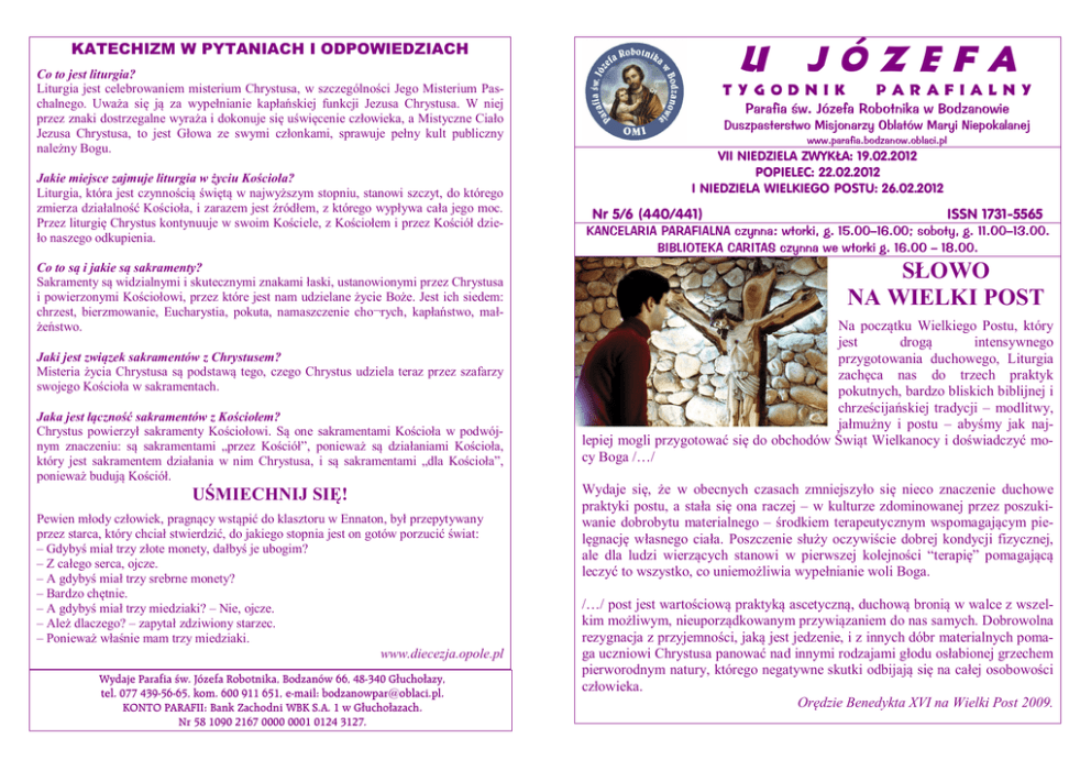 U KATECHIZM W PYTANIACH I ODPOWIEDZIACH Co to jest liturgia? Liturgia jest celebrowaniem misterium Chrystusa, w szczególności Jego Misterium Paschalnego. Uważa się ją za wypełnianie kapłańskiej funkcji Jezusa Chrystusa. W niej przez znaki dostrzegalne wyraża i dokonuje się uświęcenie człowieka, a Mistyczne Ciało Jezusa Chrystusa, to jest Głowa ze swymi członkami, sprawuje pełny kult publiczny należny Bogu. Jakie miejsce zajmuje liturgia w życiu Kościoła? Liturgia, która jest czynnością świętą w najwyższym stopniu, stanowi szczyt, do którego zmierza działalność Kościoła, i zarazem jest źródłem, z którego wypływa cała jego moc. Przez liturgię Chrystus kontynuuje w swoim Kościele, z Kościołem i przez Kościół dzieło naszego odkupienia. Co to są i jakie są sakramenty? Sakramenty są widzialnymi i skutecznymi znakami łaski, ustanowionymi przez Chrystusa i powierzonymi Kościołowi, przez które jest nam udzielane życie Boże. Jest ich siedem: chrzest, bierzmowanie, Eucharystia, pokuta, namaszczenie cho¬rych, kapłaństwo, małżeństwo. Jaki jest związek sakramentów z Chrystusem? Misteria życia Chrystusa są podstawą tego, czego Chrystus udziela teraz przez szafarzy swojego Kościoła w sakramentach. Jaka jest łączność sakramentów z Kościołem? Chrystus powierzył sakramenty Kościołowi. Są one sakramentami Kościoła w podwójnym znaczeniu: są sakramentami „przez Kościół”, ponieważ są działaniami Kościoła, który jest sakramentem działania w nim Chrystusa, i są sakramentami „dla Kościoła”, ponieważ budują Kościół. UŚMIECHNIJ SIĘ! Pewien młody człowiek, pragnący wstąpić do klasztoru w Ennaton, był przepytywany przez starca, który chciał stwierdzić, do jakiego stopnia jest on gotów porzucić świat: – Gdybyś miał trzy złote monety, dałbyś je ubogim? – Z całego serca, ojcze. – A gdybyś miał trzy srebrne monety? – Bardzo chętnie. – A gdybyś miał trzy miedziaki? – Nie, ojcze. – Ależ dlaczego? – zapytał zdziwiony starzec. – Ponieważ właśnie mam trzy miedziaki. www.diecezja.opole.pl Wydaje Parafia św. Józefa Robotnika, Bodzanów 66, 48-340 Głuchołazy, tel. 077 439-56-65, kom. 600 911 651, e-mail: [email protected]. KONTO PARAFII: Bank Zachodni WBK S.A. 1 w Głuchołazach. Nr 58 1090 2167 0000 0001 0124 3127. JÓZEFA TYGODNIK PARAFIALNY Parafia św. Józefa Robotnika w Bodzanowie Duszpasterstwo Misjonarzy Oblatów Maryi Niepokalanej www.parafia.bodzanow.oblaci.pl VII NIEDZIELA ZWYKŁA: 19.02.2012 POPIELEC: 22.02.2012 I NIEDZIELA WIELKIEGO POSTU: 26.02.2012 Nr 5/6 (440/441) ISSN 1731-5565 KANCELARIA PARAFIALNA czynna: wtorki, g. 15.00–16.00; soboty, g. 11.00–13.00. BIBLIOTEKA CARITAS czynna we wtorki g. 16.00 – 18.00. SŁOWO NA WIELKI POST Na początku Wielkiego Postu, który jest drogą intensywnego przygotowania duchowego, Liturgia zachęca nas do trzech praktyk pokutnych, bardzo bliskich biblijnej i chrześcijańskiej tradycji – modlitwy, jałmużny i postu – abyśmy jak najlepiej mogli przygotować się do obchodów Świąt Wielkanocy i doświadczyć mocy Boga /…/ Wydaje się, że w obecnych czasach zmniejszyło się nieco znaczenie duchowe praktyki postu, a stała się ona raczej – w kulturze zdominowanej przez poszukiwanie dobrobytu materialnego – środkiem terapeutycznym wspomagającym pielęgnację własnego ciała. Poszczenie służy oczywiście dobrej kondycji fizycznej, ale dla ludzi wierzących stanowi w pierwszej kolejności “terapię” pomagającą leczyć to wszystko, co uniemożliwia wypełnianie woli Boga. /…/ post jest wartościową praktyką ascetyczną, duchową bronią w walce z wszelkim możliwym, nieuporządkowanym przywiązaniem do nas samych. Dobrowolna rezygnacja z przyjemności, jaką jest jedzenie, i z innych dóbr materialnych pomaga uczniowi Chrystusa panować nad innymi rodzajami głodu osłabionej grzechem pierworodnym natury, którego negatywne skutki odbijają się na całej osobowości człowieka. Orędzie Benedykta XVI na Wielki Post 2009. OGŁOSZENIA DUSZPASTERSKIE ODNOWIENIE MISJI PARAFIALNEJ 22 – 26.02.2012 Środa Popielcowa, 22 lutego 2012 09.00 Msza św. z nauką. Posypanie głów popiołem. 13.30 MSZA ŚW. Z NAUKĄ DLA DZIECI. Posypanie głów popiołem. 17.00 Msza św. z nauką. Posypanie głów popiołem. Czwartek, 23 lutego 2012 09.00 Msza św. z nauką. 13.30 DROGA KRZYŻOWA I MSZA ŚW. DLA DZIECI. 17.00 Msza św. z nauką. Po Mszy św. nauka stanowa dla gimnazjalistów i młodzieży. Piątek, 24 lutego 2012 VII NIEDZIELA zwykła: 19.02.2012 1. 2. 3. 4. 5. 09.00 Msza św. z nauką. 13.30 OKAZJA DO SPOWIEDZI DLA KL. III, IV, V, VI. 14.00 MSZA ŚW. Z NAUKĄ DLA DZIECI. 16.30 Droga Krzyżowa. 17.00 Msza św. z nauką. Po Mszy św. nauka stanowa dla rodziców. 6. Bóg zapłać! rodzinom, które przygotowały kościół do niedzieli. W przyszłą sobotę o godz. 10.00 bardzo proszę następujące rodziny: Gargol Stanisław, Gutowski, Majcherczyk, Midor Artur, Kita, Marków, Tabisz, Maluśki Stefan. Począwszy od dzisiejszej niedzieli, poprzedzającej Środę Popielcową, przez trzy dni będzie miała miejsce adoracja Najśw. Sakramentu: dzisiaj między mszami; w poniedziałek i wtorek przed Popielcem – od godz. 16.00 – 17.00, a następnie Msza św. W Środę Popielcową rozpocznie się u nas odnowienie misji. Podczas Mszy św. o godz. 9.00 i 17.00 oraz o 13.30 dla dzieci poświęcenie popiołu i posypanie głów popiołem na znak podjęcia pokuty. Program odnowienia misji zawiera dzisiejszy tygodnik oraz wywieszony jest w gablotkach. W Popielec obowiązuje post ścisły, polegający na wstrzemięźliwości od pokarmów mięsnych i spożyciu jednego posiłku do syta w ciągu dnia. Pozostałe posiłki muszą zostać ograniczone co do ilości. Ten post obowiązuje wszystkich pomiędzy 18. a 60. rokiem życia. Wszystkich od 14. roku życia obowiązuje wstrzemięźliwość od pokarmów mięsnych. Jedn