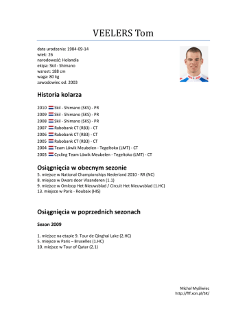 VEELERS Tom data urodzenia: 1984-09-14 wiek: 26 narodowość: Holandia ekipa: Skil - Shimano wzrost: 188 cm waga: 80 kg zawodowiec od: 2003 Historia kolarza 2010 2009 2008 2007 2006 2005 2004 2003 Skil - Shimano (SKS) - PR Skil - Shimano (SKS) - PR Skil - Shimano (SKS) - PR Rabobank CT (RB3) - CT Rabobank CT (RB3) - CT Rabobank CT (RB3) - CT Team eam Löwik Meubelen - Tegeltoko (LMT) - CT Cycling ycling Team Löwik Meubelen - Tegeltoko (LMT) - CT Osiągnięcia w obecnym sezonie 5. miejsce w National Championships Nederland 2010 - RR (NC) 8. miejsce w Dwars door Vlaanderen (1.1) 9. miejsce w Omloop Het Nieuwsblad / Circuit Het Nieuwsblad (1.HC) 13. miejsce w Paris - Roubaix (HIS) Osiągnięcia w poprzednich sezonach Sezon 2009 1. miejsce na etapie 9. Tour de Qinghai Lake (2.HC) 5. miejsce w Paris – Bruxelles (1.HC) 10. miejsce w Tour of Qatar (2.1) Michał Myśliwiec http://fff.xon.pl/SK/ http://fff.xon.pl