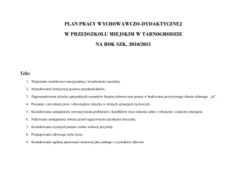PLAN PRACY WYCHOWAWCZO-DYDAKTYCZNEJ W PRZEDSZKOLU MIEJSKIM W TARNOGRODZIE NA ROK SZK. 2010/2011 Cele: 1. Wspieranie wrażliwości emocjonalnej i świadomości moralnej.. 2. Stymulowanie kreatywnej postawy przedszkolaków.. 3. Zagwarantowanie dziecku optymalnych warunków bezpieczeństwa oraz pomoc w budowaniu pozytywnego obrazu własnego „Ja”. 4. Poznanie i utrwalanie praw i obowiązków dziecka w różnych sytuacjach życiowych.. 5. Kształtowanie umiejętności rozwiązywania problemów i konfliktów oraz radzenia sobie z własnymi i cudzymi emocjami. 6. Nabywanie umiejętności obrony przed negatywnymi naciskami otoczenia. 7. Kształtowanie czynnych postaw wobec ochrony przyrody. 8. Propagowanie zdrowego stylu życia. 9. Kształtowanie ogólnej sprawności ruchowej jako jednego z czynników zdrowia. ZAKRES ZADAŃ ZADANIA 1.Bezpieczeństwo przedszkolaka. P R O C E S Rozwijanie samokontroli u dziecka jako podstawy kształtowania właściwego stosunku do bezpieczeństwa własnego i innych. SPOSÓB REALIZACJI TERMIN OSOBY ODPOWIEDZIALNE UWAGI Stwarzanie warunków gwarantujących bezpieczeństwo i zdrowie psychofizyczne przedszkolaka -cykl spotkań z policjantem: „Zasady ruchu drogowego”, „Moralne i prawne skutki agresywnych zachowań”, „Bezpieczne miejsca zabaw w różnych porach roku”. - wdrażanie do właściwego korzystania z zabawek, przyborów do ćwiczeń oraz urządzeń na placu zabaw - spotkanie ze strażakiem na temat „Przyczyny i skutki powstawania pożarów” - spotkanie ze specjalistami :lekarz, pielęgniarka, farmaceuta: - organizowanie zabaw ruchowych w Sali i na świeżym powietrzu- spacerów, wycieczek, ćwiczeń ruchowych, zabaw w suchym -Dzień z witaminką -spartakiada sportowa wrzesień listopad p.V.Łukaszczyk styczeń, maj cały rok n-lki p.B.Borowa maj p.V.Łukaszczyk luty n-lki cały rok maj czerwiec p.E.Wancisiewicz p.I.Kamieniec p.N.Dołomisiewicz 2 2. Nasze emocje i uczucia. Wspomaganie rozwoju społecznoemocjonalnego dzieci w różnych sferach działalności. Tworzenie warunków rozwijających spontaniczna i zorganizowaną aktywność artystyczną dzieci: a)wyzwalanie pozytywnych emocji u dzieci poprzez urządzanie kącików zainteresowań w salach, -pomoc w wykonywaniu rekwizytów do zajęć b) systematyczna obserwacja i diagnoza dzieci: - podejmowanie określonych działań we współpracy z Poradnią PsychologicznoPedagogiczną zmierzających do eliminowania zachowań agresywnych -prowadzenie sondażu wśród dzieci na temat ich samopoczucia, preferencji zabaw i kolegów cały rok n-lki cały rok n-lki n-lki grup 5-6letnich listopad kwiecień styczeń, czerwiec n-lki c)udział dzieci w konkursach plastycznych, muzycznych, recytatorskich i ruchowych: - konkurs plastyczno-techniczny na projekt przedszkolnego placu zabaw -VI Przegląd Piosenki Przedszkolnej pod hasłem „W krainie uczuć” wrzesień n-lki kwiecień p.V.Łukaszczyk p.N.Dołomisiewicz p.B.Zwolak -IV Spotkanie z Poezją „Jacy jesteśmy” luty p.E.Skotnicka -„Malowane uczucia”- konkurs plastyczny luty p.N.Dołomisiewicz 3 D Y D A K T Y C Z N O 3.Współpraca z rodzicami Pogłębianie więzi z bliskimi. d) organizacja uroczystości i imprez przedszkolnych wzmacniających więzi emocjonalne z rodziną, kadrą pedagogiczną, obsługą: cały rok n-lki - inscenizacje utworów literackich, -pedagogizacja rodziców na temat „Małe dzieci duże uczucia”, - zajęcia otwarte „Gry i zabawy przeciwko agresji”, - organizowanie zajęć ruchowych umożliwiających rozładowanie napięcia emocjonalnego w sposób nieagresywnymetoda Sherborne, Labana, Orfa, - stosowanie gier i zabaw przeciwko agresji, - wyeksponowanie praw i obowiązków dziecka w Sali i na korytarzu, -realizacja tematów o prawach i obowiązkach dziecka, -dostarczanie wzorów pozytywnych i ukazywanie negatywnego zachowania w oparciu o literaturę, filmy i słuchowiska, zajęcia koleżeńskie, opracowanie scenariuszy. cały rok styczeń/luty n-lki p.E.Wancisiewicz cały rok n-lki Zajęcia koleżeńskie n-lki cały rok cały rok n-lki cały rok n-lki cały rok n-lki - Spotkania z rodzicami ogólne i w poszczególnych grupach wrzesień N=lki - Rozmowy indywidualne z rodzicami cały rok n-lki - Przekazanie informacji o wynikach obserwacji i diagnozy listopad kwiecień n-lki grup 5-6letnich 4 4. Współpraca ze środowiskiem lokalnym i ogólnopolskim. - Łagodzenie stresu u dzieci związanego z adaptacją w przedszkolu – wspólne zabawy z rodzicami (scenariusze zajęć) wrzesień n-lki - włączanie rodziców do organizowania i udziału w spacerach ,wycieczkach, piknikach , spartakiadach i uroczystościach cały rok n-lki -Dzień Nauczyciela październik p.I.Kamieniec - pasowanie na przedszkolaka listopad p.N.Dołomisiewicz p.V.Łukaszczyk - spotkanie opłatkowe w przedszkolu grudzień p.E.Wancisiewicz - bal przebierańców styczeń/luty n-lki - Dzień Babci i Dziadka styczeń n-lki - Dzień Mamy i Taty maj/czerwiec n-lki - Dzień Dziecka czerwiec dyrektor n-lki - pożegnanie sześciolatków czerwiec p.I.Kamieniec Współpraca z PPP w Biłgoraju cały rok n-lki grup 5-6letnich Uzyskanie zgody rodziców na skierowanie dziecka do poradni wrzesień n-lki grup 5-6letnich Wymiana scenariuszy między nauczycielkami 5 W Y C H O W A W C Z Y Prelekcja przedstawiciela PPP na temat agresji Współpraca z Biblioteką Miejską w Tarnogrodzie - wycieczka do biblioteki w ciągu roku dyrektor cały rok n-lki maj n-lki - słuchanie bajek czytanych przez mieszkańców miasta w ramach akcji „Cały Tarnogród czyta dzieciom” maj n-lki - udział w konkursach cały rok n-lki -prezentacja prac plastycznych dzieci w bibliotece 2 razy w roku n-lki - wyjścia na przedstawienia teatralne cały rok n-lki -promocja przedszkola w lokalnej prasie cały rok n-lki - zwiedzanie wystaw plastycznych i fotograficznych cały rok n-lki - wynajmowanie sali widowiskowej na próby i uroczystości przedszkolne według potrzeb dyrektor - udział w konkur