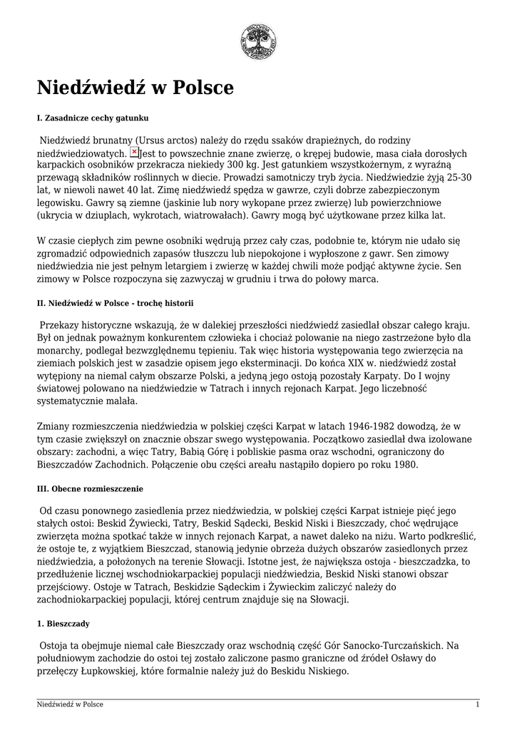 Niedźwiedź w Polsce I. Zasadnicze cechy gatunku Niedźwiedź brunatny (Ursus arctos) należy do rzędu ssaków drapieżnych, do rodziny niedźwiedziowatych. Jest to powszechnie znane zwierzę, o krępej budowie, masa ciała dorosłych karpackich osobników przekracza niekiedy 300 kg. Jest gatunkiem wszystkożernym, z wyraźną przewagą składników roślinnych w diecie. Prowadzi samotniczy tryb życia. Niedźwiedzie żyją 25-30 lat, w niewoli nawet 40 lat. Zimę niedźwiedź spędza w gawrze, czyli dobrze zabezpieczonym legowisku. Gawry są ziemne (jaskinie lub nory wykopane przez zwierzę) lub powierzchniowe (ukrycia w dziuplach, wykrotach, wiatrowałach). Gawry mogą być użytkowane przez kilka lat. W czasie ciepłych zim pewne osobniki wędrują przez cały czas, podobnie te, którym nie udało się zgromadzić odpowiednich zapasów tłuszczu lub niepokojone i wypłoszone z gawr. Sen zimowy niedźwiedzia nie jest pełnym letargiem i zwierzę w każdej chwili może podjąć aktywne życie. Sen zimowy w Polsce rozpoczyna się zazwyczaj w grudniu i trwa do połowy marca. II. Niedźwiedź w Polsce - trochę historii Przekazy historyczne wskazują, że w dalekiej przeszłości niedźwiedź zasiedlał obszar całego kraju. Był on jednak poważnym konkurentem człowieka i chociaż polowanie na niego zastrzeżone było dla monarchy, podlegał bezwzględnemu tępieniu. Tak więc historia występowania tego zwierzęcia na ziemiach polskich jest w zasadzie opisem jego eksterminacji. Do końca XIX w. niedźwiedź został wytępiony na niemal całym obszarze Polski, a jedyną jego ostoją pozostały Karpaty. Do I wojny światowej polowano na niedźwiedzie w Tatrach i innych rejonach Karpat. Jego liczebność systematycznie malała. Zmiany rozmieszczenia niedźwiedzia w polskiej części Karpat w latach 1946-1982 dowodzą, że w tym czasie zwiększył on znacznie obszar swego występowania. Początkowo zasiedlał dwa izolowane obszary: zachodni, a więc Tatry, Babią Górę i pobliskie pasma oraz wschodni, ograniczony do Bieszczadów Zachodnich. Połączenie obu części areału nastąpiło dopiero po roku 1980. III. Obecne rozmieszczenie Od czasu ponownego zasiedlenia przez niedźwiedzia, w polskiej części Karpat istnieje pięć jego stałych ostoi: Beskid Żywiecki, Tatry, Beskid Sądecki, Beskid Niski i Bieszczady, choć wędrujące zwierzęta można spotkać także w innych rejonach Karpat, a nawet daleko na niżu. Warto podkreślić, że ostoje te, z wyjątkiem Bieszczad, stanowią jedynie obrzeża dużych obszarów zasiedlonych przez niedźwiedzia, a położonych na terenie Słowacji. Istotne jest, że największa ostoja - bieszczadzka, to przedłużenie licznej wschodniokarpackiej populacji niedźwiedzia, Beskid Niski stanowi obszar przejściowy. Ostoje w Tatrach, Beskidzie Sądeckim i Żywieckim zaliczyć należy do zachodniokarpackiej populacji, której centrum znajduje się na Słowacji. 1. Bieszczady Ostoja ta obejmuje niemal całe Bieszczady oraz wschodnią część Gór Sanocko-Turczańskich. Na południowym zachodzie do ostoi tej zostało zaliczone pasmo graniczne od źródeł Osławy do przełęczy Łupkowskiej, które formalnie należy już do Beskidu Niskiego. Niedźwiedź w Polsce 1 Obszar zasiedlony przez niedźwiedzia w Bieszczadach obejmuje głównie tereny o niskim zaludnieniu i rzadkiej sieci osadniczej wzdłuż granic z Ukrainą i Słowacją, na wschód i południe od Jeziora Solińskiego. Północna granica obszaru dotyka terenów o stosunkowo wysokim zaludnieniu i ten właśnie czynnik ogranicza możliwości dalszej ekspansji. Na północ od Bieszczad niedźwiedź spotykany jest na wschód od Leska, w pasmach Ostry Dział, Widły oraz w okolicach Stebnika i Krościenka nad Strwiążem - pasmo Radiów i Czerenina. Na wschód od szosy Ustrzyki Dolne - Czarna rozpoczyna się obszar stałego występowania tego gatunku, łącznie z miejscami gawrowania. Cały ten obszar, położony na północ od doliny Mszanki, choć daleko odsunięty od głównych grzbietów Bieszczad Wysokich, łączy się z zasiedlonym przez niedźwiedzie terenem po stronie ukraińskiej, gdzie granica zasiedlonego obszaru jest wyraźnie dalej wysunięta w kierunku północnym. W Bieszczadach większość znalezionych gawr była zlokalizowana w centrum ostoi, w obrębie obszarów stałego występowania niedźwiedzi. Ich szczegółowa lokalizacja wskazuje, że zwierzęta starannie unikały sąsiedztwa osad i terenów o dużym nasileniu penetracji ludzi. Najwięcej gawr było zlokalizowanych w pobliżu górnej granicy lasu. W pojedynczych przypadkach niedaleko rejonów gawrowania przebiegały stosunkowo uczęszczane szlaki turystyczne np. z Wołosatego na Tarnicę. 2. Beskid Niski Ostoja obejmuje całą południową część Beskidu Niskiego, tylko pasmo Magury Wątkowskiej stanowi jedyny wysunięty ku północy zasiedlony przez niedźwiedzia obszar. Na wschodzie i zachodzie zasiedlony teren w sposób naturalny, bez wyraźnych granic i przerw, łączy się z ostojami w Bieszczadach i Beskidzie Sądeckim. Najwięcej informacji o niedźwiedziu dotyczy części regionu wzdłuż granicy państwa, w najbardziej odludnych rejonach Beskidu Niskiego. Obszar Beskidu Niskiego jest dość często penetrowany przez osobniki z Bieszczad i Beskidu Sądeckiego. Do tej pory na obszarze Beskidu Niskiego znaleziono tylko jedną gawrę pod szczytem Beskid, na wschód od Tylicza na granicy państwa, choć częstsze gawrowanie niedźwiedzi na tym obszarze jest bardzo prawdopodobne. 3. Beskid Sądecki i Gorce Obszar zasiedlony przez niedźwiedzie rozciąga się równoleżnikowo i obejmuje bardzo zróżnicowany teren, a więc cały Beskid Sądecki, Małe Pieniny, Gorce i południową partię Beskidu Wyspowego. W Beskidzie Sądeckim w obręb ostoi wchodzą pasma Jaworzyny i Radziejowej, a w Gorcach oprócz głównego masywu także pasmo Lubania. Grzbiety górskie porośnięte są dość rozległymi kompleksami leśnymi, jedna