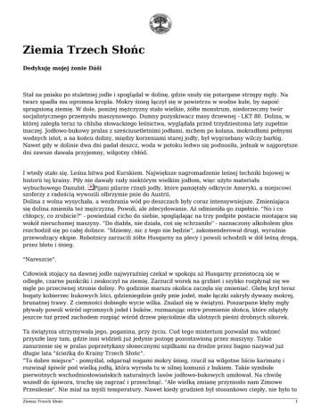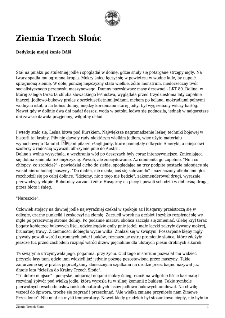 Ziemia Trzech Słońc Dedykuję mojej żonie Dáši Stał na pniaku po stuletniej jodle i spoglądał w dolinę, gdzie snuły się potargane strzępy mgły. Na twarz spadła mu ogromna kropla. Mokry śnieg łączył się w powietrzu w wodne kule, by napoić spragnioną ziemię. W dole, poniżej mężczyzny stało wielkie, żółte monstrum, niedorzeczny twór socjalistycznego przemysłu maszynowego. Dumny pozyskiwacz masy drzewnej - LKT 80. Dolina, w której zaległa teraz ta chluba słowackiego leśnictwa, wyglądała przed trzydziestoma laty zupełnie inaczej. Jodłowo-bukowy pralas z sześciusetletnimi jodłami, mchem po kolana, mokradłami pełnymi wodnych istot, a na końcu doliny, między korzeniami starej jodły, był wygrzebany wilczy barłóg. Nawet gdy w dolinie dwa dni padał deszcz, woda w potoku ledwo się podnosiła, jednak w najgorętsze dni zawsze dawała przyjemny, wilgotny chłód. I wtedy stało się. Leśna bitwa pod Kurskiem. Największe nagromadzenie leśnej techniki bojowej w historii tej krainy. Piły nie dawały rady niektórym wielkim jodłom, więc użyto materiału wybuchowego Danubit. Pijani pilarze rżnęli jodły, które pamiętały odkrycie Ameryki, a miejscowi szoferzy z radością wywozili olbrzymie pnie do Austrii. Dolina z wolna wysychała, a wezbrania wód po deszczach były coraz intensywniejsze. Zmieniająca się dolina zmieniła też mężczyznę. Powoli, ale zdecydowanie. Aż odmieniła go zupełnie. "No i co chłopcy, co zrobicie?" - powiedział cicho do siebie, spoglądając na trzy podpite postacie miotające się wokół nieruchomej maszyny. "Do diabła, nie działa, coś się schrzaniło" - naznaczony alkoholem głos rozchodził się po całej dolince. "Idziemy, nic z tego nie będzie", zakomenderował drugi, wyraźnie przewodzący ekipie. Robotnicy zarzucili żółte Husqarny na plecy i powoli schodzili w dół leśną drogą, przez błoto i śnieg. "Nareszcie". Człowiek stojący na dawnej jodle najwyraźniej czekał w spokoju aż Husqarny przeistoczą się w odległe, czarne punkciki i zeskoczył na ziemię. Zarzucił worek na grzbiet i szybko rozpłynął się we mgle po przeciwnej stronie doliny. Po godzinie marszu okolica zaczęła się zmieniać. Glebę krył teraz bogaty kobierzec bukowych liści, gdzieniegdzie gniły pnie jodeł, małe łączki zakryły dywany mokrej, brunatnej trawy. Z ciemności dobiegło wycie wilka. Znalazł się w świątyni. Poszarpane kłęby mgły pływały powoli wśród ogromnych jodeł i buków, rozmazując ostre promienie słońca, które zdążyły jeszcze tuż przed zachodem rozpiąć wśród drzew pięciolinie dla ulotnych pieśni drobnych sikorek. Ta świątynia utrzymywała jego, poganina, przy życiu. Cud tego misterium pozwalał mu widzieć przyszłe lasy tam, gdzie inni widzieli już jedynie pożogę pozostawioną przez maszyny. Takie zanurzenie się w pralas poprzetykany słonecznymi szpilkami na drodze przez bagno nazywał już długie lata "ścieżką do Krainy Trzech Słońc". "To dobre miejsce" - pomyślał, odgarnął nogami mokry śnieg, rzucił na wilgotne liście karimatę i rozwinął śpiwór pod wielką jodłą, która wyrosła tu w silnej komunii z bukiem. Takie symbole pierwotnych wschodniosłowiańskich naturalnych lasów jodłowo-bukowych umiłował. Na chwilę wszedł do śpiwora, trochę się zagrzać i przeschnąć. "Ale wielką zmianę przyniosło nam Zimowe Przesilenie". Nie miał na myśli temperatury. Nawet kiedy grudzień był stosunkowo ciepły, nie było to Ziemia Trzech Słońc 1 przecież niczym wyjątkowym. Informacje o globalnym ociepleniu przy obecnych przedświątecznych temperaturach powyżej zera nieźle go bawiły. Myślał o przebiegu rytuałów zimowego przesilenia. Przez ostatnie dziesięć lat stał się czymś w rodzaju adwokata jodeł, buków, bakterii, sikorek, kun i wilków. Ludzie, gdy pozostają bez pracy, otrzymują wsparcie w postaci zasiłku, mają odpowiednie adwokackie kancelarie dla swoich mniej lub bardziej małostkowych sporów, zrzeszenia, kluby sportowe i koła łowieckie, Internet, telekomunikację, przychodnie lekarskie i psychiatrów, instytucje charytatywne i społeczne. I zawsze gdy martwią się o środowisko naturalne, mają na względzie wyłącznie środowisko człowieka. Ale żaby, jodły, wilki, dzięcioły buki i korniki są codziennie zagrożone. Tym zagrożeniem nie są dla siebie nawzajem - to jedynie naturalny kołowrót życia - lecz zagraża im człowiek. Codziennie piły bezmyślnie wgryzają się w ich ciała, codziennie strzelby czynią zamachy na ich potomstwo, codziennie rozpylane są toksyny zabijające miliony żywych organizmów, które zawiniły jedynie swym istnieniem. Te istoty potrzebują jednak własnych kancelarii prawniczych, które by reprezentowały ich sprawy w społeczności ludzi. Potrzebują swoich psychiatrów, instytucji charytatywnych i służb bezpieczeństwa. "Aby przeżyć to wszystko w jako takim zdrowiu psychicznym, muszę stale chodzić między nich, muszę między nimi spać, muszę czerpać od nich siłę, a wtedy mogę pójść w masce człowieka znów do ludzkiej społeczności" - często mawiał do nie pojmujących tego przyjaciół. Na jego dobre zdrowie psychiczne składały się długie lata świąt przesileń i równonocny. Kiedyś celebrował je głównie dla siebie. "Człowiek musi przede wszystkim sam być silny, aby mógł walczyć za inne istoty" - myślał. Później stwierdził, że z taką filozofią życia można swobodnie przeżyć cały swój żywot. Jednak w czasie, gdy się tak "umacniasz", padają tysiące drzew dziennie, bezsensownie giną tysiące wszelkich stworzeń. Każdego dnia. I tak odmienił obchody naturalnych świat. Zimowe Przesilenie miało wśród nich szczególną pozycję. Najbardziej go radowało. Fascynowało go to, że na początku zimy, gdy czas biedy i ograniczeń dopiero się zaczynał, ludzie w minionych wiekach potrafili cieszyć się z pierwszych kr