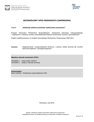 SZCZEGÓŁOWY OPIS PRZEDMIOTU ZAMÓWIENIA Projekt „Edukacja szkolna przeciwko wykluczeniu prawnemu” Program Operacyjny Ministerstwa Sprawiedliwości: „Budowanie potencjału instytucjonalnego i współpraca w obszarze wymiaru sprawiedliwości/Poprawa skuteczności wymiaru sprawiedliwości” Projekt współfinansowany ze środków Norweskiego Mechanizmu Finansowego 2009-2014 Działanie Zorganizowanie i przeprowadzenie konkursu z zakresu wiedzy prawnej dla uczniów szkół gimnazjalnych i ponadgimnazjalnych Wspólny słownik zamówień (CPV): 79416000-3 - usługi public relations 79342200-5 - usługi w zakresie promocji Zamawiający Skarb Państwa - Ministerstwo Sprawiedliwości (MS) Warszawa, maj 2015r Projekt „Edukacja szkolna przeciwko wykluczeniu prawnemu” współfinansowany ze środków funduszy norweskich i środków krajowych Strona 1 z 5 W związku z realizacją projektu pn. „Edukacja szkolna przeciwko wykluczeniu prawnemu” przez Departament Współpracy Międzynarodowej i Praw Człowieka w Ministerstwie Sprawiedliwości w ramach Norweskiego Mechanizmu Finansowego na lata 2009-2014, Program Operacyjny Ministerstwa Sprawiedliwości: „Budowanie potencjału instytucjonalnego i współpraca w obszarze wymiaru sprawiedliwości/Poprawa skuteczności wymiaru sprawiedliwości”, Ministerstwo Sprawiedliwości w Warszawie, ogłasza konkurs na: Zorganizowanie i przeprowadzenie konkursu z zakresu wiedzy prawnej dla uczniów szkół gimnazjalnych i ponadgimnazjalnych poniżej 18 roku życia. OPIS PRZEDMIOTU ZAMÓWIENIA: 1. PRZEDMIOTEM ZAMÓWIENIA jest zorganizowanie i przeprowadzenie konkursu z zakresu wiedzy prawnej dla uczniów szkół gimnazjalnych i ponadgimnazjalnych poniżej 18 roku życia*. Z uwagi na rozpiętość wiekową grupy docelowej (w tym różny poziom rozwoju psychicznego i emocjonalnego) konieczne jest dostosowanie konkursu do poszczególnych grup uczniów (konkurs z zakresu wiedzy prawnej dla uczniów szkół gimnazjalnych i konkurs z zakresu wiedzy prawnej dla uczniów szkół ponadgimnazjalnych). Celem nadrzędnym konkursu jest promocja wśród uczniów szkół gimnazjalnych i uczniów szkół ponadgimnazjalnych przesłania, że bycie obywatelem świadomym swoich praw i obowiązków jest korzystne dla małoletniego, modne i nowoczesne, chroni przed zagrożeniami, uczy samodzielności, asertywności i pomaga w codziennym życiu. Celem pośrednim konkursu jest zmotywowanie uczniów szkół gimnazjalnych i uczniów szkół ponadgimnazjalnych do zdobywania i poszerzania wiedzy z zakresu prawa. 2. SZCZEGÓŁOWY ZAKRES ZAMÓWIENIA: Zamówienie obejmuje m.in.: 1. Opracowanie szczegółowych zasad konkursu (w tym regulaminu) wraz z zakresem zagadnień, które będą objęte konkursem: a. Szczegółowe zasady konkursu zostaną określone w regulaminie, który będzie podlegał akceptacji Zamawiającego. b. Opracowanie wszelkich dokumentów niezbędnych do przeprowadzenia konkursu. 2. Opracowanie szczegółowego harmonogramu realizacji konkursu uwzględniającego wszystkie niezbędne działania. 3. Promocję konkursu w szkołach gimnazjalnych i ponadgimnazjalnych przy współpracy z Zamawiającym. 4. Rekrutację uczestników do Konkursu. 5. Organizację konkursu i jego poszczególnych etapów (koncepcja powinna zakładać realizację minimum 2 etapów konkursu) zgodnie z przedłożoną i zaakceptowaną koncepcją konkursu. 6. Nadzorowanie przebiegu konkursu: a. Stała współpraca z Zamawiającym w celu sprawnej i efektywnej organizacji konkursu. b. Na żądanie Zamawiającego udzielanie każdorazowo pełnej informacji o stanie realizacji zadania. 7. Organizację finału konkursu, w tym powołanie Kapituły Konkursu (kandydaci na członków Kapituły Konkursu podlegają akceptacji Zamawiającego). Zamawiający zastrzega możliwość zgłoszenia swoich członków do Kapituły Konkursu: a. Opracowanie regulaminu obrad Kapituły Konkursu. *Kryterium weryfikowane na etapie przystąpienia do konkursu i podpisania dokumentów rekrutacyjnych. Projekt „Edukacja szkolna przeciwko wykluczeniu prawnemu” współfinansowany ze środków funduszy norweskich i środków krajowych Strona 2 z 5 b. Na potrzeby organizacji finału konkursu Zamawiający może udostępnić salę konferencyjną w budynku Ministerstwa Sprawiedliwości (Al. Ujazdowskie 11, 00-950 Warszawa) - po wcześniejszym uzgodnieniu terminu z Zamawiającym. 8. Zapewnienie i przekazanie nagród i dyplomów laureatom konkursu oraz laureatom poszczególnym etapów: a. Dyplom (o formacie min. A4, z wydrukiem na papierze kredowym o min. gramaturze 170g/m2 z fakturą płótna, w oprawie pleksi) dla zwycięzców za zajęcie 1, 2, 3-go miejsca w każdej z grup wiekowych (młodzież gimnazjalna oraz młodzież ponadgimnazjalna) – dotyczy etapu centralnego oraz regionalnego. b. Wykonawca zobligowany jest do przedstawienia propozycji nagród Zamawiającemu i uzyskania zgody na zaproponowane nagrody. 9. Przygotowanie raportu końcowego wraz z dokumentacją zdjęciową z działań przeprowadzonych w ramach przedmiotowego konkursu. 10. Wykonawca powinien dysponować minimum 2 osobami posiadającymi tytuł minimum magistra prawa, które będą odpowiedzialne za przygotowanie zagadnień/zakresu tematycznego konkursu oraz przygotowanie konkretnych pytań/casusów/zadań w zależności od formy realizacji konkursu. Wszystkie przygotowane materiały muszą być oznaczone zgodnie z Wytycznymi dla Programu, które dostępne są do pobrania pod niżej wskazanymi linkami: http://www.eog.gov.pl/Dokumenty/Informacja_i_promocja/Documents/Wytyczn_Podrecznik_ wizualizacji.pdf http://www.eog.gov.pl/Dokumenty/Informacja_i_promocja/Wzory_materialow_info_promo/Str ony/start.aspx http://www.eog.gov.pl/Dokumenty/Informacja_i_promocja/Logotypy/Strony/start.aspx Dodatkowo materiały muszą być oznaczone logotypem Ministerstwa Sprawiedliwości. Zamawiający przekaże Wykonawcy logotypy oraz Księgę Znaku Ministerstwa Sprawiedliwości. 3. Kod CPV: 