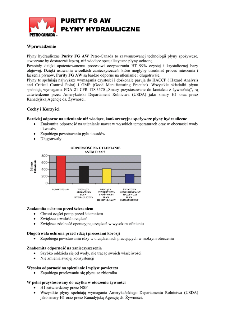PURITY FG AW PŁYNY HYDRAULICZNE Wprowadzenie Płyny hydrauliczne Purity FG AW Petro-Canada to zaawansowanej technologii płyny spożywcze, stworzone by dostarczać lepszą, niż wiodące specjalistyczne płyny ochronę. Powstały dzięki opatentowanemu procesowi oczyszczania HT 99% czystej i krystalicznej bazy olejowej. Dzięki usuwaniu wszelkich zanieczyszczeń, które mogłyby utrudniać proces mieszania i łączenia płynów, Purity FG AW są bardzo odporne na utlenianie i długotrwałe. Płyny te spełniają najwyższe wymagania czystości i doskonale pasują do HACCP ( Hazard Analysis and Critical Control Point) i GMP (Good Manufacturing Practice). Wszystkie składniki płynu spełniają wymagania FDA 21 CFR 178.3570 „Smary przystosowane do kontaktu z żywnością”, są zatwierdzone przez Amerykański Departament Rolnictwa (USDA) jako smary H1 oraz przez Kanadyjską Agencję ds. Żywności. Cechy i Korzyści Bardziej odporne na utlenianie niż wiodące, konkurencyjne spożywcze płyny hydrauliczne • Znakomita odporność na utlenianie nawet w wysokich temperaturach oraz w obecności wody i kwasów • Zapobiega powstawaniu pyłu i osadów • Długotrwały Minuty Utleniania ODPORNOŚĆ NA UTLENIANIE ASTM D 2272 PURITY FG AW WIODĄCY SPOŻYWCZY PŁYN HYDRAULICZNY WIODĄCY SYNTETYCZNY SPOŻYWCZY PŁYN HYDRAULICZNY ŚWIATOWY KONKURENCYJNY SPOŻYWCZY PŁYN HYDRAULICZNY Znakomita ochrona przed ścieraniem • Chroni części pomp przed ścieraniem • Zwiększa trwałość urządzeń • Zwiększa zdolność operacyjną urządzeń w wysokim ciśnieniu Długotrwała ochrona przed rdzą i procesami korozji • Zapobiega powstawaniu rdzy w urządzeniach pracujących w mokrym otoczeniu Znakomita odporność na zanieczyszczenia • Szybko oddziela się od wody, nie tracąc swoich właściwości • Nie zmienia swojej konsystencji Wysoka odporność na spienianie i wpływ powietrza • Zapobiega przelewaniu się płynu ze zbiornika W pełni przystosowany do użytku w otoczeniu żywności • H1 zatwierdzony przez NSF • Wszystkie płyny spełniają wymagania Amerykańskiego Departamentu Rolnictwa (USDA) jako smary H1 oraz przez Kanadyjską Agencję ds. Żywności. • Certyfikowany przez Star K, jako płyn nadający się do użytku przy produkcji żywności koszernej Nie zawiera alergenów • Nie zawiera orzechów laskowych, arachidowych i włoskich Zastosowanie Płyny hydrauliczne PURITY FG AW są świetnie przystosowane do wysokiego ciśnienia (ponad 7000 kPa). Mogą być również używane do smarowania łożysk anty-wstrząsowych, większości systemów obiegowych oraz w systemach pneumatycznych. Specyfikacja techniczna Właściwości Skala ISO Skala SAE Lepkość, cSt @ 40ºC cSt @ 100ºC Indeks Lepkości Punkt Zapłonu, ºC Punkt Płynięcia, ºC Barwa Wodoodporność, 54ºC, 82ºC Odporność na Rdzę A – Woda Destylowana B – Syntetyczna Woda Morska Odporność na Spienianie, Sekwencja I Four-Ball Test Ścieralności Średnica, mm, FZG Metoda Testu AW 32 - 32 10 46 20 68 20 100 30 D 445 29,8 5,2 101 225 -18 0,5 45,4 6,8 102 245 -18 0,5 63,3 8,4 102 253 -18 <0,5 101,5 11,5 99 267 -15 <0,5 D 1401 40-40-0 - 40-40-0 - 40-40-0 - 40-40-0 D 665 Bierny Bierny Bierny Bierny Bierny Bierny Bierny Bierny D 892 0/0 0/0 0/0 0/0 D 4172 D 5182 0,46 12 0,48 12 0,49 12 0,44 12 D 2270 D92 D97 D 1500 PURITY FG AW AW 46 AW 68 AW 100