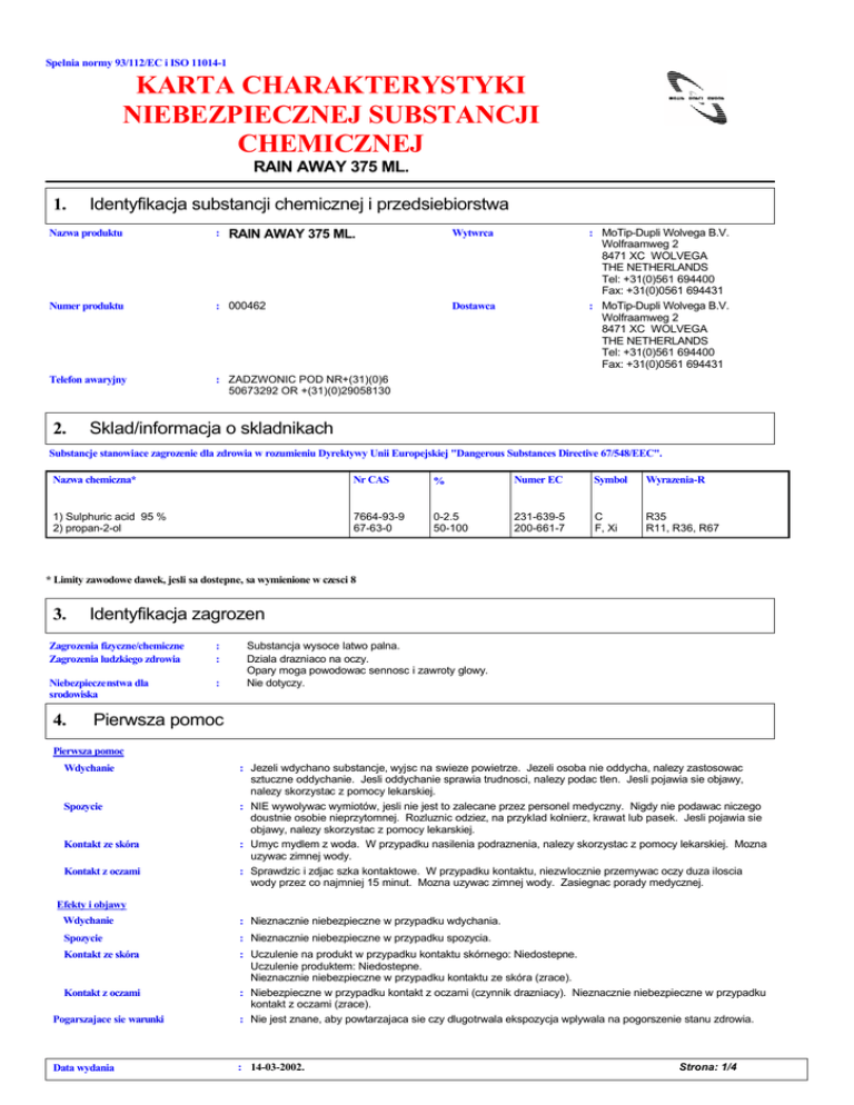 Spelnia normy 93/112/EC i ISO 11014-1 KARTA CHARAKTERYSTYKI NIEBEZPIECZNEJ SUBSTANCJI CHEMICZNEJ RAIN AWAY 375 ML. 1. Identyfikacja substancji chemicznej i przedsiebiorstwa Nazwa produktu : Numer produktu : 000462 Telefon awaryjny : ZADZWONIC POD NR+(31)(0)6 50673292 OR +(31)(0)29058130 2. : MoTip-Dupli Wolvega B.V. Wolfraamweg 2 8471 XC WOLVEGA THE NETHERLANDS Tel: +31(0)561 694400 Fax: +31(0)0561 694431 : MoTip-Dupli Wolvega B.V. Wolfraamweg 2 8471 XC WOLVEGA THE NETHERLANDS Tel: +31(0)561 694400 Fax: +31(0)0561 694431 Wytwrca RAIN AWAY 375 ML. Dostawca Sklad/informacja o skladnikach Substancje stanowiace zagrozenie dla zdrowia w rozumieniu Dyrektywy Unii Europejskiej "Dangerous Substances Directive 67/548/EEC". Nazwa chemiczna* Nr CAS % Numer EC Symbol Wyrazenia-R 1) Sulphuric acid 95 % 2) propan-2-ol 7664-93-9 67-63-0 0-2.5 50-100 231-639-5 200-661-7 C F, Xi R35 R11, R36, R67 * Limity zawodowe dawek, jesli sa dostepne, sa wymienione w czesci 8 3. Identyfikacja zagrozen Zagrozenia fizyczne/chemiczne Zagrozenia ludzkiego zdrowia : : Niebezpieczenstwa dla srodowiska : 4. Substancja wysoce latwo palna. Dziala drazniaco na oczy. Opary moga powodowac sennosc i zawroty glowy. Nie dotyczy. Pierwsza pomoc Pierwsza pomoc Wdychanie Spozycie Kontakt ze skóra Kontakt z oczami : Jezeli wdychano substancje, wyjsc na swieze powietrze. Jezeli osoba nie oddycha, nalezy zastosowac sztuczne oddychanie. Jesli oddychanie sprawia trudnosci, nalezy podac tlen. Jesli pojawia sie objawy, nalezy skorzystac z pomocy lekarskiej. : NIE wywolywac wymiotów, jesli nie jest to zalecane przez personel medyczny. Nigdy nie podawac niczego doustnie osobie nieprzytomnej. Rozluznic odziez, na przyklad kolnierz, krawat lub pasek. Jesli pojawia sie objawy, nalezy skorzystac z pomocy lekarskiej. : Umyc mydlem z woda. W przypadku nasilenia podraznenia, nalezy skorzystac z pomocy lekarskiej. Mozna uzywac zimnej wody. : Sprawdzic i zdjac szka kontaktowe. W przypadku kontaktu, niezwlocznie przemywac oczy duza iloscia wody przez co najmniej 15 minut. Mozna uzywac zimnej wody. Zasiegnac porady medycznej. Efekty i objawy Wdychanie : Nieznacznie niebezpieczne w przypadku wdychania. Spozycie : Nieznacznie niebezpieczne w przypadku spozycia. Kontakt ze skóra Pogarszajace sie warunki : Uczulenie na produkt w przypadku kontaktu skórnego: Niedostepne. Uczulenie produktem: Niedostepne. Nieznacznie niebezpieczne w przypadku kontaktu ze skóra (zrace). : Niebezpieczne w przypadku kontakt z oczami (czynnik drazniacy). Nieznacznie niebezpieczne w przypadku kontakt z oczami (zrace). : Nie jest znane, aby powtarzajaca sie czy dlugotrwala ekspozycja wplywala na pogorszenie stanu zdrowia. Data wydania : 14-03-2002. Kontakt z oczami Strona: 1/4 RAIN AWAY 375 ML. 5. Postepowanie w przypadku pozaru Srodki gasnicze : MALY POZAR: Uzyc SUCHEGO proszku chemicznego. DUZY POZAR: Uzyc piany alkoholowej, zraszania woda lub mgly. Ochlodzic naczynie strumieniem wody, aby uniknac wzrostu cisnienia, samozapalenia lub wybuchu. Odpowiedni Niebezpieczne produkty rozkladu chemicznego : Produkty te to tlenki wegla (CO, CO2). Specjalne procedury pozarowe : Strazacy powinni nosic aparaty oddechowe izolacyjne (SCBA) i funkcjonalna odziez. Ochrona strazaków : Nalezy upewnic sie, ze uzywa sie zatwierdzonego/atestowanego respiratora lub jego odpowiednika . 6. Postepowanie w przypadku uwolnienia do srodowiska : Okulary chroniace przed rozpryskiem. Pelny ubiór. Maska chroniaca przed parami. Buty. Rekawice. W celu unikniecia wdychania produktu, nalezy korzystac z izolacyjnego aparatu do oddychania. Zalecana odziez ochronna moze nie by wystarczajaca; skonsultuj sie ze specjalista PRZED poslugiwaniem sie tym produktem. : Nie przechowywac w cieplym miejscu. Trzymac z dala od zródel ognia. Zatrzymac wyciek, jesli mozna to zrobic bez ryzyka. Zaabsorbowac sucha ziemia, piaskiem lub innym niepalnym materialem. Nie dotykac rozlanego materialu. Zapobiegac przeniknieciu do kanalu sciekowego, piwnic lub zamknietych obszarów; okopac, jesli jest to konieczne. Neutralizowac pozostalosci rozcienczonym roztworem weglanu sodowego. Osobiste srodki ostroznosci Srodki ostroznosci ze wzgledu na srodowisko i metody oczyszczania 7. Obchodzenie sie z substancja i magazynowanie : Przechowywac pojemnik w suchym miejscu. Nie przechowywac w cieplym miejscu. Trzymac z dala od zródel ognia. Uziemic cale wyposazenie zawierajace material. Nie spozywac. Nie oddychac gazem, dymami, parami lub mgla. Nigdy nie mieszac z woda. W przypadku spozycia, nalezy natychmiast szukac pomocy medycznej i pokazac pojemnik lub etykiete. Unikac zanieczyszczenia skóry i oczu. Trzymac z dala od niekompatybilnych materialów takich, jak czynniki utleniajace, kwasy, zasady. : Przechowywac w wydzielonym i zatwierdzonym obszarze. Pojemnik nalezy przechowywac w chlodnym, dobrze wietrzonym miejscu. Pojemnik powinien pozostac zamkniety i szczelny do czasu uzycia. Unikac wszystkich mozliwych zródel ognia (iskier lub plomieni). Poslugiwanie sie Przechowywanie Material opakowaniowy : Stosowac oryginalny pojemnik. Zalecane uzycie : 8. Kontrola narazenia/srodki ochrony indywidualnej Zapewnic wyciagowa wentylacje lub inna technike kontroli, aby utrzymac stezenie par w powietrzu ponizej ich granicznych wartosci. Upewnic sie, ze miejsce do mycia oczu i prysznice znajduja sie w poblizu stanowiska pracy. Rece nalezy myc po pracy ze zwiazkami i przed jedzeniem, paleniem, korzystaniem z ustepu i przed koncem dnia. Srodki inzynierskie Srodki zachowania higieny Nazwa skladnika Limity ekspozycji zawodowej 1) propan-2-ol ACGIH (Stany Zjednoczone). TWA: 400 ppm STEL: 500 ppm Wyposazenie ochrony osobistej Skóra i cialo : Maska chroniaca przed parami. Nalezy upewnic sie, ze uzywa sie zatwierdzonego/atestowanego respiratora lub jego odpowiednika . Nalezy nosic odpowiednia maske, gdy wentylacja jest niewystarczajaca. Fartuch. Rece : Rekawice. Oczy : Okulary chroniace przed rozpryskiem. Uklad oddechowy. : 9. Wlasciwosci fizykochemiczne Stan fizy