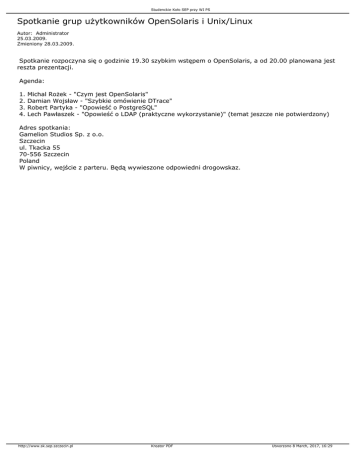 Studenckie Koło SEP przy WI PS Spotkanie grup użytkowników OpenSolaris i Unix/Linux Autor: Administrator 25.03.2009. Zmieniony 28.03.2009. Spotkanie rozpoczyna się o godzinie 19.30 szybkim wstępem o OpenSolaris, a od 20.00 planowana jest reszta prezentacji. Agenda: 1. 2. 3. 4. Michal Rożek - "Czym jest OpenSolaris" Damian Wojsław - "Szybkie omówienie DTrace" Robert Partyka - "Opowieść o PostgreSQL" Lech Pawłaszek - "Opowieść o LDAP (praktyczne wykorzystanie)" (temat jeszcze nie potwierdzony) Adres spotkania: Gamelion Studios Sp. z o.o. Szczecin ul. Tkacka 55 70-556 Szczecin Poland W piwnicy, wejście z parteru. Będą wywieszone odpowiedni drogowskaz. http://www.sk.sep.szczecin.pl Kreator PDF Utworzono 8 March, 2017, 16:29