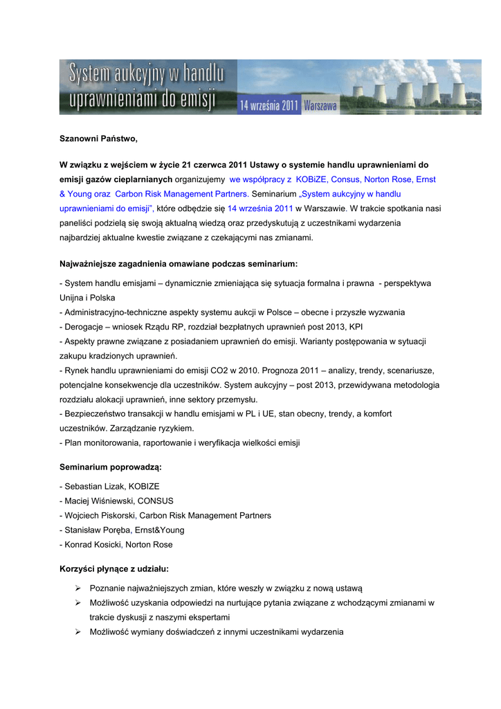 Szanowni Państwo, W związku z wejściem w życie 21 czerwca 2011 Ustawy o systemie handlu uprawnieniami do emisji gazów cieplarnianych organizujemy we współpracy z KOBiZE, Consus, Norton Rose, Ernst & Young oraz Carbon Risk Management Partners. Seminarium „System aukcyjny w handlu uprawnieniami do emisji”, które odbędzie się 14 września 2011 w Warszawie. W trakcie spotkania nasi paneliści podzielą się swoją aktualną wiedzą oraz przedyskutują z uczestnikami wydarzenia najbardziej aktualne kwestie związane z czekającymi nas zmianami. Najważniejsze zagadnienia omawiane podczas seminarium: - System handlu emisjami – dynamicznie zmieniająca się sytuacja formalna i prawna - perspektywa Unijna i Polska - Administracyjno-techniczne aspekty systemu aukcji w Polsce – obecne i przyszłe wyzwania - Derogacje – wniosek Rządu RP, rozdział bezpłatnych uprawnień post 2013, KPI - Aspekty prawne związane z posiadaniem uprawnień do emisji. Warianty postępowania w sytuacji zakupu kradzionych uprawnień. - Rynek handlu uprawnieniami do emisji CO2 w 2010. Prognoza 2011 – analizy, trendy, scenariusze, potencjalne konsekwencje dla uczestników. System aukcyjny – post 2013, przewidywana metodologia rozdziału alokacji uprawnień, inne sektory przemysłu. - Bezpieczeństwo transakcji w handlu emisjami w PL i UE, stan obecny, trendy, a komfort uczestników. Zarządzanie ryzykiem. - Plan monitorowania, raportowanie i weryfikacja wielkości emisji Seminarium poprowadzą: - Sebastian Lizak, KOBIZE - Maciej Wiśniewski, CONSUS - Wojciech Piskorski, Carbon Risk Management Partners - Stanisław Poręba, Ernst&Young - Konrad Kosicki, Norton Rose Korzyści płynące z udziału: ¾ Poznanie najważniejszych zmian, które weszły w związku z nową ustawą ¾ Możliwość uzyskania odpowiedzi na nurtujące pytania związane z wchodzącymi zmianami w trakcie dyskusji z naszymi ekspertami ¾ Możliwość wymiany doświadczeń z innymi uczestnikami wydarzenia Specjalnie dla uczestników seminarium zorganizowaliśmy business speed dating – stoliki eksperckie. W trakcie seminarium oraz w trakcie przerw nasi eksperci będą do Państwa dyspozycji i chętnie odpowiedzą na wszelkie pytania. Więcej szczegółów wydarzenia na stronie www.Powermeetings.pl Serdecznie Zapraszam do rejestracji i dołączenia do grona uczestników spotkania! Ze względu na charakter wydarzenia liczba miejsc jest ograniczona. Kontakt z organizatorem: Renata Kałużna Managing Director SC Consulting tel: +48 22 740 67 80 kom: +48 603 386 917 faks: +48 22 672 95 89 mail: [email protected]