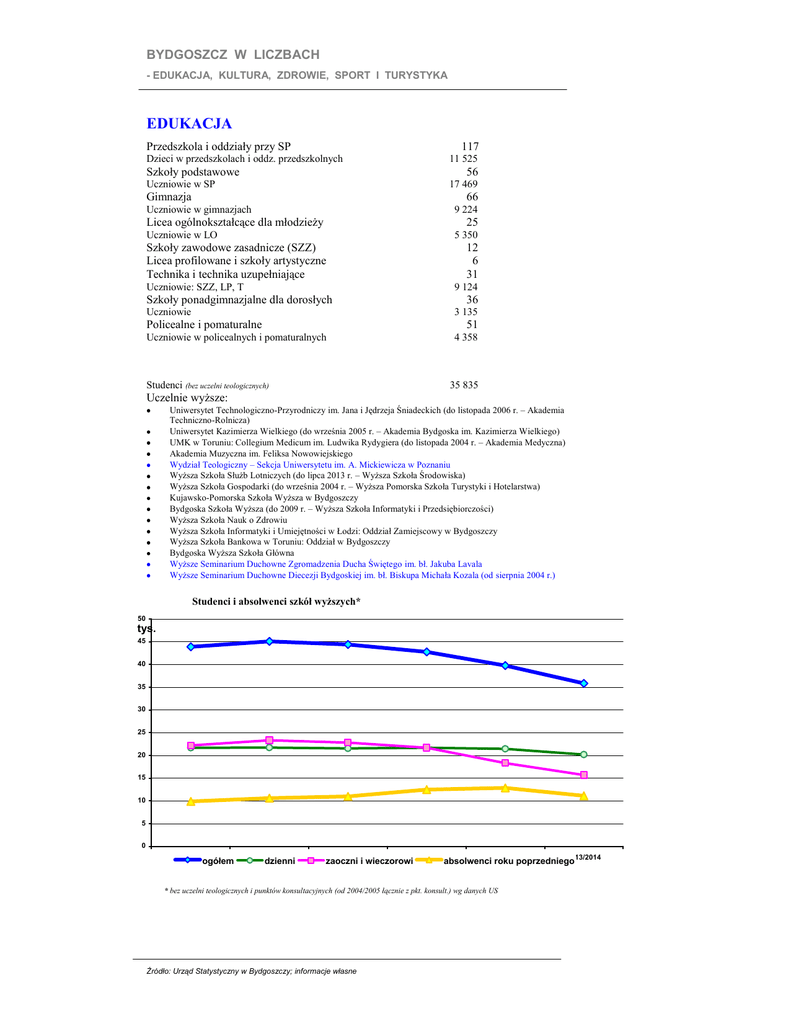 BYDGOSZCZ W LICZBACH - EDUKACJA, KULTURA, ZDROWIE, SPORT I TURYSTYKA EDUKACJA Przedszkola i oddziały przy SP 117 Dzieci w przedszkolach i oddz. przedszkolnych 11 525 Szkoły podstawowe 56 Uczniowie w SP 17 469 Gimnazja 66 Uczniowie w gimnazjach 9 224 Licea ogólnokształcące dla młodzieży 25 Uczniowie w LO 5 350 Szkoły zawodowe zasadnicze (SZZ) Licea profilowane i szkoły artystyczne Technika i technika uzupełniające 12 6 31 Uczniowie: SZZ, LP, T 9 124 Szkoły ponadgimnazjalne dla dorosłych 36 Uczniowie 3 135 Policealne i pomaturalne 51 Uczniowie w policealnych i pomaturalnych 4 358 Studenci (bez uczelni teologicznych) 35 835 Uczelnie wyższe: Uniwersytet Technologiczno-Przyrodniczy im. Jana i Jędrzeja Śniadeckich (do listopada 2006 r. – Akademia Techniczno-Rolnicza) Uniwersytet Kazimierza Wielkiego (do września 2005 r. – Akademia Bydgoska im. Kazimierza Wielkiego) UMK w Toruniu: Collegium Medicum im. Ludwika Rydygiera (do listopada 2004 r. – Akademia Medyczna) Akademia Muzyczna im. Feliksa Nowowiejskiego Wydział Teologiczny – Sekcja Uniwersytetu im. A. Mickiewicza w Poznaniu Wyższa Szkoła Służb Lotniczych (do lipca 2013 r. – Wyższa Szkoła Środowiska) Wyższa Szkoła Gospodarki (do września 2004 r. – Wyższa Pomorska Szkoła Turystyki i Hotelarstwa) Kujawsko-Pomorska Szkoła Wyższa w Bydgoszczy Bydgoska Szkoła Wyższa (do 2009 r. – Wyższa Szkoła Informatyki i Przedsiębiorczości) Wyższa Szkoła Nauk o Zdrowiu Wyższa Szkoła Informatyki i Umiejętności w Łodzi: Oddział Zamiejscowy w Bydgoszczy Wyższa Szkoła Bankowa w Toruniu: Oddział w Bydgoszczy Bydgoska Wyższa Szkoła Główna Wyższe Seminarium Duchowne Zgromadzenia Ducha Świętego im. bł. Jakuba Lavala Wyższe Seminarium Duchowne Diecezji Bydgoskiej im. bł. Biskupa Michała Kozala (od sierpnia 2004 r.) Studenci i absolwenci szkół wyższych* 50 tys. 45 40 35 30 25 20 15 10 5 0 2008/2009 ogółem 2009/2010 dzienni 2010/2011 2011/2012 zaoczni i wieczorowi 2012/2013 * bez uczelni teologicznych i punktów konsultacyjnych (od 2004/2005 łącznie z pkt. konsult.) wg danych US Źródło: Urząd Statystyczny w Bydgoszczy; informacje własne 2013/2014 absolwenci roku poprzedniego BYDGOSZCZ W LICZBACH - EDUKACJA, KULTURA, ZDROWIE, SPORT I TURYSTYKA KULTURA Teatr Polski Filharmonia Pomorska im. I. J. Paderewskiego Opera NOVA Państwowa Opera w Bydgoszczy Muzea Galerie Kina Multikino Cinema City Helios Placówki biblioteczne Kluby muzyczne Ośrodek regionalny TVP Stacje radiowe Redakcje prasowe 1 1 1 5 17 4 1 1 1 34 42 1 6 15 ZDROWIE I OPIEKA SPOŁECZNA Szpitale Centrum Onkologii Szpitale resortowe Sanatorium Żłobki Domy Pomocy Społecznej Domy Dziennego Pobytu 6 1 2 1 8 3 3 SPORT I REKREACJA Stadiony Baseny kryte Baseny otwarte Sztuczne lodowisko (w tym rozbieralne) Hale sportowe Tor żużlowy Tor kartingowy Tor regatowy Akwen do kajak polo Tor speedrowerowy Strzelnice Przystanie kajakowe i wioślarskie Przystanie żeglarskie Kluby i koła TKKF Towarzystwa gimnastyczne „Sokół” 7 10 1 2 13 1 1 1 1 1 10 8 3 18 3 Kompleks rekreacyjno-sportowy „Leśny Park Kultury i Wypoczynku” w Myślęcinku (m.in.: wyciąg narciarski z armatką śniegową, tor saneczkowy, Ośrodek Rekreacji Konnej, autodrom, Myślęcińska Kolejka Parkowa) Hala sportowo-widowiskowa Łuczniczka” (na ok. 6 tys. osób) BAZA TURYSTYCZNA Hotele / miejsca w hotelach Inne obiekty hotelowe / miejsca Pola biwakowe / miejsca Schroniska młodzieżowe / miejsca Zespoły domków turystycznych / miejsca 18 / 1.959 2 / 121 2 / 680 1 / 93 1 / 100 Obsługa ruchu turystycznego: Bydgoskie Centrum Informacji Biura podróży Kasy lotnicze PTTK – oddziały / kluby i koła Źródło: Urząd Statystyczny w Bydgoszczy; informacje własne 1 43 1 4 / 18
