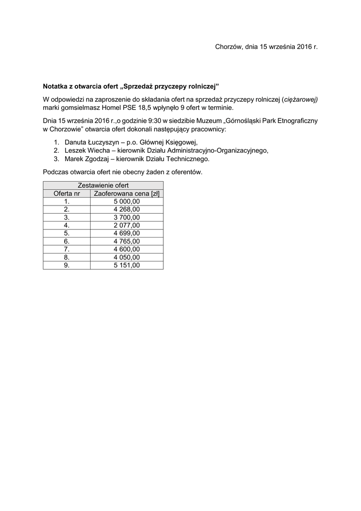 Chorzów, dnia 15 września 2016 r. Notatka z otwarcia ofert „Sprzedaż przyczepy rolniczej” W odpowiedzi na zaproszenie do składania ofert na sprzedaż przyczepy rolniczej (ciężarowej) marki gomsielmasz Homel PSE 18,5 wpłynęło 9 ofert w terminie. Dnia 15 września 2016 r.,o godzinie 9:30 w siedzibie Muzeum „Górnośląski Park Etnograficzny w Chorzowie” otwarcia ofert dokonali następujący pracownicy: 1. Danuta Łuczyszyn – p.o. Głównej Księgowej, 2. Leszek Wiecha – kierownik Działu Administracyjno-Organizacyjnego, 3. Marek Zgodzaj – kierownik Działu Technicznego. Podczas otwarcia ofert nie obecny żaden z oferentów. Zestawienie ofert Oferta nr Zaoferowana cena [zł] 1. 5 000,00 2. 4 268,00 3. 3 700,00 4. 2 077,00 5. 4 699,00 6. 4 765,00 7. 4 600,00 8. 4 050,00 9. 5 151,00