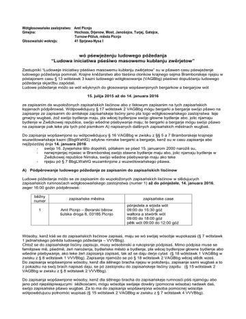 Wótgłosowańske zastojnstwo: Amt Picnjo Gmejna: Hochoza, Drjenow, Most, Janošojce, Turjej, Gatojce, Turnow-Pšiluk, mӗsta Picnjo Głosowański wokrejs: 41 Sprjewa-Nysa I wó pśewjeźenju ludowego póžedanja “Ludowa iniciatiwa pśeśiwo masowemu kubłanju zwěrjetow” Zastupniki “Ludoweje iniciatiwy pśeśiwo masowemu kubłanju zwěrjetow” su w pšawen casu pśewjeźenje ludowego póžedanja pominali. Krajne kněžarstwo abo tśeśina cłonkow krajnego sejma Bramborskeje njejsu w póstajonem casu § 13 wótstawk 3 kazni ludowego wótgłosowanja (VAGBbg) pśeśiwo dopušćenju ludowego póžedanja skjaržbu zapódali. Ludowe póžedanje móžo se wót wšyknych do głosowanja wopšawnjonych bergarkow a bergarjow wót 15. julija 2015 až do 14. januara 2016 ze zapisanim do wupołožonych zapisańskich lisćinow abo z listowym zapisanim na tych zapisańskich łopjenach pódpěrowaś. Wótpowědujucy § 17 wótstawk 2 VAGBbg mógu bergarki a bergarje swójo pšawo na zapisanje ze zapisanim do amtskeje zapisańskeje lisćiny jano pla togo wótgłosowańskego zastojnstwa teje gmejny wugbaś, źož swójo bydlenje maju, pla wěcej bydlenjow swójo głowne bydlenje abo, jolic njamaju bydlenje w Zwězkowej republice, swójo wšedne pśebywanje maju; te bergarki a bergarje mógu swójo pšawo na zapisanje pak teke pla tych pód pismikom A) napisanych dalšnych zapisańskich městnach wugbaś. Do zapisanja wopšawnjone su wótpowědujucy § 16 VAGBbg w zwisku z §§ 5 a 7 Bramborskeje krajneje wuzwólowańskeje kazni (BbgWahlG) wšykne nimske bergarki a bergarje, kenž su w casu zapisanja abo nejžpózdźej dnja 14. januara 2016 swójo 16. žywjeńske lěto dopołnili, pótakem se pśed 15. januarom 2000 naroźili su, nanejmjenjej mjasec w Bramborskej swójo stawne bydlenje maju abo, jolic njamaju bydlenje w Zwězkowej republice Nimska, swójo wšedne pśebywanje maju ako teke njejsu pó § 7 BbgLWahlG wuzamknjone z wuzwólowańskego pšawa. A) Pódpěrowanje ludowego póžedanje ze zapisanim do zapisańskich lisćinow Ludowe póžedanje móžo se ze zapisanim do wupołožonych zapisańskich lisćinow w slědujucych zapisańskich rumnosćach wótgłosowańskego zastojnstwa (numer 1) až do pónjeźele, 14. januara 2016, zeger 16:00 goźin pódpěrowaś: běžny numer zapisańske městna 1 Amt Picnjo – Berarski běrow šulska droga 6, 03185 Picnjo zapisańske case pónjeźela a srjoda wót 09:00 do 15:30 góź wałtora a stwórtk wót 09:00 do 18:00 góź pětk wót 09:00 do 12:00 góź Wósoby, kenž kśě se do zapisańskich lisćinow zapisaś, maju se wó swójej wósobje wupokazaś (§ 7 wótstawk 1 jadnańskego pórěda ludowego póžedanja – VVVBbg). Chtož se do zapisańskeje lisćiny zapisujo, musy wósobinski a rukopisnje pódpisaś. Mimo pódpisa muse se familijowe mě, pśedmě, źeń naroźenja, bydleńske město a bydlenje, pla wěcej bydlenjow głowne bydlenje abo wšedne pśebywanje, ako teke źeń zapisanja zapisaś, tak až se daju derje cytaś (§ 18 wótstawk 1 VAGBbg w zwisku z § 8 wótstawk 1 VVVBbg). Zapisanje njamóžo se pó § 18 wótstawk 2 VAGBbg wěcej slědk wześ. Do zapisanja wopšawnjone wósoby, kenž dla śělnego bracha njejsu w połoženju, zapisanje sami wugbaś a to z pokazku na swój brach napisaś daju, se pó zastojnsku do zapisańskeje lisćiny zapišu (§ 15 wótstawk 2 VAGBbg w zwisku z § 8 wótstawk 2 VVVBbg). Do zapisanja wopšawnjone wósoby, kenž dla śělnego bracha do zapisańskeje rumnosći pśiś njamógu abo jano pód njepśiśpiwajucymi śěžkosćami, mógu wósobje swójeje dowěry (pomocna wósoba) nadawk daś, swójo zapisańske pšawo wugbaś. Za to ma do zapisanja wopšawnjona wósoba pomocnej wósobje wótpowědujucu połnomóc wupisaś (§ 15 wótstawk 2 VAGBbg w zwisku z § 7 wótstawk 4 VVVBbg). B) Pódpěranje ludowego póžedanja z listowym zapisanim Kuždy do zapisanja wopšawnjony ma pšawo, na pšosbu ludowe póžedanje z listowym zapisanim pódpěraś. Pšosba móžo se wót do zapisanja wopšawnjoneje wósoby sameje abo jadneje wót njeje społnomócnjoneje wósoby pisnje, elektroniski (na pśikład z e-mail abo faksom) abo wustnje (za napisanje) we wótgłosowańskem zastojnstwje stajiś, w kótaremž do zapisanja wopšawnjona wósoba swójo bydlenje, pla wěcej bydlenjow swójo głowne bydlenje, abo swójo wšedne pśebywanje ma. Pśi elektroniski stajonej pšosbje musy se źeń naroźenja pšosbu stajuceje wósoby pódaś (§ 15 wótstawk 6 sada 2 w zwisku z § 15 wótstawk 2 sada VAGBbg). Telefoniske stajanje pšosby njejo dowólone. Pšosbu stajeca wósoba móžo pśi stajanju pšosby teke pomoc wósoby swójeje dowěry (pomocneje wósoby) wužywaś (§ 15 wótstawk 6 sada 2 w zwisku z § 15 wótstawk 2 sada 2 VAGBbg). Zapisańske łopjena mógu se až do dwa dnja pśed zakóńcenim zapisańskego casa póžedaś (§ 8a wótstawk 5 VVVBbg). Za listowe zapisanje trěbne pódłožki (zapisańske łopjeno a listowa wobalka) se póžedanje stajucej wósobje dermo pśipósćelu. Zapisaś musy se wósobinski. Chtož dla śělnego bracha w połoženju njejo, listowe zapisanje wósobinski pśewjasć, móžo pomoc jadneje wósoby (pomocna wósoba) wužywaś (§ 15 wótstawk 6 sada 2 w zwisku z § 15 wótstawk 2 sada 2 VAGBbg). Na zapisańskem łopjenje ma do zapisanja wopšawnjona wósoba abo pomocna wósoba napśeśiwo wótgłosowańskemu zastojnstwoju město pśisegi wobwěsćiś, až jo wuzjawjenje pódpěranja ludowego póžedanja wósobinski a pó wuzjawjonej wóli do zapisanja wopšawnjoneje wósoby wótedała (§ 15 wótstawk 7 VAGBbg). Pśi listowem zapisanju musy do zapisanja wopšawnjony zapisańske łopjeno scasom na to na amtskej listowej wobalce pódane městno wótpósłaś, až zapisański list nanejpózdźej 14. januara 2016, do 16.00 góźin dojźo. Zapisański list se we Zwězkowej republice Nimska jadnučki z Nimskim postom AG dermo pósrědnijo. Zapisański list móžo se teke na tom na listowej 