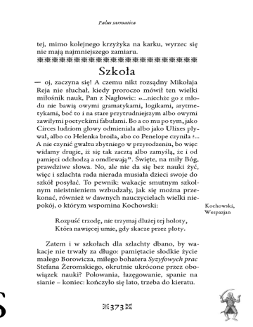S Palus sarmatica tej, mimo kolejnego krzyżyka na karku, wyrzec się nie mają najmniejszego zamiaru. CCCCCCCCCCCCCCCCCCCCCC Szkoła – oj, zaczyna się! A czemu nikt rozsądny Mikołaja Reja nie słuchał, kiedy proroczo mówił ten wielki miłośnik nauk, Pan z Nagłowic: „…niechże go z mło- du nie bawią owymi gramatykami, logikami, arytmetykami, boć to i na stare przytrudniejszym albo owymi zawiłymi poetyckimi fabułami. Bo a co mu po tym, jako Circes ludziom głowy odmieniała albo jako Ulixes pływał, albo co Helenka broiła, abo co Penelope czyniła?… A nie czynić gwałtu zbytniego w przyrodzeniu, bo więc widamy drugie, iż się tak zacztą albo zamyślą, że i od pamięci odchodzą a omdlewają”. Święte, na miły Bóg, prawdziwe słowa. No, ale nie da się bez nauki żyć, więc i szlachta rada nierada musiała dzieci swoje do szkół posyłać. To pewnik: wakacje smutnym szkolnym nieistnieniem wzbudzały, jak się można przekonać, również w dawnych nauczycielach wielki niepokój, o którym wspomina Kochowski: Rozpuść trzodę, nie trzymaj dłużej tej hołoty, Która nawięcej umie, gdy skacze przez płoty. Zatem i w szkołach dla szlachty dbano, by wakacje nie trwały za długo: pamiętacie słodkie życie małego Borowicza, miłego bohatera Syzyfowych prac Stefana Żeromskiego, okrutnie ukrócone przez obowiązek nauki? Polowania, łazęgowanie, spanie na sianie – koniec: kończyło się lato, trzeba do kieratu. D 373E Kochowski, Wespazjan Krzysztof Koehler Od średniowiecza w Polsce istniały szkoły katedralne, potem parafialne oraz szkoły prowadzone przez zakony. W XVI wieku, w związku z reformacją, pojawiły się szkoły „różnowiercze”, niektóre słynne i wspaniałe: w Pińczowie, w Toruniu, w Lesznie czy w XVII wieku w Rakowie. W 1564 roku w Braniewie założyli swoje kolegium jezuici, po czym szybko objęli całą Rzeczpospolitą siecią swej edukacji. W 1599 roku wydali tzw. ratio studiorum – czyli to, co dzisiaj nazywamy jednolitym programem nauczania. Szlachta masowo posyłała swoich synów do kolegiów jezuickich. Uczyli się tam młodzieńcy, którzy już opanowali w stopniu podstawowym sztukę pisania i czytania po łacinie. Musieli więc mieć swoich domowych korepetytorów, mogli też chodzić do szkół parafialnych, gdzie specjalnym na nich okiem spozierał zapewne miejscowy klecha (mógł też dojeżdżać do dworku na prywatne korepetycje). Kiedy rodzice zapisywali chłopców do szkół, mieli oni zwykle 9–10 lat. Podstawą nauczania była łacina, a najbardziej popularnym podręcznikiem do łaciny – „alwar” (Alvarez, De institutione grammatica). Edukacja miała swoje etapy: najpierw była „infima”, potem klasa „gramatyki” (uczono tu składania krótkich zdań), „syntaktyka” (gdzie uczono bardziej skomplikowanej mowy), wreszcie „poetyka” (uczono tu pisania wierszy), na koniec „retoryka” (tu pracowano nad umiejętnością wygłaszania mów). Praktyka szkolna związana była z praktyką życiową szlachty polskiej: nie erudyci byli potrzebni ojczyźnie (oczywiście, kto miał smykałkę do nauki, wędrował albo ścieżką zakonną, albo akademicką). Edukacja służyE 374D S S Palus sarmatica ła obywatelskim powinnościom szlachty. Zatem należało dbać o eruditio: auctores (Cycero, Wergiliusz, Horacy, inni autorzy antyczni, ale też starodawni Polacy) nie tylko przydawali umiejętności wypowiadania się, lecz także służyli w procesie kształtowania Ojcowie (przodkowie) postaw obywatelskich. Pisze Potocki mądrze (jak zawsze): Amor patriae Bonum communae Gdzie kto się czemu święci, w takiej też doktrynie Res publica Ćwiczy; szlachcic byle się przedać po łacinie Negotium Nie dał, byle rozumiał w kościele i grodzie… Potocki, Byle umiał Tacyta zażyć z Cyceronem, Wacław A Seneki do tego, dosyć jest uczonym… Szkoła jezuicka przynosiła wiele możliwości „zasługiwania się”. Słynne były popisy młodzieży studenckiej na koniec roku, kiedy to w obecności rodziców wystawiano sztuki teatralne, a młodzieńcy wygłaszali mowy; drukowano też wybory co celniejszych wierszy napisanych przez uczniów w ciągu roku szkolnego. Tak samo wszelkie uroczystości kościelne i lokalne były okazją do przedstawienia dokonań szkoły. Nauką kierowali dyrektorzy (inspektorzy), czyli opłacani przez rodziców korepetytorzy; w szkole rządził „bizun”. O, z wieków cudotwórny synu byczej skóry! Złych duchów egzorcysto, poprawco natury! Stróżu durnej młodości, proszku doskonały Na upór, muchy w nosie, miłosne zapały – pisał wychowanek jezuitów, poeta Naruszewicz. D 375E (Biecz i okolice) Krzysztof Koehler No, ale znacznie więcej o edukacji szlacheckiej w postaci wspomnień niebieskiego mundurka opowie Państwu obiekt gimnastyki dydaktycznej, Marcin Matuszewicz (ur. 1714): „Posłany byłem potem do szkół jezuickich do Brześcia do gramatyki i jmć pan pułkownik brat mój, bardzo mały, bo w zaczętym piątym roku, był ze mną oddany. (…) W szkołach dał mi Pan Bóg wielką pamięć, tak dalece, że raz bez błędu cały alwar przerecytowałem. (…) My też mieliśmy inspektora Wolskiego, z województwa płockiego ostrego tak dalece, że chłopiec nasz jeden się umyślnie utopił, a dwóch uciekło. Jmć pana pułkownika, brata mego niemiłosiernie a często niewinnie bijał. Był to człowiek naturalnie okrutny, do buntów szkolnych skłonny. Z tej okoliczności lubił studentów częstować [kielichem], co i we mnie oszczędną bardzo rodziców moich edukacją zwyciężyło i było pobudką do chęci i inklinacji w częstowaniu. (…) Oddani byliśmy potem z bratem moim, jmć panem pułkownikiem do szkół jezuickich pod tymże inspektorem do Drohiczyna. (…) Ja poszedłem do poetyki, a jmć pan pułkownik do infimy. W poetyce, znając do siebie daną mi łaski boskiej wielką pamięć i w naukach pojętność, zacząłem być niedbałym i o jakowej
