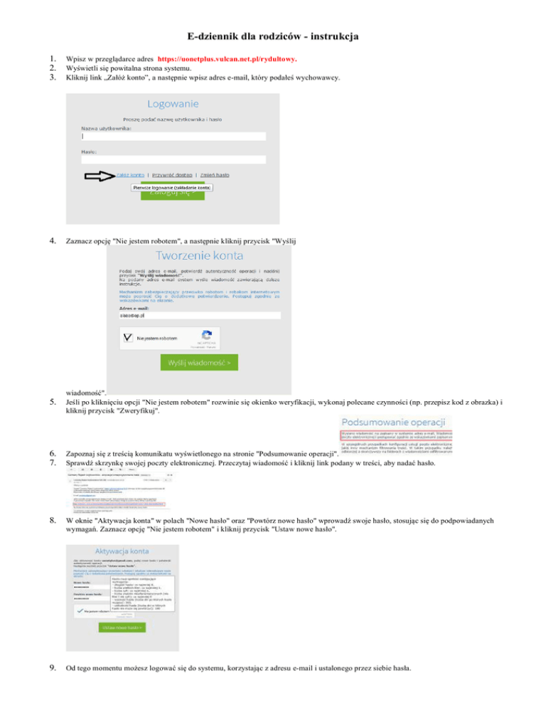 E-dziennik dla rodziców - instrukcja 1. 2. 3. Wpisz w przeglądarce adres https://uonetplus.vulcan.net.pl/rydultowy. Wyświetli się powitalna strona systemu. Kliknij link „Załóż konto”, a następnie wpisz adres e-mail, który podałeś wychowawcy. 4. Zaznacz opcję "Nie jestem robotem", a następnie kliknij przycisk "Wyślij 5. wiadomość". Jeśli po kliknięciu opcji "Nie jestem robotem" rozwinie się okienko weryfikacji, wykonaj polecane czynności (np. przepisz kod z obrazka) i kliknij przycisk "Zweryfikuj". 6. 7. Zapoznaj się z treścią komunikatu wyświetlonego na stronie "Podsumowanie operacji". Sprawdź skrzynkę swojej poczty elektronicznej. Przeczytaj wiadomość i kliknij link podany w treści, aby nadać hasło. 8. W oknie "Aktywacja konta" w polach "Nowe hasło" oraz "Powtórz nowe hasło" wprowadź swoje hasło, stosując się do podpowiadanych wymagań. Zaznacz opcję "Nie jestem robotem" i kliknij przycisk "Ustaw nowe hasło". 9. Od tego momentu możesz logować się do systemu, korzystając z adresu e-mail i ustalonego przez siebie hasła.