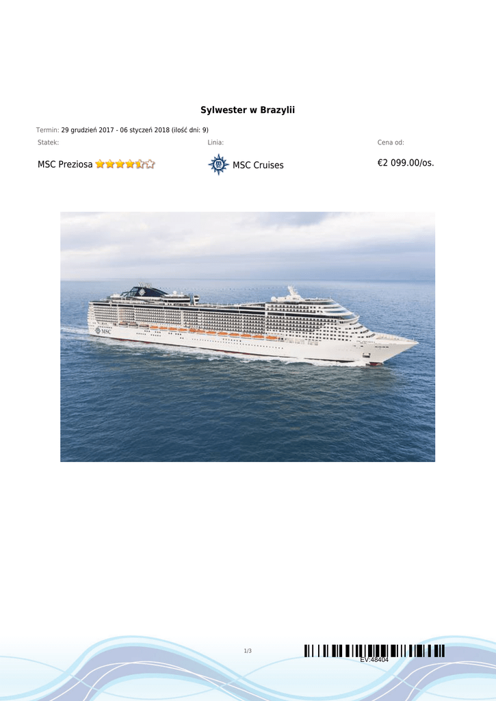Sylwester w Brazylii Termin: 29 grudzień 2017 - 06 styczeń 2018 (ilość dni: 9) Statek: MSC Preziosa Linia: Cena od: MSC Cruises €2 099.00/os. 1/3 EV:48404 TRASA REJSU dzień 1 dzień 2 dzień 3 Data Port Wpłynięcie Wypłynięcie piątek 29.12.2017 Santos --:-- 19:00 09:00 19:00 08:00 14:00 20:00 --:-- --:-- 02:00 17:00 --:-- --:-- 18:00 sobota 30.12.2017 niedziela 31.12.2017 Brazylia Ilhabela Brazylia Buzios Brazylia niedziela 31.12.2017 Copacabana poniedziałek 01.01.2018 Copacabana wtorek 02.01.2018 Salvador da Bahia środa 03.01.2018 Salvador da Bahia dzień 7 czwartek 04.01.2018 Dzień na morzu --:-- --:-- dzień 8 piątek 05.01.2018 Cabo Frio 08:00 16:00 sobota 06.01.2018 Santos 06:00 --:-- dzień 3 dzień 4 dzień 5 dzień 6 dzień 9 Legenda Brazylia Brazylia Brazylia Brazylia Brazylia Brazylia CENNIK Cena katalogowa Kabina wewnętrzna od €2 099.00 Kabina zewnętrzna z oknem od €2 629.00 Kabina zewnętrzna z balkonem od €3 299.00 Suite (apartament) od €4 359.00 Cena promocyjna 2/3 EV:48404 MSC Yacht Club Suite na zapytanie Kabina jednoosobowa na zapytanie 3 i 4 osoba dorosła w kabinie na zapytanie dziecko od 12 do 17 lat jako 3 i 4 osoba w kabinie na zapytanie dziecko od 2 do 11 lat jako 3 i 4 osoba w kabinie tylko opłaty portowe Opłaty portowe €150.00 Uwaga! Ceny za osobę w kabinie dwuosobowej. Cena zawiera: zakwaterowanie w kabinie wybranej kategorii; wyżywienie - 3 główne posiłki, przekąski między posiłkami, bufet lub przekąski o północy; napoje serwowane do śniadania i w bufetach samoobsługowych; serwis bagażowy podczas wejścia i zejścia ze statku; serwis kabinowy; korzystanie ze wszystkich urządzeń sportowo - rekreacyjnych znajdujących się na pokładzie statku (basen, jacuzzi, sala fitness, itp.); udział we wszystkich imprezach organizowanych na statku (przedstawienia w teatrze, koncerty, programy animacyjne itp.). Cena nie zawiera: kosztów dojazdu do portu; opłat portowych; ewentualnych noclegów w hotelu przed/po rejsie i transferów; wycieczek fakultatywnych w trakcie rejsu; korzystania z barów, mini baru w kabinie oraz napojów zamawianych w restauracji; korzystania z punktów usługowych (fryzjer, pralnia, fotograf, salon piękności i odnowy biologicznej, internet) i wydatków osobistych; napiwków dla obsługi na statku (kwota uzależniona od długości rejsu); ubezpieczenia KL, NNW i bagaż, kosztów wiz (tam gdzie wymagane). Uwagi: na wszystkich rejsach MSC Cruises można zarezerwować pakiety all inclusive: Allegrissimo 24h: 26€/os./dzień i 12€/dziecko/dzień; Allegrissimo Premium: 44€/os./dzień i 21€/dziecko/dzień (pakiet musi być wykupiony przez każdą osobę zakwaterowaną w kabinie - można zakupić w biurze przed rejsem). Na Państwa życzenie zarezerwujemy przelot, transfery do/z portu, parking, dodatkowe noclegi oraz zadbamy o odpowiednie ubezpieczenie podróżne. 3/3 EV:48404