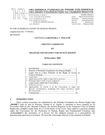 IN THE EUROPEAN COURT OF HUMAN RIGHTS (Application No. 77765/01) BETWEEN LUCYNA LASKOWSKA V. POLAND WRITTEN COMMENTS BY HELSINKI FOUNDATION FOR HUMAN RIGHTS 28 December 2005 TABLE OF CONTENTS 1. 2. 3. Introduction ....................................................................2 Interest of Helsinki Foundation for Human Rights ........2 Legal Aid as a Key Element of the Right of Access to Court in Poland................................................................3 3.1 Legal basis ..............................................................................3 3.2 Application of the right to legal aid in practice.......................4 3.3 Potential effect of the Court's judgment...................................6 4. Legal issues under the Convention .................................7 4.1 General overview ................................................. ..................7 4.2 Applicability of Article 6 of the Convention to legal aid. Special circumstances justifying free legal assistance under the Convention ...................................................................... .7 5. 1. Conclusions ...................................................................10 INTRODUCTION 1. These written comments are submitted by the Helsinki Foundation for Human Rights (the „HFHR”) with its seat in Warsaw, Poland at ul. Zgoda 11 pursuant to leave granted on 28 November 2005 by Mr. Michael O’Boyle, the Section Registrar in the European Court of Human Rights (the „Court”) under Rule 44 § 2 of the Rules of the Court. They address a question whether under the Convention for the Protection of Human Rights and Fundamental Freedoms (the „Convention”) the assistance of a lawyer for the indigent persons is a precondition for guaranteeing equal access to justice. We provide a thorough analysis of the situation in Poland, 1 including both the description of legal environment and existing practice of the judiciary and lawyers within the legal aid scheme. Furthermore, we concentrate on answering the question whether in the light of the Convention the current legislative framework in Poland provides satisfactory protection of the right to legal aid. Our submissions do not include any comments on the facts or merits of the case, but we focus on addressing general principles involved in the solution of the case. However, taking into consideration the fact that the present case poses a question of the legal aid in civil cases, we consequently limit our observations to such a scope. 2. INTEREST OF HELSINKI FOUNDATION FOR HUMAN RIGHTS 2. HFHR is a non-governmental organization established in 1989 by members of the Helsinki Committee in Poland, in order to promote human rights and rule of law in Poland as well as to contribute to the development of an open society in Poland. One of the activities of the HFHR includes legal actions undertaken in the public interest, including the representation of parties and preparation of legal submissions to national and international courts and tribunals, particularly within the framework of the Strategic Litigation Program. The aim of such submissions is to influence the process of changing laws and practices that we find contrary to human rights. 3. HFHR since its establishment has been promoting the standards of the European Convention on Human Rights both among the judiciary and lawyers practising in Poland. This refers specifically to guarantees of a fair trial under Article 6 of the Convention, including the right to legal aid. In particular, HFHR conducted in recent years an in-depth survey concerning access to legal aid. The survey constituted a part of the project on Promoting Access to Justice in Central and Eastern Europe. The survey itself embraced review of the law, analysis of jurisprudences of both Polish and international courts, cases studies, analysis of statistical data and an empirical survey in the courts and penitentiaries. Eventually, it led to preparation of a comprehensive monitoring Report on Access to Legal Aid in Poland in 20031 (hereinafter refer to as the „Report”) and provoked a public debate involving representatives of judiciary and prosecuting authorities, as well as advocates, legal advisers and representatives of non-governmental organisations. The Report demonstrated a number of restrictions in access to legal aid for the indigent persons and revealed a need to introduce substantial changes in this system. Moreover, HFHR continues monitoring of the activities of advocates and legal advisers. In particular, through submitting our opinions to the President of the Republic of Poland, and expressing our concerns about the access to legal professions, we have successfully supported the process of the opening of legal professions in Poland, which has been recently speeded up. We also actively participate in works on the new law on access to free legal assistance for natural persons, which is likely to be a subject of the Polish Parliament’s debate in the near future. 4. We hope that our written comments may be of some assistance to this Honourable Court in deciding on the question involved. We believe that giving the opinion by the Court on the existing legal framework and practice in Poland may draw attention to eventual procedural shortcomings and may bring about further public discussion regarding this human rights sensitive issue. The need to obtain the Honourable Court’s view in this matter is of special importance now, when having before the Polish Parliament a draft of the new law on access to free legal assistance as mentioned above. The proposed law creates a mechanism of obtaining legal aid via an independent body and may lead to certain standardisation of the mechanisms for granting legal aid. This, for sure, after recent reforms which led to opening of legal professions, will constitute a next positive element in improving legal environment and might increase protection of human rights in Poland. 1 Acce