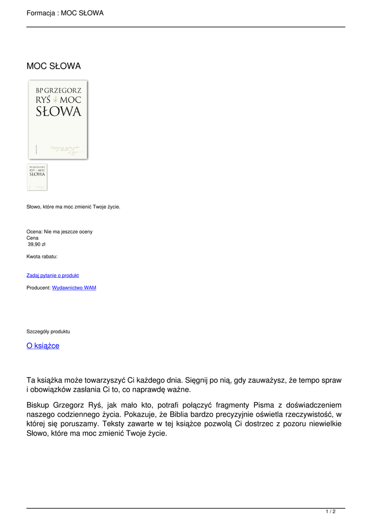 Formacja : MOC SŁOWA MOC SŁOWA Słowo, które ma moc zmienić Twoje życie. Ocena: Nie ma jeszcze oceny Cena 39,90 zł Kwota rabatu: Zadaj pytanie o produkt Producent: Wydawnictwo WAM Szczegóły produktu O książce Ta książka może towarzyszyć Ci każdego dnia. Sięgnij po nią, gdy zauważysz, że tempo spraw i obowiązków zasłania Ci to, co naprawdę ważne. Biskup Grzegorz Ryś, jak mało kto, potrafi połączyć fragmenty Pisma z doświadczeniem naszego codziennego życia. Pokazuje, że Biblia bardzo precyzyjnie oświetla rzeczywistość, w której się poruszamy. Teksty zawarte w tej książce pozwolą Ci dostrzec z pozoru niewielkie Słowo, które ma moc zmienić Twoje życie. 1/2 Formacja : MOC SŁOWA Opinie Nikt jeszcze nie oceniał tego produktu. 2/2 Powered by TCPDF (www.tcpdf.org)