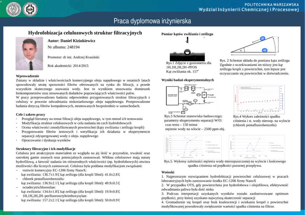 Praca dyplomowa inżynierska Hydrofobizacja celulozowych struktur filtracyjnych Pomiar kątów zwilżania i ześlizgu Autor: Daniel Kiziukiewicz Nr albumu: 248194 α Promotor: dr inż. Andrzej Krasiński Rok akademicki: 2014/2015 Wprowadzenie Zmiany w składzie i właściwościach komercyjnego oleju napędowego w ostatnich latach spowodowały utratę sprawności filtrów oferowanych na rynku do filtracji, a przede wszystkim skutecznego usuwania wody. Jest to wynikiem stosowania domieszek biokomponentów oraz stosowanych dodatków poprawiających właściwości paliw. W pracy przeprowadzono badania odpowiednio przygotowanych struktur filtracyjnych z celulozy w procesie odwadniania niskosiarkowego oleju napędowego. Przeprowadzone badania dotyczą filtrów kompaktowych, montowanych bezpośrednio w samochodach. Cele i zakres pracy - Przegląd literatury na temat filtracji oleju napędowego, w tym metod ich testowania - Modyfikacja struktur celulozowych w celu nadania im cech hydrofobowych - Ocena właściwości zmodyfikowanych powierzchni (kąty zwilżania i ześlizgu kropli) - Przygotowanie filtrów testowych i weryfikacja ich działania w eksperymencie separacji zdyspergowanej wody z oleju. napędowego - Opracowanie i dyskusja wyników Struktury filtracyjne i ich modyfikacje Celuloza jest atrakcyjnym materiałem ze względu na jej ilość w przyrodzie, trwałość oraz szerokiej gamie znanych oraz potencjalnych zastosowań. Włókna celulozowe mają naturę hydrofilową, a łatwość nadania im różnorodnych właściwości (np. hydrofobowych) otwiera możliwości dla licznych zastosowań. Celuloza była poddana modyfikacjom związkami: – roztwór komercyjny EC-1206 firmy NanoX: kąt zwilżania: 136.7±1.9°, kąt ześlizgu (dla kropli 50ml): 41.0±2.8°, – chlorek pentafluorobenzoilu: kąt zwilżania: 136.9±2.1°, kąt ześlizgu (dla kropli 50ml): 49.9±0.5°, – octadecytrichlorosilan: kąt zwilżania: 134.6±1.8°, kąt ześlizgu (dla kropli 50ml): 19.9±0.8°, – 1H,1H,2H,2H–perfluorooctyltriethoxysylan: kąt zwilżania: 157.2±2.1°, kąt ześlizgu (dla kropli 50ml): 50.0±0.9°. Rys.1 Zdjęcie z goniometru dla 1H,1H,2H,2H–PFOS Kąt zwilżania ok. 157̊ Rys. 2 Schemat układu do pomiaru kąta ześlizgu Zgodnie z oczekiwaniami im niższy jest kąt ześlizgu kropli z powierzchni, tym lepsze jest oczyszczanie się powierzchni w doświadczeniu. Wyniki badań eksperymentalnych Rys.3 Schemat stanowiska badawczego; parametry eksperymentu separacji W/O: czas testu – 150 minut stężenie wody na wlocie – 2500 ppm obj. Rys.4 Wykres zależności spadku ciśnienia i st. wody nierozp. na wylocie (chlorek pentafluorobenzoilu) Rys.5. Wykresy zależności stężenia wody nierozpuszczonej na wylocie i końcowego spadku ciśnienia od prędkości pozornej przepływu. Wnioski 1. Najprostszym rozwiązaniem hydrofobizacji powierzchni celulozowej w pracach laboratoryjnych było zastosowanie środka EC-1206 firmy NanoX 2. W przypadku OTS, gdy powierzchnia jest hydrofobowa i olejofilowa, efektywność odwadniania paliwa była dość niska 3. Podczas interpretacji uzyskanych wyników zostało zaobserwowane optimum prędkości, przy której uzyskano najwyższą skuteczność separacji 4. Gromadzenie się kropel oraz brak koalescencji i ociekania kropel z powierzchni modyfikowanej powodowały zwiększenie wartości spadku ciśnienia na filtrze.