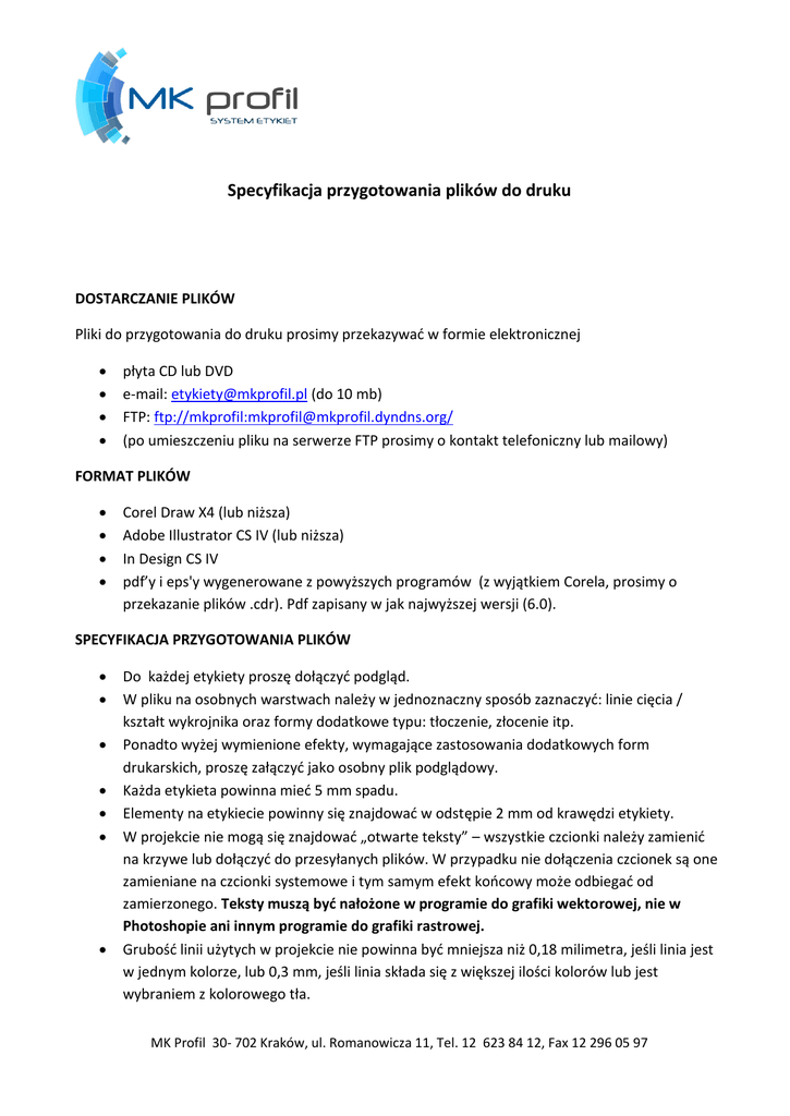 Specyfikacja przygotowania plików do druku DOSTARCZANIE PLIKÓW Pliki do przygotowania do druku prosimy przekazywać w formie elektronicznej płyta CD lub DVD e-mail: [email protected] (do 10 mb) FTP: ftp://mkprofil:[email protected]/ (po umieszczeniu pliku na serwerze FTP prosimy o kontakt telefoniczny lub mailowy) FORMAT PLIKÓW Corel Draw X4 (lub niższa) Adobe Illustrator CS IV (lub niższa) In Design CS IV pdf’y i eps'y wygenerowane z powyższych programów (z wyjątkiem Corela, prosimy o przekazanie plików .cdr). Pdf zapisany w jak najwyższej wersji (6.0). SPECYFIKACJA PRZYGOTOWANIA PLIKÓW Do każdej etykiety proszę dołączyć podgląd. W pliku na osobnych warstwach należy w jednoznaczny sposób zaznaczyć: linie cięcia / kształt wykrojnika oraz formy dodatkowe typu: tłoczenie, złocenie itp. Ponadto wyżej wymienione efekty, wymagające zastosowania dodatkowych form drukarskich, proszę załączyć jako osobny plik podglądowy. Każda etykieta powinna mieć 5 mm spadu. Elementy na etykiecie powinny się znajdować w odstępie 2 mm od krawędzi etykiety. W projekcie nie mogą się znajdować „otwarte teksty” – wszystkie czcionki należy zamienić na krzywe lub dołączyć do przesyłanych plików. W przypadku nie dołączenia czcionek są one zamieniane na czcionki systemowe i tym samym efekt końcowy może odbiegać od zamierzonego. Teksty muszą być nałożone w programie do grafiki wektorowej, nie w Photoshopie ani innym programie do grafiki rastrowej. Grubość linii użytych w projekcie nie powinna być mniejsza niż 0,18 milimetra, jeśli linia jest w jednym kolorze, lub 0,3 mm, jeśli linia składa się z większej ilości kolorów lub jest wybraniem z kolorowego tła. MK Profil 30- 702 Kraków, ul. Romanowicza 11, Tel. 12 623 84 12, Fax 12 296 05 97 Wszelkie efekty użyte w pliku muszą zostać przygotowane na poziomie bitmapy i w niej spłaszczone (m.in. cienie, rozjaśnienia, przenikanie, transparencje). Przejścia tonalne mogą przyjmować minimalną wartość 8% koloru. Ze względu na efekt przyrostu punktu drukarskiego, niemożliwe jest uzyskanie przejścia tonalnego do 0% koloru. Należy to uwzględnić również przy projektowaniu cieni na białym podłożu – ich odcięcie na krawędziach będzie widoczne na poziomie 10% koloru. Szczegóły użycia czcionek: minimalna wysokość czcionki jednokolorowej – 4 pkt., minimalna wysokość czcionki w składowych CMYK – 8 pkt. napisy w kontrze (ciemne tło i białe teksty) w siatkach CMYK w wielkości 8 pkt. napisy w kontrze (ciemne tło i białe teksty) w jednolitej apli w wielkości 6 pkt. Po dostarczeniu materiałów , plik zostanie przesłany do akceptacji merytorycznej u klienta. W pliku wysłanym do akceptacji trzeba sprawdzić poprawność przeliczenia pliku, rozmieszczenie wszystkich elementów oraz ich zgodność z zamierzeniami Przez termin dostarczenia materiałów, rozumiana jest data otrzymania poprawnie przygotowanych plików. Błędnie przygotowane pliki i materiały mogą wpłynąć na czas wykonania zlecenia. Firma MK profil nie bierze odpowiedzialności za błędy wynikające ze złego przygotowania materiałów przez Zamawiającego do wydruku. AKCEPTACJA KOLORYSTYCZNA Na życzenie klienta akceptacja kolorystyczna dokonywana jest na podstawie proofa wykonanego na drukarce atramentowej, z uwzględnieniem odpowiedniego profilu kolorystycznego. Kolorystyka wydruku może się różnić od ostatecznie drukowanej etykiety – do ok. 10% – ze względu na zastosowanie różnych technik wydruku (należy każdorazowo uzgodnić możliwość wystąpienia takich odstępstw). Proof nie odwzorowuje zjawiska rastra, a tym samym jego liniatury. Kolory Pantone dostosowywane są do wzornika Pantone Matching System. Możliwa jest też akceptacja na podstawie pliku z podglądem separacji kolorów. MK Profil 30- 702 Kraków, ul. Romanowicza 11, Tel. 12 623 84 12, Fax 12 296 05 97