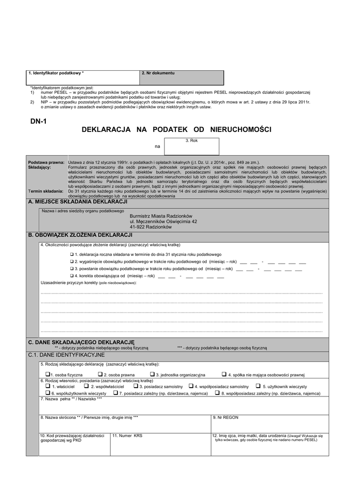 1. Identyfikator podatkowy * 2. Nr dokumentu *Identyfikatorem podatkowym jest: 1) numer PESEL – w przypadku podatników będących osobami fizycznymi objętymi rejestrem PESEL nieprowadzących działalności gospodarczej lub niebędących zarejestrowanymi podatnikami podatku od towarów i usług; 2) NIP – w przypadku pozostałych podmiotów podlegających obowiązkowi ewidencyjnemu, o których mowa w art. 2 ustawy z dnia 29 lipca 2011r. o zmianie ustawy o zasadach ewidencji podatników i płatników oraz niektórych innych ustaw. DN-1 DEKLARACJA NA PODATEK OD NIERUCHOMOŚCI 3. Rok na Podstawa prawna: Ustawa z dnia 12 stycznia 1991r. o podatkach i opłatach lokalnych (j.t. Dz. U. z 2014r., poz. 849 ze zm.). Składający: Formularz przeznaczony dla osób prawnych, jednostek organizacyjnych oraz spółek nie mających osobowości prawnej będących właścicielami nieruchomości lub obiektów budowlanych, posiadaczami samoistnymi nieruchomości lub obiektów budowlanych, użytkownikami wieczystymi gruntów, posiadaczami nieruchomości lub ich części albo obiektów budowlanych lub ich części, stanowiących własność Skarbu Państwa lub jednostki samorządu terytorialnego oraz dla osób fizycznych będących współwłaścicielami lub współposiadaczami z osobami prawnymi, bądź z innymi jednostkami organizacyjnymi nieposiadającymi osobowości prawnej. Termin składania: Do 31 stycznia każdego roku podatkowego lub w terminie 14 dni od zaistnienia okoliczności mających wpływ na powstanie (wygaśnięcie) obowiązku podatkowego lub na wysokość opodatkowania A. MIEJSCE SKŁADANIA DEKLARACJI Nazwa i adres siedziby organu podatkowego Burmistrz Miasta Radzionków ul. Męczenników Oświęcimia 42 41-922 Radzionków B. OBOWIĄZEK ZŁOŻENIA DEKLARACJI 4. Okoliczności powodujące złożenie deklaracji (zaznaczyć właściwą kratkę) 1. deklaracja roczna składana w terminie do dnia 31 stycznia roku podatkowego 2. wygaśnięcie obowiązku podatkowego w trakcie roku podatkowego od (miesiąc – rok) ___ ___ 3. powstanie obowiązku podatkowego w trakcie roku podatkowego od (miesiąc – rok) ___ ___ 4. korekta obowiązująca od (miesiąc – rok) ___ ___ - - ___ ___ ___ ___ ___ ___ ___ ___ ___ ___ ___ ___ Uzasadnienie przyczyn korekty (pole nieobowiązkowe): …………………………………………………………………………………………………………………………………………………………………………………… …………………………………………………………………………………………………………………………………………………………………………………… …………………………………………………………………………………………………………………………………………………………………………………… …………………………………………………………………………………………………………………………………………………………………………………… …………………………………………………………………………………………………………………………………………………………………………………… C. DANE SKŁADAJĄCEGO DEKLARACJĘ ** - dotyczy podatnika niebędącego osobą fizyczną *** - dotyczy podatnika będącego osobą fizyczną C.1. DANE IDENTYFIKACYJNE 5. Rodzaj składającego deklarację (zaznaczyć właściwą kratkę): 1. osoba fizyczna 2. osoba prawna 3. jednostka organizacyjna 4. spółka nie mająca osobowości prawnej 6. Rodzaj własności, posiadania (zaznaczyć właściwą kratkę) 1. właściciel 2. współwłaściciel 3. posiadacz samoistny 4. współposiadacz samoistny 5. użytkownik wieczysty 6. współużytkownik wieczysty 7. Nazwa pełna ** / Nazwisko *** 7. posiadacz zależny (np. dzierżawca, najemca) 8. współposiadasz zależny (np. dzierżawca, najemca) 8. Nazwa skrócona ** / Pierwsze imię, drugie imię *** 9. Nr REGON 10. Kod przeważającej działalności gospodarczej wg PKD 12. Imię ojca, imię matki, data urodzenia (Uwaga! Wykazuje się 11. Numer KRS tylko wówczas, gdy osobie fizycznej nie nadano numeru PESEL) C.1.1. ADRES SIEDZIBY ** / ZAMIESZKANIA *** 13. Kraj 14. Województwo 16. Gmina 17. Ulica 19. Miejscowość 20. Kod pocztowy 15. Powiat 18. Numer domu / Numer lokalu 21. Numer telefonu (pole nieobowiązkowe) 22. Adres e-mail (pole nieobowiązkowe) C.1.2. ADRES DO KORESPONDENCJI (należy wypełnić w przypadku, gdy adres do korespondencji jest inny niż adres siedziby / zamieszkania) 23. Kraj 24. Województwo 26. Gmina 27. Ulica 29. Miejscowość 25. Powiat 28. Numer domu / Numer lokalu 30. Kod pocztowy 31. Poczta D. DANE O NIERUCHOMOŚCIACH I OBIEKTACH BUDOWLANYCH PODLEGAJĄCYCH OPODATKOWANIU LUB ZWOLNIENIU D.1. POŁOŻENIE NIERUCHOMOŚCI 32. Gmina 33. Ulica 34. Nr domu 35. Nr lokalu RADZIONKÓW D.2. DATA NABYCIA NIERUCHOMOŚCI 36. D.3. IDENTYFIKATORY GEODEZYJNE DZIAŁEK, BUDYNKÓW, LOKALI 1) 37. Działki: Karta mapy Nr działki Rodzaj użytków 38. Budynki: 39. Lokale: 1) identyfikatory wykazuje się, jeżeli zostały nadane Powierzchnia działki Księga wieczysta Nazwa sądu E. DANE DOTYCZĄCE PRZEDMIOTÓW OPODATKOWANIA (z wyjątkiem zwolnionych) Stawka podatku wynikająca z Uchwały Rady Miasta Radzionków Podstawa opodatkowania Wyszczególnienie zł, Kwota podatku gr zł, E.1. POWIERZCHNIA GRUNTÓW (Uwaga! Wykazujemy z dokładnością do 1 m2) 1. związanych z prowadzeniem działalności gospodarczej, bez względu na sposób zakwalifikowania w ewidencji gruntów i budynków 40. 41. m 2. pod wodami powierzchniowymi stojącymi lub wodami powierzchniowymi płynącymi jezior i zbiorników sztucznych 43. 3. zakwalifikowanych w ewidencji gruntów i budynków jako drogi oznaczone symbolem „dr”, położonych na terenie gospodarstw rolnych 46. 4. niezabudowanych objętych obsz