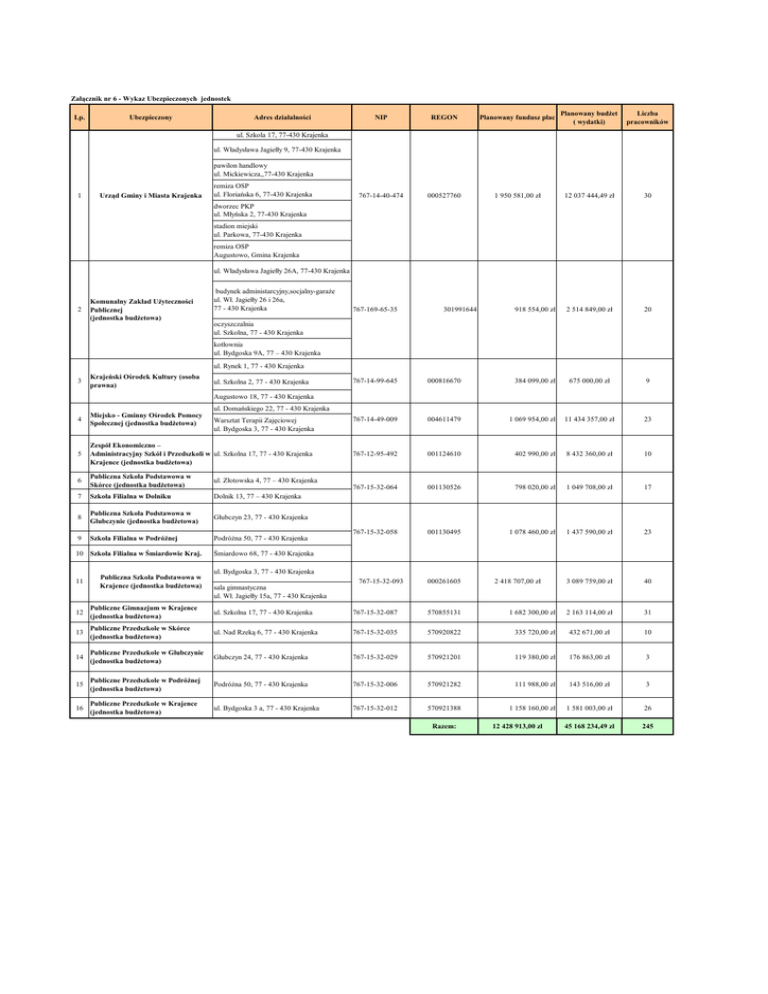 Załącznik nr 6 - Wykaz Ubezpieczonych jednostek Lp. Ubezpieczony Adres działalności NIP REGON Planowany fundusz płac Planowany budżet ( wydatki) Liczba pracowników 767-14-40-474 000527760 1 950 581,00 zł 12 037 444,49 zł 30 918 554,00 zł 2 514 849,00 zł 20 675 000,00 zł 9 ul. Szkola 17, 77-430 Krajenka ul. Władysława Jagiełły 9, 77-430 Krajenka pawilon handlowy ul. Mickiewicza,,77-430 Krajenka 1 Urząd Gminy i Miasta Krajenka remiza OSP ul. Floriańska 6, 77-430 Krajenka dworzec PKP ul. Młyńska 2, 77-430 Krajenka stadion miejski ul. Parkowa, 77-430 Krajenka remiza OSP Augustowo, Gmina Krajenka ul. Władysława Jagiełły 26A, 77-430 Krajenka 2 Komunalny Zakład Użyteczności Publicznej (jednostka budżetowa) budynek administarcyjny,socjalny-garaże ul. Wł. Jagiełły 26 i 26a, 77 - 430 Krajenka 767-169-65-35 301991644 oczyszczalnia ul. Szkolna, 77 - 430 Krajenka kotłownia ul. Bydgoska 9A, 77 – 430 Krajenka ul. Rynek 1, 77 - 430 Krajenka 3 Krajeński Ośrodek Kultury (osoba prawna) ul. Szkolna 2, 77 - 430 Krajenka 767-14-99-645 000816670 384 099,00 zł 767-14-49-009 004611479 1 069 954,00 zł 11 434 357,00 zł 23 767-12-95-492 001124610 402 990,00 zł 8 432 360,00 zł 10 767-15-32-064 001130526 798 020,00 zł 1 049 708,00 zł 17 767-15-32-058 001130495 1 078 460,00 zł 1 437 590,00 zł 23 3 089 759,00 zł 40 2 163 114,00 zł 31 Augustowo 18, 77 - 430 Krajenka ul. Domańskiego 22, 77 - 430 Krajenka 4 Miejsko - Gminny Ośrodek Pomocy Społecznej (jednostka budżetowa) 5 Zespół Ekonomiczno – Administracyjny Szkół i Przedszkoli w ul. Szkolna 17, 77 - 430 Krajenka Krajence (jednostka budżetowa) 6 Publiczna Szkoła Podstawowa w Skórce (jednostka budżetowa) ul. Złotowska 4, 77 – 430 Krajenka 7 Szkoła Filialna w Dolniku Dolnik 13, 77 – 430 Krajenka 8 Publiczna Szkoła Podstawowa w Głubczynie (jednostka budżetowa) Głubczyn 23, 77 - 430 Krajenka 9 Szkoła Filialna w Podróżnej Podróżna 50, 77 - 430 Krajenka 10 Szkoła Filialna w Śmiardowie Kraj. 11 12 Publiczna Szkoła Podstawowa w Krajence (jednostka budżetowa) Publiczne Gimnazjum w Krajence (jednostka budżetowa) Publiczne Przedszkole w Skórce 13 (jednostka budżetowa) Warsztat Terapii Zajęciowej ul. Bydgoska 3, 77 - 430 Krajenka Śmiardowo 68, 77 - 430 Krajenka ul. Bydgoska 3, 77 - 430 Krajenka 767-15-32-093 000261605 2 418 707,00 zł sala gimnastyczna ul. Wł. Jagiełły 15a, 77 - 430 Krajenka ul. Szkolna 17, 77 - 430 Krajenka 767-15-32-087 570855131 1 682 300,00 zł ul. Nad Rzeką 6, 77 - 430 Krajenka 767-15-32-035 570920822 335 720,00 zł 432 671,00 zł 10 14 Publiczne Przedszkole w Głubczynie (jednostka budżetowa) Głubczyn 24, 77 - 430 Krajenka 767-15-32-029 570921201 119 380,00 zł 176 863,00 zł 3 15 Publiczne Przedszkole w Podróżnej (jednostka budżetowa) Podróżna 50, 77 - 430 Krajenka 767-15-32-006 570921282 111 988,00 zł 143 516,00 zł 3 16 Publiczne Przedszkole w Krajence (jednostka budżetowa) ul. Bydgoska 3 a, 77 - 430 Krajenka 767-15-32-012 570921388 1 158 160,00 zł 1 581 003,00 zł 26 45 168 234,49 zł 245 Razem: 12 428 913,00 zł