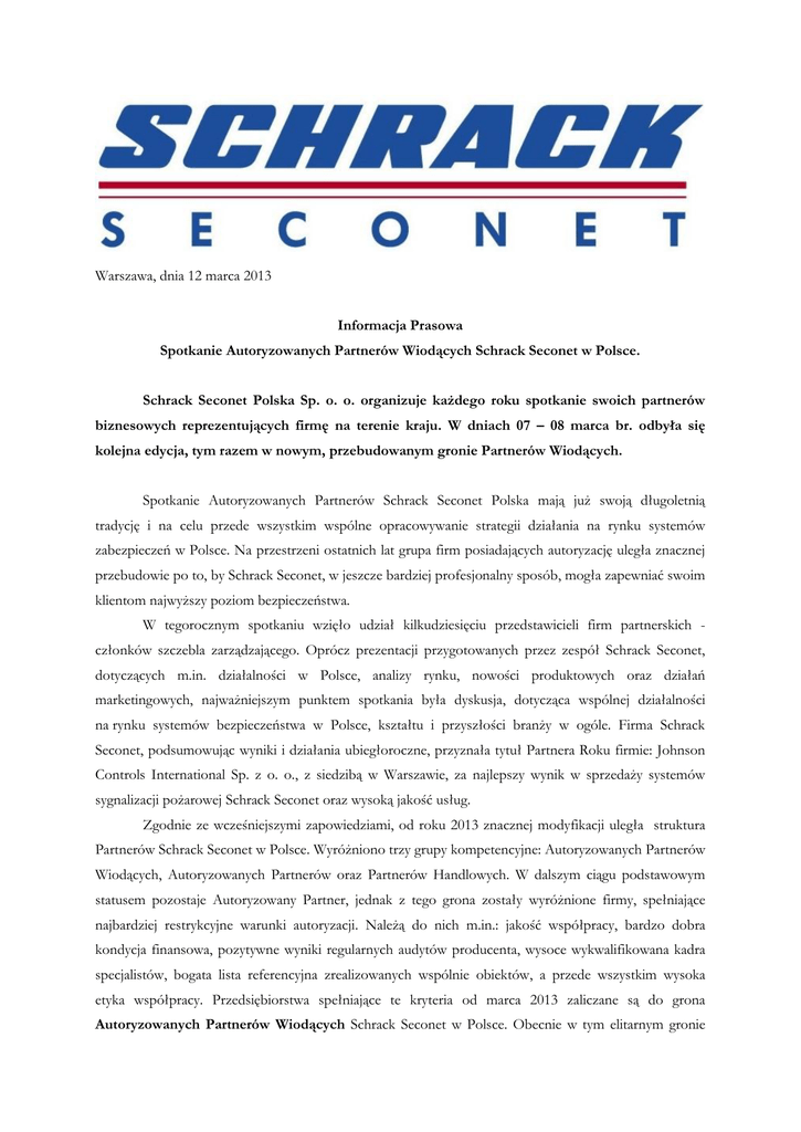 Warszawa, dnia 12 marca 2013 Informacja Prasowa Spotkanie Autoryzowanych Partnerów Wiodących Schrack Seconet w Polsce. Schrack Seconet Polska Sp. o. o. organizuje każdego roku spotkanie swoich partnerów biznesowych reprezentujących firmę na terenie kraju. W dniach 07 – 08 marca br. odbyła się kolejna edycja, tym razem w nowym, przebudowanym gronie Partnerów Wiodących. Spotkanie Autoryzowanych Partnerów Schrack Seconet Polska mają już swoją długoletnią tradycję i na celu przede wszystkim wspólne opracowywanie strategii działania na rynku systemów zabezpieczeń w Polsce. Na przestrzeni ostatnich lat grupa firm posiadających autoryzację uległa znacznej przebudowie po to, by Schrack Seconet, w jeszcze bardziej profesjonalny sposób, mogła zapewniać swoim klientom najwyższy poziom bezpieczeństwa. W tegorocznym spotkaniu wzięło udział kilkudziesięciu przedstawicieli firm partnerskich członków szczebla zarządzającego. Oprócz prezentacji przygotowanych przez zespół Schrack Seconet, dotyczących m.in. działalności w Polsce, analizy rynku, nowości produktowych oraz działań marketingowych, najważniejszym punktem spotkania była dyskusja, dotycząca wspólnej działalności na rynku systemów bezpieczeństwa w Polsce, kształtu i przyszłości branży w ogóle. Firma Schrack Seconet, podsumowując wyniki i działania ubiegłoroczne, przyznała tytuł Partnera Roku firmie: Johnson Controls International Sp. z o. o., z siedzibą w Warszawie, za najlepszy wynik w sprzedaży systemów sygnalizacji pożarowej Schrack Seconet oraz wysoką jakość usług. Zgodnie ze wcześniejszymi zapowiedziami, od roku 2013 znacznej modyfikacji uległa struktura Partnerów Schrack Seconet w Polsce. Wyróżniono trzy grupy kompetencyjne: Autoryzowanych Partnerów Wiodących, Autoryzowanych Partnerów oraz Partnerów Handlowych. W dalszym ciągu podstawowym statusem pozostaje Autoryzowany Partner, jednak z tego grona zostały wyróżnione firmy, spełniające najbardziej restrykcyjne warunki autoryzacji. Należą do nich m.in.: jakość współpracy, bardzo dobra kondycja finansowa, pozytywne wyniki regularnych audytów producenta, wysoce wykwalifikowana kadra specjalistów, bogata lista referencyjna zrealizowanych wspólnie obiektów, a przede wszystkim wysoka etyka współpracy. Przedsiębiorstwa spełniające te kryteria od marca 2013 zaliczane są do grona Autoryzowanych Partnerów Wiodących Schrack Seconet w Polsce. Obecnie w tym elitarnym gronie znalazło się 13 firm partnerskich: Elektro A-Z Sp. z o. o., INSAP Sp. z o. o., Izotop Service Sp. z o. o., PPHU Tel-Poż-System ISKRA Sp. z o. o., Johnson Controls Int. Sp. z o. o., Megasystem Sp. z o. o., NOMA 2 Sp. z o. o., OBIS Cichocki Ślązak s.j., OBIS 2 Andrzej Ślązak s.c., Panorama-SAP Sp. z o. o., RS-System Sp. z o. o., 01 Partner Sp. z o. o. oraz PHU SUPON Sp. z o. o. Do grona Autoryzowanych Partnerów Schrack Seconet w Polsce w roku 2013 dołączyło kolejnych siedem firm, posiadających dotychczas status Partnera Handlowego. Należą do nich: AGIS Fire & Security Sp. z o. o., Alkam System Sp. z o. o., DEKK Fire Solution s.c., Elprotech Systemy Sp. z o. o., JGJ Systemy Sp. z o. o. oraz LVS-Tech Sp. z o. o., oraz SSI SA. Firmy z grona Autoryzowanych Partnerów charakteryzuje również stabilna sytuacja finansowa, wysoka etyka współpracy oraz wykwalifikowani specjaliści. Podobnie jak APW, przedsiębiorstwa te posiadają dostęp do wszelkich szkoleń technicznych, handlowych, wszelkie uprawnienia instalacyjne oraz możliwość bezpośrednich zakupów u producenta. Firmy, które działają na rynku polskim w obszarze profesjonalnych systemów zabezpieczeń, wykazują zainteresowanie współpracą i są zainteresowane znalezieniem się przyszłości w gronie Autoryzowanych Partnerów Schrack Seconet w Polsce, rozpoczynają współpracę od statusu Partnera Handlowego, o ograniczonej autoryzacji (nie posiadają uprawnień producenta do prowadzenia serwisu gwarancyjnego instalacji wykonanych przez innych APW oraz AP). Firmy te biorą udział w procesie autoryzacji, zdobywając doświadczenie w prowadzeniu projektów, instalacji i programowania systemów bezpieczeństwa Schrack Seconet. Szczegóły dotyczące nowej polityki sprzedaży oraz zakresu uprawnień każdej z trzech grup partnerów biznesowych Schrack Seconet w Polsce, zostaną zamieszone na stronie www.schrack-seconet.pl, w portalach branżowych oraz na łamach najbliższych wydań czasopism branżowych. Firma Schrack Seconet jest jednym z największych i najbardziej znanych producentów systemów sygnalizacji pożarowej na świecie. Od wielu lat Schrack Seconet Polska jest liderem na rynku polskim w sprzedaży najnowocześniejszych rozwiązań z dziedziny zabezpieczeń. Na przestrzeni niemal trzydziestu lat działalności Schrack Seconet w Polsce, na liście referencyjnej firmy pojawiło się ponad 2500 obiektów, które zostały wyposażone w całą gamę systemów ochrony ppoż. oraz systemów komunikacji. Należą do nich m.in.: obiekty z sieci hoteli Marriott, Raddisson SAS, Sheraton, Bristol, Intercontinental; obiekty sportowe: Stadion PGE Arena Gdańsk, Stadion „Lech” Poznań, Stadion Wrocław, Stadion Legii Warszawa, Hala Widowiskowo – Sportowa Ergo Arena Gdańsk/Sopot, Hala Widowiskowo – Sportowa Atlas ARENA Łódź, Hala Widowiskowo – Sportowa „SPODEK” Katowice; wysokiej klasy biurowce: Green Corner Warszawa, Green Horizon Łódź, Bussines Garden Warszawa, VINCI Office Center Kraków, The Metropolitan Warszawa, Platinium Business Park Warszawa, Rondo 1 Warszawa, Murawa Office Park Poznań, Office Islands – Centrum Zana Gdańsk; obiekty wojskowe (NATO); lotniska: Okęcie, Balice; Jasionka, Pyrzowice, Lublinek oraz wiele innych obiektów rozmaitego przeznaczenia. Osoby do kontaktu: Marta Nowak – Kierownik ds. Marketingu [email protected]