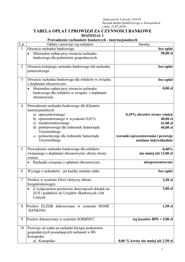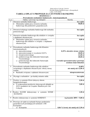 Załącznik do Uchwały 2/44/16 Zarządu Banku Spółdzielczego w Konopiskach. z dnia 23.05.2016r. TABELA OPŁAT I PROWIZJI ZA CZYNNOŚCI BANKOWE ROZDZIAŁ I Prowadzenie rachunków bankowych - instytucjonalnych L.p. Opłaty i prowizje wg rodzajów Stawka 1 Otwarcie rachunku bankowego. Minimalna wpłata przy otwarciu rachunku bankowego dla podmiotów gospodarczych. bez opłat 50,00 zł 2 Otwarcie kolejnego rachunku bankowego lub rachunku pomocniczego. bez opłat 3 Otwarcie rachunku bankowego dla rolników w związku z dopłatami obszarowymi. Minimalna wpłata przy otwarciu rachunku bankowego dla rolników w związku z dopłatami obszarowymi. bez opłat 4 5 Prowadzenie rachunku bankowego dla Klientów instytucjonalnych: a) oprocentowanego b) oprocentowanego w wysokości 0,01% c) nieoprocentowanego d) podstawowego dla Jednostek Samorządu Terytorialnego e) pomocniczego dla Jednostek Samorządu Terytorialnego Prowadzenie rachunku bankowego dla rolników związanego z dopłatami obszarowymi: obroty strony winien. Rachunki związane z opłatami obszarowymi. 6 Wyciągi z rachunków - po każdej zmianie salda. 7 Przelew w systemie Elixir (dotyczy obrotu bezgotówkowego). Z wyłączeniem przelewów dotyczących składek na ZUS i podatków do Urzędów Skarbowych i Izb Celnych. 8 Przelew ELIXIR dokonywany w systemie HOME BANKING 9 Przelew dokonywany w systemie SORBNET. 10 Prowizje od wpłat na rachunki bieżące podmiotów gospodarczych posiadających rachunek w BS Konopiska: a) Konopiska 0,00 zł 0,35% obrotów strony winien 40,00 zł 41,00 zł 40,00 zł warunki oprocentowania i prowizje ustalane indywidualnie 0,40% nie mniej niż 12,00 zł nieoprocentowane bez opłat 2,50 zł 3,00 zł 1,50 zł wg kosztów BPS + 5,00 zł 0,06 % kwoty nie mniej niż 2,50 zł 1 b) Częstochowa c) Blachownia 11 Prowizje od wypłat z rachunków bieżących podmiotów gospodarczych zamawiane przez Klienta: a) powyżej 20.000,00 zł zamawiane do godziny 1200 b) powyżej 20.000,00 zł zamawiane po godzinie 1200 12 Wykorzystanie środków z wpłat bieżących na realizację dyspozycji klienta w formie przelewu „ELIXIR” , w systemie Home-banking, eBankNet, na rachunek do innego banku krajowego na każde rozpoczęte 100.000,zł z wyłączeniem wykorzystania środków wpłat bieżących za zapłatę ZUS i podatków. Za wpłaty bieżące nie uznaje się wpływu środków z tytułu umowy między klientem a Bankiem Spółdzielczym np. z tytułu udzielonego kredytu, zapadłych lokat. 13 Wypłata zasiłku dla: a) GOPS w Konopiskach, b) MOPS w Blachowni. 14 Przelewy wewnętrzne na rachunki prowadzone w BS Konopiska z wyłączeniem zakładanych lokat. 15 Za wydanie potwierdzenia przelewu. 0,06 % kwoty nie mniej niż 2,00 zł 0,06 % kwoty nie mniej niż 2,00 zł 0,05% 0,10% 10,00 zł 1,30 zł* 1,50 zł* *od wypłaconego świadczenia dla jednej osoby 1,00 zł 5,00 zł 16 Za poszukiwanie środków przekazu przychodzącego z zagranicy. 17 Za sporządzanie odpisu wyciągu bankowego. 20,00 zł 18 Za sporządzanie odpisu jednego dowodu do wyciągu. 1,00 zł 19 Za sporządzanie odpisu obrotów na jednym rachunku. 5,00 zł za każde rozpoczęte 10 pozycji, nie więcej niż 25,00 zł 20 Prowizja za likwidację rachunku bankowego: a) gotówkowo b) bezgotówkowo c) likwidacja przed upływem 6 miesięcy od założenia 21 Za wydanie czeku do rachunków bieżących. 22 Zgłoszenie o utracie czeków, blankietów czekowych. 5,00 zł 5,00 zł 5,00 zł 20,00 zł 1,00 zł 50,00 zł 2 23 Opłata za realizację tytułu egzekucyjnego Uwaga! a) Bank za każde przekazanie wyegzekwowanych środków pobiera dodatkowo opłatę zgodną z Rozdziałem I pkt 7. b) Opłata jest pobierana po zakończeniu czynności egzekucyjnych przez Bank. Zasada opisana w ppkt b) dotyczy także sytuacji, w której przed zakończeniem realizacji tytułu egzekucyjnego wpływa do Banku kolejne zajęcie. Opłata jest pobierana oddzielnie od każdego tytułu egzekucyjnego. 24 Przyjęcie i wysłanie listy inkasowej. 0,1% wyegzekwowanych środków min. 10,00 zł max. 200,00 zł 35,00 zł 25 Wysyłanie SMS w systemie JSMS Banking. 0,10 zł za każdy SMS 26 a) Za wydanie zaświadczenia na wniosek klienta Banku, potwierdzającego posiadanie rachunków, wysokości salda, obrotów itp., (czynność wykonywana na rzecz klientów, którym Bank prowadzi rachunek). b) Sporządzenie historii rachunku na wniosek klienta Banku. c) Zwolnione z opłat są: - operacje dotyczące dopisania odsetek - zaświadczenia wydawane na żądanie prokuratury lub sądu. 27 Potwierdzenie wykonania dyspozycji przelewu po dniu jej złożenia. 20,00 zł 30,00 zł +Vat 2,00 zł 10,00 zł 28 Potwierdzenie czeku. 29 Zlecenie stałe z rachunków bieżących. 1,00 zł 30 Polecenie zapłaty z rachunków bieżących. 1,00 zł 31 Wydanie kopii: a) Umowy rachunku. b) Karty wzorów podpisu. 10,00 zł 10,00 zł 32 Blokada środków na rachunku na rzecz innych podmiotów. 33 Niepodjęcie zamówionej uzgodnionym z Bankiem . gotówki 34 Sporządzenie aneksu do umowy rachunku. w terminie 10,00 zł 0,05% 20,00 zł 3 35 Za zmianę pełnomocników i umocowanie nowych pełnomocników. 36 Zmiana karty wzorów podpisu. 2,00 zł 15,00 zł 37 Odwołanie lub aktualizacja polecenia zapłaty. 1,00 zł 38 Odmowa wykonania polecenia zapłaty z tytułu braku środków na rachunku klienta (dłużnika). 5,00 zł 39 Przyjęcie pełnomocnictwa do rachunku dla innego Banku. 50,00 zł 4 Lp. 1 ROZDZIAŁ II Prowadzenie rachunków oszczędnościowo – rozliczeniowych Opłaty i prowizje wg rodzajów Stawka Otwarcie rachunku oszczędnościowo rozliczeniowego. bez opłat Prowizja za prowadzenie rachunku oszczędnościowo – rozliczeniowego pobierana jest co miesiąc z góry do 7 dnia roboczego każdego miesiąca, a przy założeniu ROR za następny miesiąc po wpływie środków. Przelew w systemie Elixir (dotyczy obrotu bezgotówkowego). Z wyłączeniem przelewów dotyczących składek na ZUS i podatków do Urzędów Skarbowych i Izb Celnych. 4,50 z