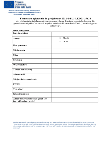 Projekt został zrealizowany przy wsparciu finansowym Komisji Europejskiej w ramach Uczenie się przez całe życie" Formularz zgłoszenia do projektu nr 2012-1-PL1-LEO01-27626 pt.: „Odnawialne źródła energii szansą na pozyskanie dodatkowego źródła dochodu dla gospodarstw wiejskich" w ramach projektu mobilności Leonardo da Vinci „Uczenie się przez całe życie”. Dane kandydata Imię i nazwisko Adres: Miasto Wieś Kod pocztowy Miejscowość Ulica Nr domu Województwo Telefon kontaktowy Adres email Miejsce i data urodzenia PESEL Typ szkoły Klasa i kierunek Adres do korespondencji (jeżeli jest inny niż podany wyżej) Publikacja powstała w wyniku projektu zrealizowanego przy wsparciu finansowym Komisji Europejskiej w ramach programu "Uczenie się przez całe życie". Publikacja odzwierciedla jedynie stanowisko autora. Komisja Europejska ani Narodowa Agencja nie ponoszą odpowiedzialności za umieszczoną w niej zawartość merytoryczną ani za sposób wykorzystania zawartych w niej informacji. Projekt został zrealizowany przy wsparciu finansowym Komisji Europejskiej w ramach Uczenie się przez całe życie" Lp. 1. KRYTERIA WYBORU Oceny z przedmiotów zawodowych uzyskanych w I-ym semestrze 2012/13 2. Ocena z praktyk zawodowych 3. Dodatkowa działalność kandydata na rzecz szkoły (wolontariat, PCK, konkursy itp.) podać konkretnie 4. 5. Sytuacja rodzinna i materialna uczniów potwierdzona przez wychowawcę Ocena z zachowania oraz współpracy w grupie potwierdzona przez wychowawcę w skali punktowej 1- 4 pkt TECHNIK ROLNIK OCENA/PUNKTY UWAGI Produkcja roślinna Produkcja zwierzęca Mechanizacja rolnictwa Ekonomika i zarządzanie przedsiębiorstwem w agrobiznesie Przepisy ruchu drogowego Technika w rolnictwie BHP w rolnictwie Celujacy Bardzo dobry Dobry Dostateczny Dopuszczający Nie wypełniać WYPEŁNIA WYCHOWAWCA Dobra Zła podpis wychowawcy Publikacja powstała w wyniku projektu zrealizowanego przy wsparciu finansowym Komisji Europejskiej w ramach programu "Uczenie się przez całe życie". Publikacja odzwierciedla jedynie stanowisko autora. Komisja Europejska ani Narodowa Agencja nie ponoszą odpowiedzialności za umieszczoną w niej zawartość merytoryczną ani za sposób wykorzystania zawartych w niej informacji. Projekt został zrealizowany przy wsparciu finansowym Komisji Europejskiej w ramach Uczenie się przez całe życie" Lp. 1. KRYTERIA WYBORU Oceny z przedmiotów zawodowych uzyskanych w I-ym semestrze 2012/13 2. Ocena z praktyk zawodowych 3. Dodatkowa działalność kandydata na rzecz szkoły (wolontariat , PCK, konkursy itp.) podać konkretnie 4. 5. Sytuacja rodzinna i materialna uczniów potwierdzona przez wychowawcę Ocena z zachowania oraz współpracy w grupie potwierdzona przez wychowawcę w skali punktowej 1 - 4 pkt TECHNIK HANDLOWIEC OCENA/ PUNKTY UWAGI Ekonomika handlu Podstawy ekonomii Statystyka Rachunkowość handlowa Marketing Towaroznawstwo Elementy prawa Pracownia informatycznohandlowa Język obcy zawodowy Działalność przedsiębiorstwa handlowego BHP w działalności handlowej Prowadzenie sprzedaży Celujacy Bardzo dobry Dobry Dostateczny Dopuszczający Nie wypełniać WYPEŁNIA WYCHOWAWCA Dobra Zła podpis wychowawcy Publikacja powstała w wyniku projektu zrealizowanego przy wsparciu finansowym Komisji Europejskiej w ramach programu "Uczenie się przez całe życie". Publikacja odzwierciedla jedynie stanowisko autora. Komisja Europejska ani Narodowa Agencja nie ponoszą odpowiedzialności za umieszczoną w niej zawartość merytoryczną ani za sposób wykorzystania zawartych w niej informacji. Projekt został zrealizowany przy wsparciu finansowym Komisji Europejskiej w ramach Uczenie się przez całe życie" Lp. KRYTERIA WYBORU 1. Oceny z przedmiotów zawodowych uzyskanych w I-ym semestrze 2012/13 2. Ocena z praktyk zawodowych 3. Dodatkowa działalność kandydata na rzecz szkoły (wolontariat , PCK, konkursy itp.) podać konkretnie 4. 5. Sytuacja rodzinna i materialna uczniów potwierdzona przez wychowawcę Ocena z zachowania oraz współpracy w grupie potwierdzona przez wychowawcę w skali punktowej 1 - 4 pkt TECHNIK TECGNOLOGII ŻYWNOŚCI OCENA/PUNKTY UWAGI Towaroznawstwo spożywcze Technologia żywności Mikrobiologia żywności Maszyny i urządzenia przetwórstwa spożywczego Analiza żywności Działalności przedsiębiorstwa spożywczego Podstawy BHP Podstawy techniki w przemyśle spożywczym Celujacy Bardzo dobry Dobry Dostateczny Dopuszczający Nie wypełniać WYPEŁNIA WYCHOWAWCA Dobra Zła podpis wychowawcy Publikacja powstała w wyniku projektu zrealizowanego przy wsparciu finansowym Komisji Europejskiej w ramach programu "Uczenie się przez całe życie". Publikacja odzwierciedla jedynie stanowisko autora. Komisja Europejska ani Narodowa Agencja nie ponoszą odpowiedzialności za umieszczoną w niej zawartość merytoryczną ani za sposób wykorzystania zawartych w niej informacji.