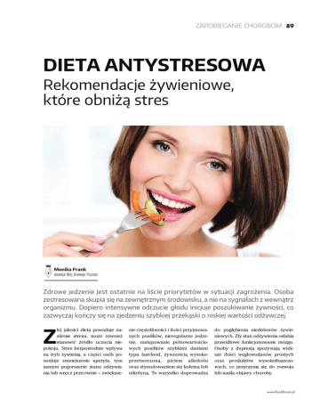 ZAPOBIEGANIE CHOROBOM 89 DIETA ANTYSTRESOWA Rekomendacje ¿ywieniowe, które obni¿¹ stres Monika Frank dietetyk Mój Dietetyk Poznañ Zdrowe jedzenie jest ostatnie na liœcie priorytetów w sytuacji zagro¿enia. Osoba zestresowana skupia siê na zewnêtrznym œrodowisku, a nie na sygna³ach z wewn¹trz organizmu. Dopiero intensywne odczucie g³odu inicjuje poszukiwanie ¿ywnoœci, co zazwyczaj koñczy siê na zjedzeniu szybkiej przek¹ski o niskiej wartoœci od¿ywczej. łej jakości dieta powoduje nasilenie stresu, może również stanowić źródło uczucia niepokoju. Stres bezpośrednio wpływa na tryb żywienia, u części osób powoduje zmniejszenie apetytu, tym samym pogorszenie stanu odżywiania lub wręcz przeciwnie – zwiększe- Z nie częstotliwości i ilości przyjmowanych posiłków, nieregularne jedzenie, zastępowanie pełnowartościowych posiłków szybkimi daniami typu fast-food, żywnością wysokoprzetworzoną, piciem alkoholu oraz stymulowaniem się kofeiną lub nikotyną. To wszystko doprowadza do pogłębienia niedoborów żywieniowych. Zły stan odżywienia osłabia prawidłowe funkcjonowanie mózgu. Osoby z depresją spożywają większe ilości węglowodanów prostych oraz produktów wysokotłuszczowych, co przyczynia się do rozwoju lub nasila objawy choroby. www.food-forum.pl 90 ZAPOBIEGANIE CHOROBOM WPŁYW STRESU NA NASZ ORGANIZM W sytuacji stresowej dochodzi do zmian poziomu hormonów odpowiedzialnych za odpowiedź na bodziec (adrenalina, kortyzol). W momencie zadziałania bodźca w organizmie dochodzi do podniesienia ciśnienia, tętna i napięcia mięśni, a także do zwiększenia poziomu cholesterolu i trójglicerydów oraz lepkości krwi (przeciwdziałania krwotokowi w przypadku obrażeń ciała). Podczas narażenia na stres, zwiększa się tempo metabolizmu oraz stopień przekształcenia zasobów w energię. Im większe zużycie energii przez organizm, tym większe zapotrzebowanie na poszczególne składniki odżywcze: węglowodany, tłuszcze i białko. Dochodzi do wzrostu poziomu cukru oraz wolnych kwasów tłuszczowych we krwi oraz utraty białka (ujemny bilans azotowy). Organizm w stresie wymaga podaży wysokiej jakości żywności, bogatej w składniki odżywcze, zarówno makro, jak i mikroelementów, a nie tylko podaży pustych kalorii. Im wyższe tempo metabolizmu, tym większe zużycie witamin: A, C, D, E, K oraz z grupy B, jak również składników mineralnych: wapnia, fosforu, chromu, selenu, cynku, magnezu. Dlatego R E K L A M A FOOD FORUM 3(9)/2015 Niew³aœciwe zachowania i wybory ¿ywieniowe mog¹ indukowaæ, jak równie¿ nasilaæ stres i niepokój w organizmie. w przypadku złego stanu odżywienia, niedoborów, deficyty tych mikroskładników mogą się pogłębiać. Dlatego tylko pełnowartościowa i odpowiednio zbilansowana dieta jest w stanie zminimalizować niekorzystny wpływ chronicznego stresu na organizm. ZOBACZ 8 BŁĘDÓW, JAKIE POPEŁNIASZ Częste picie kawy – zazwyczaj w celu utrzymania wysokiego stopnia pobudzenia, kawa spożywana jest zamiast pierwszego posiłku. Zbyt wysokie spożycie kawy powoduje dekoncentrację, zmniejszenie efektywności, problemy ze snem, zwiększony poziom kortyzolu ■ we krwi. Kofeina jako psychostymulant nie podnosi bezpośrednio nastroju, zwiększa tylko czasowo wydolność psychofizyczną, zdolność do koncentracji. Natomiast odstawienie kofeiny u osób pijących ją nałogowo, już po pierwszej dobie od odstawienia, powoduje zmęczenie, senność, złość i przygnębienie. ■ Alkohol – w małych dawkach (10–25 g czystego alkoholu na dobę) alkohol łagodzi objawy zmęczenia i poprawia nastrój. Pod warunkiem, że nie jest spożywany w momencie trwania sytuacji stresowej. W takim wypadku wywołuje wyrzut adrenaliny, co skutkuje nerwowością, problemami ze snem, pobudzeniem, a nawet drażliwością skóry. Uważa się, że alkohol w dużych ilościach tylko naśladuje i markuje główne cechy i efekty działania serotoniny. Należy również podkreślić, że alkohol spożywany przez osoby poddane działaniu stresu powoduje zwiększenie depozytu tkanki tłuszczowej w okolicach serca. Stąd już prosta droga do zawału mięśnia sercowego. ■ Spożywanie niskiej jakości produktów żywnościowych – żywności bogatej w cukry proste oraz tłuszcze typu trans. Wahania cukru we krwi, spowodowane niewłaściwym żywieniem powodują: zmęczenie, problemy z koncentracją, ale także zmiany nastroju, a w efekcie długoterminowym nawet hipoglikemię. Powodują również obniżenie odporności organizmu – zwiększenie podatności na infekcje. ■ Brak regularności posiłków – pomijanie śniadań, głodzenie się, spowodowane brakiem czasu na zjedzenie posiłku. ■ Zajadanie stresu – jedzenie w sytuacji stresowej, które nie jest spowodowane rzeczywistym zapotrzebowaniem, czy odczuciem głodu. ■ Nieodpowiednie nawodnienie organizmu – zapominanie o piciu, jak również nieodpowiedni dobór płynów (kawa, napoje słodzone, energetyczne). ■ Jedzenie poza domem – brak czasu na przygotowywanie posiłków. ZAPOBIEGANIE CHOROBOM 91 Diety cud – dążenie do redukcji masy ciała poprzez stosowanie diet o bardzo niskiej podaży energii lub diet monoskładnikowych. ■ WPŁYW ŻYWIENIA NA STRES Długotrwale utrzymujący się stres zwiększa zapotrzebowanie na pełnowartościowe białko. Jego zadaniem jest odbudowa i wzrost tkanek. Podaż aminokwasu, jakim jest tryptofan warunkuje syntezę serotoniny, która ma działanie przeciwbólowe, relaksacyjne, zmniejsza napięcie i podatność na stres oraz melatoniny (hormon snu). Ważna jest również podaż nienasyconych kwasów tłuszczowych, które są zdolne do zmniejszenia nadmiernej krzepliwości krwi (skutek działania adrenaliny). Redukują stan zapalny w organizmie, jak również umożliwiają przewodnictwo neurotransmiter w mózgu. Węglowodany złożone zwiększają produkcję serotoniny i podtrzymują dobry nastrój długotermino