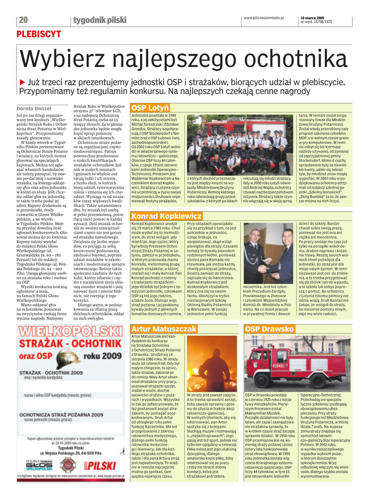 20 www.pila.naszemiasto.pl tygodnik pilski 10 marca 2009 nr wyd. 10/58/1575 PLEBISCYT PLEBISCYT WYDARZENIA Wybierz najlepszego ochotnika b Już trzeci raz prezentujemy jednostki OSP i strażaków, biorących udział w plebiscycie. Przypominamy też regulamin konkursu. Na najlepszych czekają cenne nagrody Dorota Bonzel Już po raz drugi organizowany jest konkurs „Wielkopolski Strażak Roku i Ochotnicza Straż Pożarna w Wielkopolsce”. Przypominamy zasady głosowania. W każdy wtorek w Tygodniku Pilskim prezentowane są Ochotnicze Straże Pożarne i strażacy, na których można głosować na specjalnych kuponach. Można też zgłaszać własnych kandydatów, ale należy pamiętać, by zawsze po-dać imię i nazwisko strażaka, na którego oddajemy głos oraz adres jednostki, w której on służy. Jeśli chcemy oddać głos na jednostkę, to także trzeba podać jej adres. Kupony drukowane są w poniedziałki, środy i czwartki w Głosie Wielkopolskim, a we wtorki w Tygodniku Pilskim. Można przysłać dowolną ilość zgłoszeń konkursowych. Głosować można do 20 kwietnia. Kupony należy wysyłać do redakcji Polski Głosu Wielkopolskiego (ul. Grunwaldzka 19, 60 – 782 Poznań) lub do redakcji Tygodnika Pilskiego (al. Wojska Polskiego 26, 64 – 920 Piła). Uwaga głosujemy osobno na strażaka roku i osobno na OSP. Wyniki konkursu zostaną ogłoszone 4 maja, na łamach Polski Głosu Wielkopolskiego. Warto oddawać głos na ochotników, ponieważ na zwycięzców czekają fantastyczne nagrody. Najlepszy Strażak Roku w Wielkopolsce otrzyma 37’’ telewizor LCD, a na najlepszą Ochotniczą Straż Pożarną czeka aż 15 tysięcy złotych. Za te pieniądze jednostka będzie mogła kupić sprzęt pomocny w akcjach ratunkowych. Ochotnicze straże pożarne są organizacjami często niedocenionymi. Panuje powszechne przekonanie o niskich kwalifikacjach strażaków ochotników. Jednak w małych miastach i gminach to właśnie oni ratują ludzi i ich mienie, a liczba akcji, w których biorą udział, systematycznie rośnie i zmienia się ich charakter. Wymaga to od strażaków coraz większych kwalifikacji. Także ustawodawca dba, by strażak był osobą w pełni przeszkoloną, potrafiącą nieść pomoc w każdej sytuacji. Dziś strażak ochotnik ze swoimi umiejętnościami często nie jest gorszy od strażaka zawodowego. Zwiększa się liczba wyjazdów, co pociąga za sobą konieczność podnoszenia zdolności bojowej, poprzez udział strażaków w szkoleniach i modernizację sprzętu ratowniczego. Rośnie także społeczne zaufanie do tych ludzi, którzy ofiarnie i często z narażeniem życia ubierają mundur strażacki i jadą ratować życie i mienie bliźnich, nie czerpiąc z tego korzyści. Dlatego warto, w podziękowaniu za ofiarną pracę dzielnych ochotników, oddać na nich swój głos. OSP Lotyń Jednostka powstała w 1949 roku, a jej założycielami byli Michał Taraszczuk i Zdzisław Grendus. Strażacy współpracują z OSP Stockelsdorf z Niemiec oraz z OSP Łubowo (woj. zachodniopomorskie). Od 2002 roku OSP Lotyń wchodzi w skład krajowego systemu ratowniczo – gaśniczego. Obecnie OSP liczy 84 członków, z czego 19 jest ratownikami Jednostki Operacyjno – Technicznej. Prezesem jest Waldemar Kopkiewiczm a Naczelnikiem Konrad Kopkiewicz. Strażacy z Lotynia czynnie uczestniczą w życiu swojej miejscowości. Druhowie organizowali festyny strażackie, z których dochód przeznaczany jest między innymi na wyjazdy Młodzieżowej Drużyny Pożarniczej. Remizę każdego roku odwiedzają grupy przedszkolaków, z których po latach rekrutują się młodzi strażacy. Gdy w 2000 roku Lotyń odwiedził Andrzej Wajda, ochotnicy czuwali nad bezpieczeństwem reżysera. Strażacy także czynnie włączają się w akcję sprzą- tania. W remizie został zorganizowany biwak dla Młodzieżowej Drużyny Pożarniczej. Został wtedy przerobiony cały program szkolenia członków MDP, a w wolnym czasie grano w gry komputerowe. W remizie odbył się też kiermasz odzieży używanej, otrzymanej od zaprzyjaźnionej gminy Stockelsdorf. Mimo iż ciuchy sprzedawane były za niewielkie kwoty, udało się zebrać tyle, by młodzież znów mogła wyjechać. W 2003 roku w podziękowaniu ochotnicy otrzymali od redakcji szkolnej gazetki „Szkolny Donosiciel” „Złotą Bombkę” za to, że zawsze można na nich liczyć. naczelnika. Jest też członkiem Prezydium Zarządu Powiatowego w Złotowie i członkiem Wojewódzkiej Komisji ds. Młodzieży w Poznaniu. Na co dzień pracuje w prywatnej firmie i dowozi dzieci do szkoły. Bardzo chwali sobie swoją pracę, ponieważ nie jest ona ani ciężka ani monotonna. Po pracy zostaje mu czas już tylko na porządki wokół domu, drobne naprawy i koszenie trawy. Resztę swoich wolnych chwil poświęca dla jednostki, bo straż jest dla niego całym życiem. W remiziezawsze jest coś do zrobienia, a to trzeba przygotować się do zbiórki lub do wyjazdu, a to szkoła lub sołtys poproszą o pomoc. Bo ochotnicy z Lotynia nikomu pomocy nie odma-wiają. Druh Konrad nie żałuje, że wstąpił do straży, bo niesienie pomocy innym, daje mu wiele radości. Konrad Kopkiewicz Konrad Kopkiewicz urodził się 19 marca 1981 roku. Choć może wydać się to niemożliwym, do straż wstąpił, gdy miał 6 lat. Jego ojciec, który był wtedy Prezesem Ochotniczej Straży Pożarnej w Lotyniu, założył w przedszkolu, w którym pracowała mama Konrada, nieformalną grupę małych strażaków, w której znalazł się i mały Konrad. Pan Konrad pochodzi z rodziny z tradycjami strażackimi – jego dziadek był jednym z założycieli jednostki, członkami OSP są też jego rodzice, a także żona. Dlatego więc straż pożarna i jej problemy bywały jednym z głównych tematów domowych rozmów. Przy obiadach opowiadało się na przykład o tym, co jest potrzebne w jednostce, czego brakuje, co zorganizować, skąd wziąć pieniądze dla straży. Czasami tematy te bywały powodem
