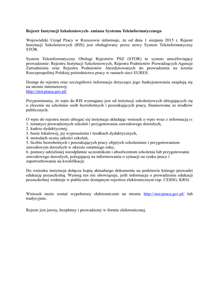 Rejestr Instytucji Szkoleniowych- zmiana Systemu Teleinformatycznego Wojewódzki Urząd Pracy w Rzeszowie informuje, że od dnia 1 sierpnia 2015 r. Rejestr Instytucji Szkoleniowych (RIS) jest obsługiwany przez nowy System Teleinformatyczny STOR. System Teleinformatyczny Obsługi Rejestrów PSZ (STOR) to system umożliwiający prowadzenie: Rejestru Instytucji Szkoleniowych, Rejestru Podmiotów Prowadzących Agencje Zatrudnienia oraz Rejestru Podmiotów Akredytowanych do prowadzenia na terenie Rzeczpospolitej Polskiej pośrednictwa pracy w ramach sieci EURES. Dostęp do rejestru oraz szczegółowe informacje dotyczące jego funkcjonowania znajdują się na stronie internetowej: http://stor.praca.gov.pl/ Przypominamy, że wpis do RIS wymagany jest od instytucji szkoleniowych ubiegających się o zlecenie na szkolenie osób bezrobotnych i poszukujących pracy, finansowane ze środków publicznych. O wpis do rejestru może ubiegać się instytucja składając wniosek o wpis wraz z informacją o: 1. tematyce prowadzonych szkoleń i przygotowania zawodowego dorosłych, 2. kadrze dydaktycznej, 3. bazie lokalowej, jej wyposażeniu i środkach dydaktycznych, 4. metodach oceny jakości szkoleń, 5. liczbie bezrobotnych i poszukujących pracy objętych szkoleniami i przygotowaniem zawodowym dorosłych w okresie ostatniego roku, 6. pomocy udzielonej nieodpłatnie uczestnikom i absolwentom szkolenia lub przygotowania zawodowego dorosłych, polegającej na informowaniu o sytuacji na rynku pracy i zapotrzebowaniu na kwalifikacje Do wniosku instytucja dołącza kopię aktualnego dokumentu na podstawie którego prowadzi edukację pozaszkolną. Wymóg ten nie obowiązuje, jeśli informacja o prowadzeniu edukacji pozaszkolnej widnieje w publicznie dostępnym rejestrze elektronicznym (np. CEIDG, KRS) Wniosek może zostać wypełniony elektronicznie na stronie http://stor.praca.gov.pl/ lub tradycyjnie. Rejestr jest jawny, bezpłatny i prowadzony w formie elektronicznej.