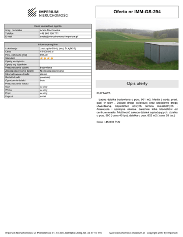 Oferta nr IMM-GS-294 Dane kontaktowe agenta Imię i nazwisko Telefon E-mail Aneta Machowska +48 660 126 771 [email protected] Informacje ogólne Lokalizacja Cena Pow. całkowita [m2] Standard Opłaty w czynszu Opłaty wg liczników Przeznaczenie działki Zagospodarowanie działki Ukształtowanie działki Kształt działki Ogrodzenie działki Przeznaczenie lokalu Gaz Woda Prąd Dojazd Jastrzębie-Zdrój, (woj. ŚLĄSKIE) 45 000,00 zł 901,00 budowlana Niezagospodarowana płaska prostokąt brak w ulicy w ulicy w ulicy asfalt Opis oferty RUPTAWA Ładna działka budowlana o pow. 901 m2. Media ( woda, prąd, gaz) w ulicy . Dojazd drogą asfaltową oraz częściowo drogą utwardzoną. Sąsiedztwo nowych domów mieszkalnych . Atrakcyjna i spokojna okolica. Zaledwie kilka kilometrów od centrum miasta. Możliwość zakupu działek sąsiadujących: działka o pow. 900 ( cena 45 tys), działka o pow. 802 m2 ( cena 59 tys.) Cena : 45 000 PLN Imperium Nieruchomości, ul. Podhalańska 31, 44-335 Jastrzębie-Zdrój, tel. 32 47 10 115 www.nieruchomosci-imperium.pl Copyright 2017 by Imperium