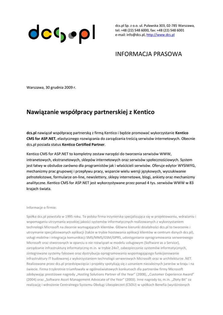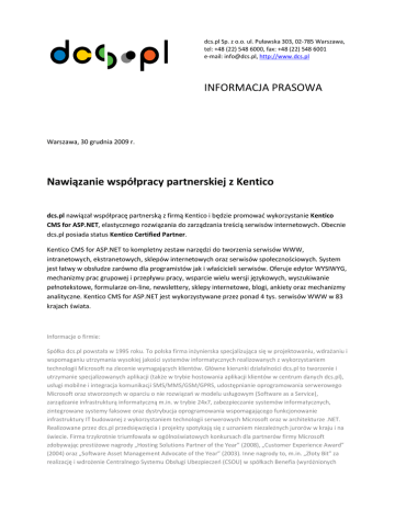 dcs.pl Sp. z o.o. ul. Puławska 303, 02-785 Warszawa, tel: +48 (22) 548 6000, fax: +48 (22) 548 6001 e-mail: [email protected], http://www.dcs.pl INFORMACJA PRASOWA Warszawa, 30 grudnia 2009 r. Nawiązanie współpracy partnerskiej z Kentico dcs.pl nawiązał współpracę partnerską z firmą Kentico i będzie promować wykorzystanie Kentico CMS for ASP.NET, elastycznego rozwiązania do zarządzania treścią serwisów internetowych. Obecnie dcs.pl posiada status Kentico Certified Partner. Kentico CMS for ASP.NET to kompletny zestaw narzędzi do tworzenia serwisów WWW, intranetowych, ekstranetowych, sklepów internetowych oraz serwisów społecznościowych. System jest łatwy w obsłudze zarówno dla programistów jak i właścicieli serwisów. Oferuje edytor WYSIWYG, mechanizmy prac grupowej i przepływu pracy, wsparcie wielu wersji językowych, wyszukiwanie pełnotekstowe, formularze on-line, newslettery, sklepy internetowe, blogi, ankiety oraz mechanizmy analityczne. Kentico CMS for ASP.NET jest wykorzystywane przez ponad 4 tys. serwisów WWW w 83 krajach świata. Informacje o firmie: Spółka dcs.pl powstała w 1995 roku. To polska firma inżynierska specjalizująca się w projektowaniu, wdrażaniu i wspomaganiu utrzymania wysokiej jakości systemów informatycznych realizowanych z wykorzystaniem technologii Microsoft na zlecenie wymagających klientów. Główne kierunki działalności dcs.pl to tworzenie i utrzymanie specjalizowanych aplikacji (także w trybie hostowania aplikacji klientów w centrum danych dcs.pl), usługi mobilne i integracja komunikacji SMS/MMS/GSM/GPRS, udostępnianie oprogramowania serwerowego Microsoft oraz stworzonych w oparciu o nie rozwiązań w modelu usługowym (Software as a Service), zarządzanie infrastrukturą informatyczną m.in. w trybie 24x7, zabezpieczanie systemów informatycznych, zintegrowane systemy faksowe oraz dystrybucja oprogramowania wspomagającego funkcjonowanie infrastruktury IT budowanej z wykorzystaniem technologii serwerowych Microsoft oraz w architekturze .NET. Realizowane przez dcs.pl przedsięwzięcia i projekty spotykają się z uznaniem niezależnych jurorów w kraju i na świecie. Firma trzykrotnie triumfowała w ogólnoświatowych konkursach dla partnerów firmy Microsoft zdobywając prestiżowe nagrody „Hosting Solutions Partner of the Year” (2008), „Customer Experience Award” (2004) oraz „Software Asset Management Advocate of the Year” (2003). Inne nagrody to, m.in. „Złoty Bit” za realizację i wdrożenie Centralnego Systemu Obsługi Ubezpieczeń (CSOU) w spółkach Benefia (wyróżnionych tytułem „Lidera Informatyki 2005”), „Certyfikat Telekomunikacyjny Wprost 2004” dla autorskiej platformy komunikacyjnej Applan Communications Platform oraz „TMT Mobile Award 2005” dla Internetowego Serwisu Konfiguracyjnego. Spółka dcs.pl znalazła się również wśród firm wyróżnionych prestiżowym tytułem "Gazela Biznesu 2003" oraz "Gazela Biznesu 2007" nadawanym przedsiębiorstwom, które dynamicznie się rozwijają, osiągają bardzo dobre wyniki finansowe oraz są rzetelnymi partnerami biznesowymi. Dodatkowe informacje: http://www.dcs.pl