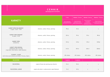 CENNIK obowiązuje od 01.09.2015 KARNETY 1 m-c Umowa 3 m-ce Umowa 6 m-cy Umowa 12 m-cy brak możliwości zawieszenia karnetu 2 tyg zawieszenia konsultacja trenera analiza sprawnościowa 4 tyg zawieszenia 2x analiza sprawnościowa z konsultacją trenera 8 tyg zawieszenia 4 x analiza sprawnościowa z konsultacją trenera KARNET OPEN POŁUDNIOWY w godz. 12:00 - 17:00 siłownia, cardio, fitness, spinning 79 zl 59 zł x x KARNET OPEN PORANNY do godz. 15:00 siłownia, cardio, fitness, spinning 109 zł 99 zł 99 zł 99 zł KARNET OPEN całodzienny siłownia, cardio, fitness, spinning 159 zł 149 zł 139 zł 129 zł KARNET OPEN RODZINA całodzienny dla 2-ch osób (mąż-żona, brat-siostra, rodzic-dziecko) siłownia, cardio, fitness, spinning 310 zł 295 zł 260 zł 220 zł STUDENT / UCZEŃ do 26 roku życia (dotyczy karnetów: Poranny, Open) siłownia, cardio, fitness, spinning 20% rabatu 20% rabatu 20% rabatu 20% rabatu 1 wejście 4 wejścia WEJŚCIÓWKI WEJŚCIÓWKA zajęcia fitness lub spinning oraz silownia 25 zł 90 zł x x WEJŚCIÓWKA JUNIOR zajęcia dla dzieci z wykluczeniem zajęć Robotyki 15 zł 40 zł x x